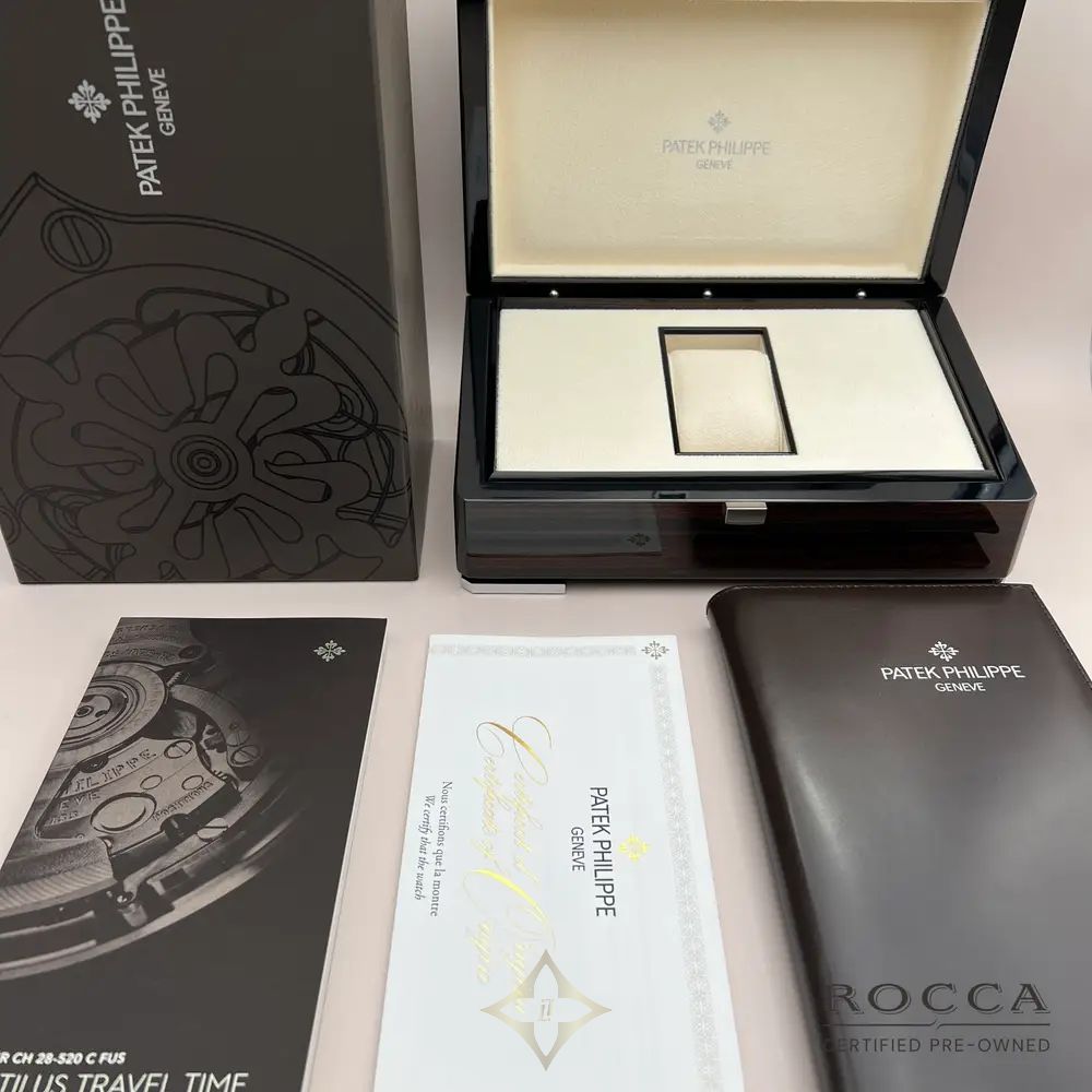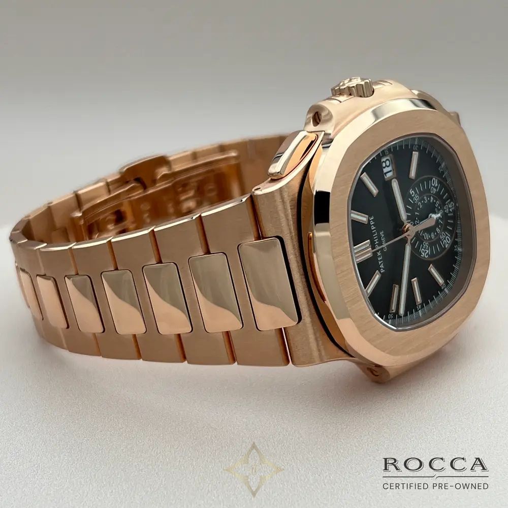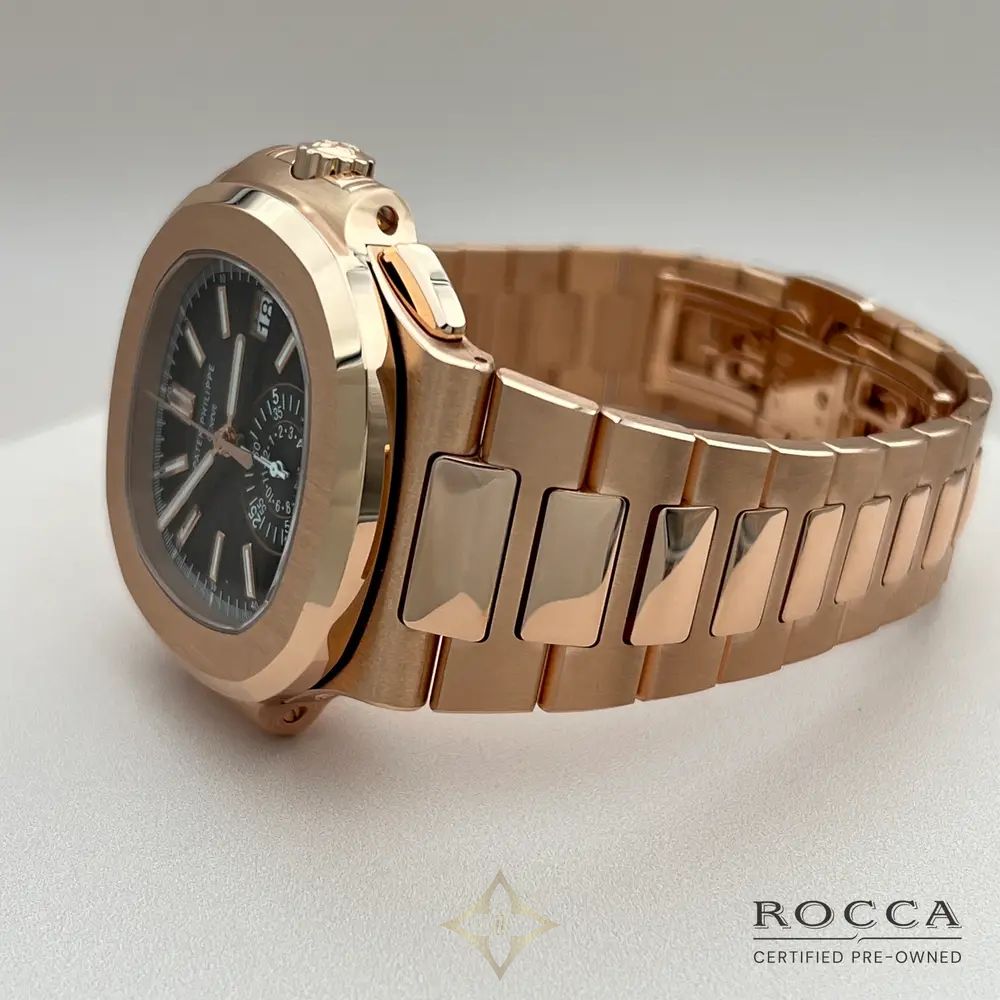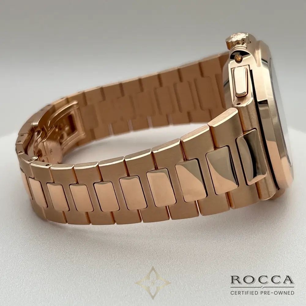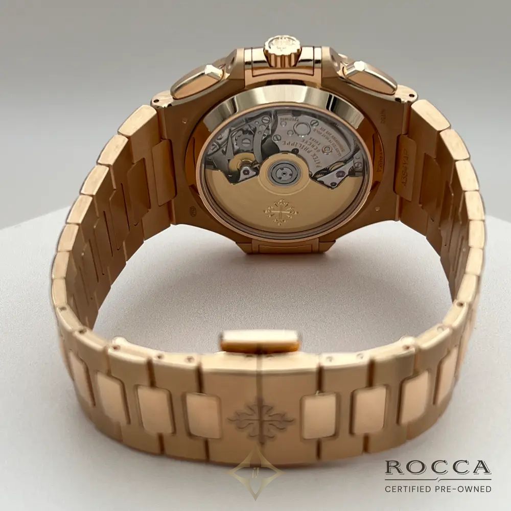 The Patek Philippe Nautilus 5980/1R, with a case and bracelet entirely in 18-carat rose gold, represents one of the most luxurious and refined expressions of the renowned Nautilus collection, first launched in 1976. The 40.5 mm rose gold case is paired with a gradient brown dial featuring a sophisticated sunburst effect. The chronograph is equipped with a single sub-dial positioned at 6 o'clock, maintaining the aesthetic balance and clean design of the dial. The 18-carat rose gold bracelet, with satin-finished links and polished edges, is perfectly integrated with the case, accentuating the elegance and luxury of this model. At the heart of the 5980/1R beats the CH 28-520 C caliber, an automatic chronograph movement that offers precision, reliability, and a power reserve of around 55 hours. The movement is visible through the sapphire crystal case back, showcasing the impeccable finishing and extraordinary craftsmanship of Patek Philippe. The Patek Philippe Nautilus 5980/1R in this configuration was discontinued in 2024, making it even more exclusive and sought after among collectors.