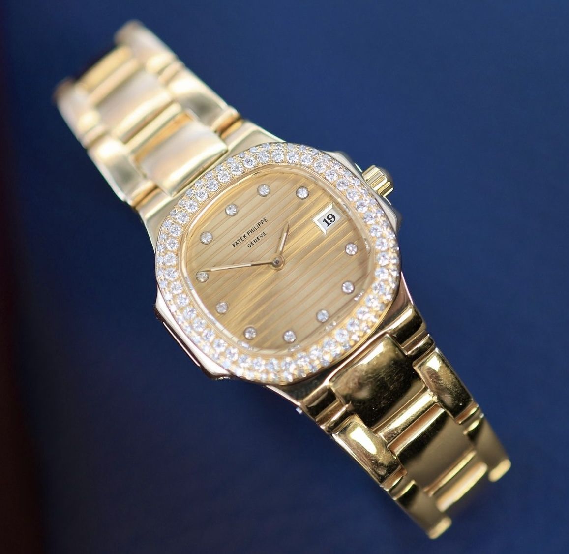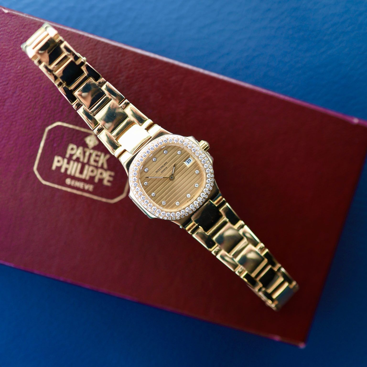 Ref. 4700 was introduced in 1981 as the first official ladies' model of the Nautilus line. The design is based on Gerald Genta's original ‘Jumbo’, but on a much smaller scale. The case measures only 27mm. It is a very flat watch, which makes it extremely comfortable. The case and bracelet are made of 18-carat yellow gold. The bezel is fully set with diamonds (factory set). The watch features a classic Nautilus dial with horizontal ribs. The hour markers are also set with diamonds. The watch is powered by a quartz movement. Supplied on an integrated bracelet in very good condition.