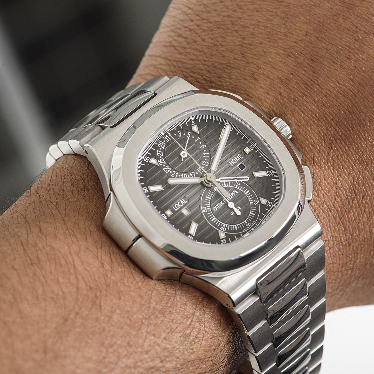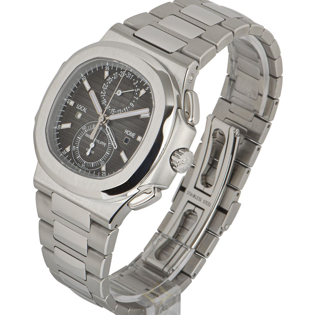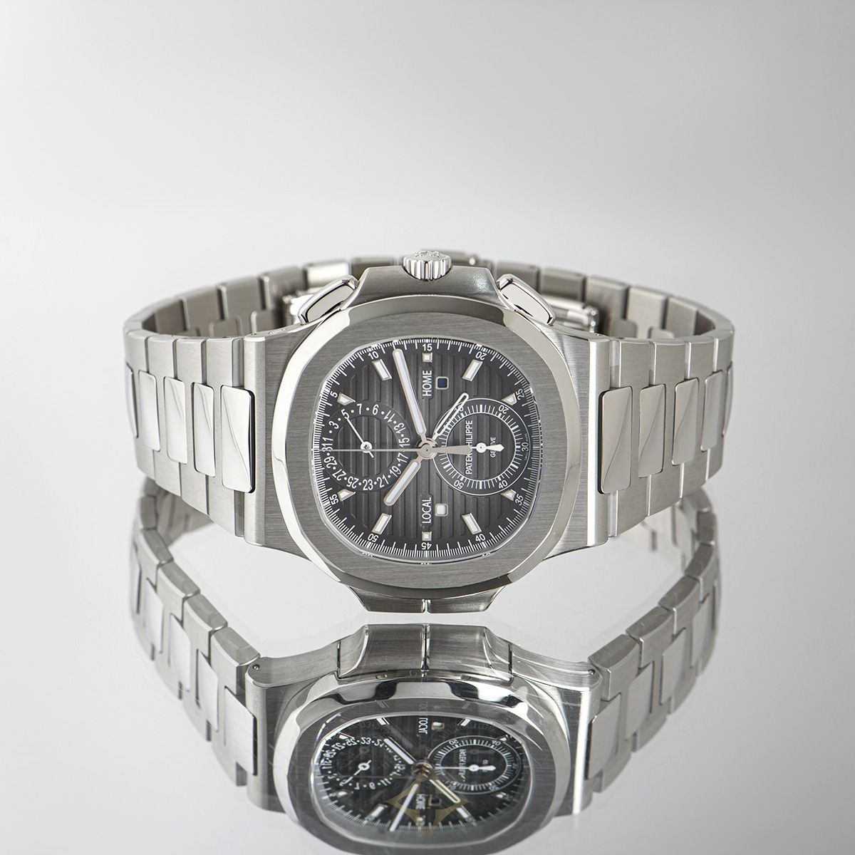 A now discontinued model, this Nautilus Travel Time in stainless steel by Patek Philippe is in unworn NOS condition. Featuring a black gradated horizontally embossed dial that features a 60 minute counter, a date display and local/home time with day/night indication in the apertures.