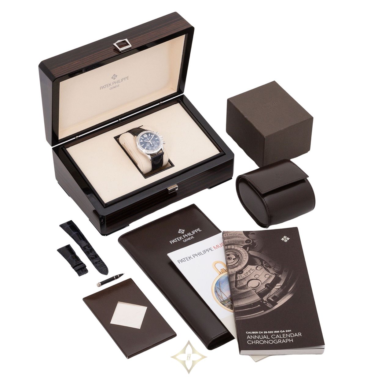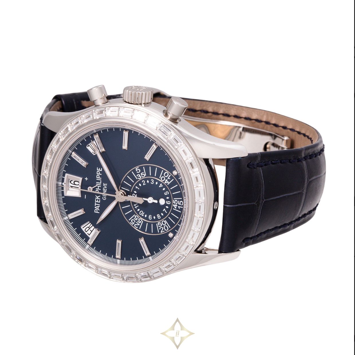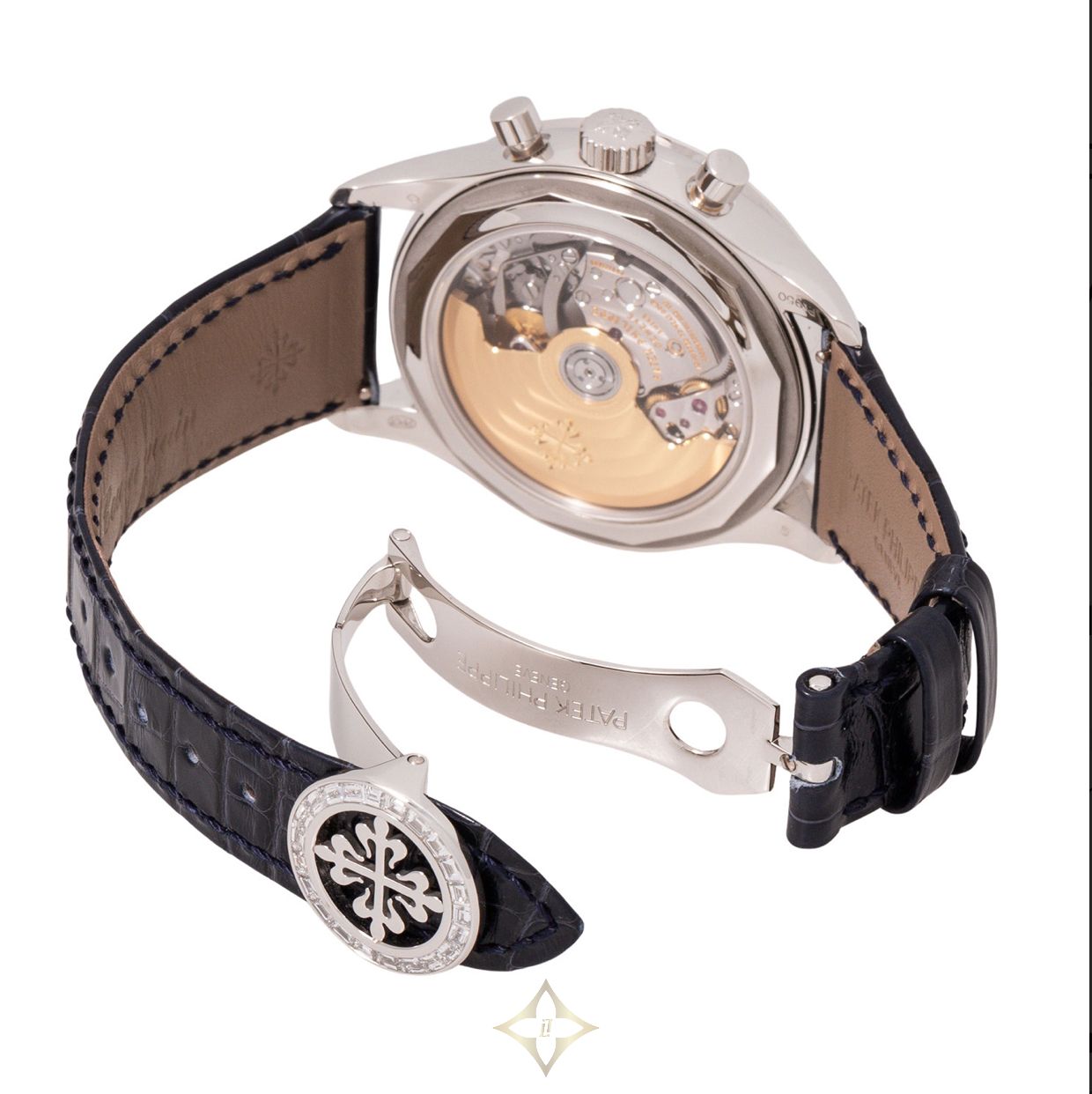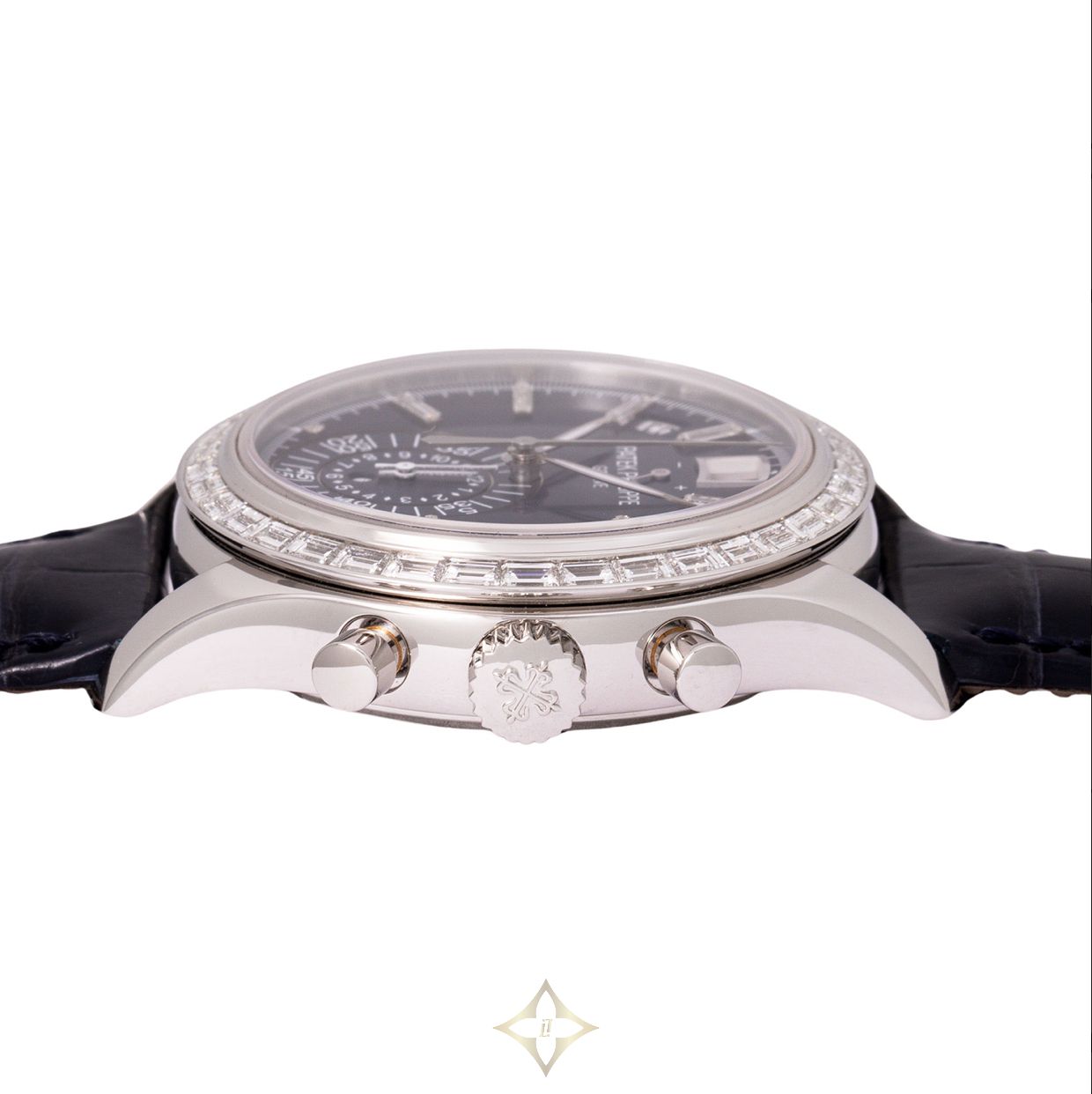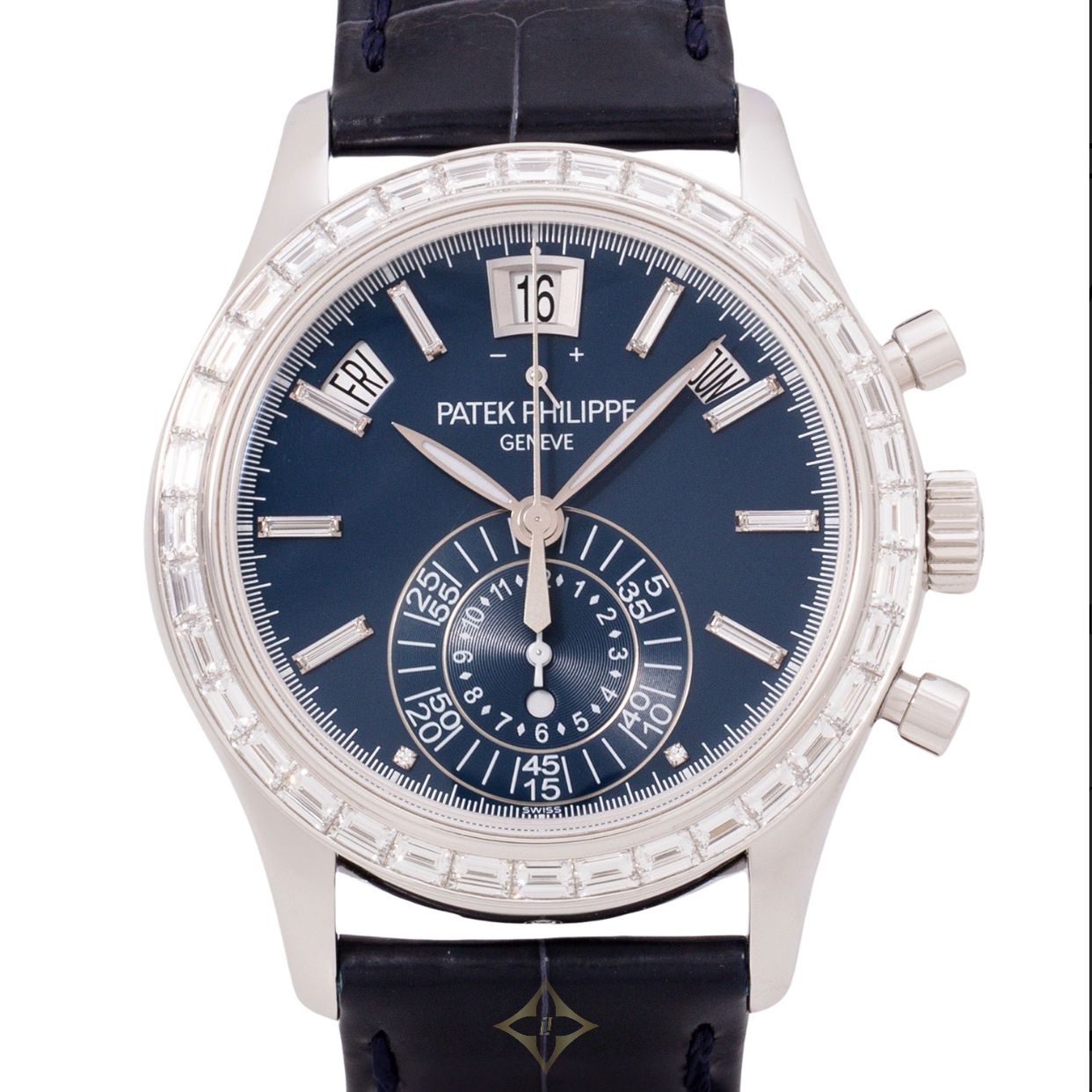 PATEK PHILIPPE Ref. 5961P-001 'Flyback' men's chronograph. Box and papers. Item number: 1127480 PRICE: 145.600,00 € PATEK PHILIPPE Ref. 5961P-001 'Flyback' men's chronograph.. Box and papers. Platinum 950. sapphire crystal back. The case is set with a diamond (0.018 ct.). Automatic movement cal. CH 28-520 IRM QA 24 with very good performance (+4 s/d. 295°). Blue dial with 8 baguette diamond indices (approx. 0.23 ct.), annual calendar with date-day-month display. Flyback chronograph. The bezel is set with 36 baguette diamonds (approx. 3.48 ct.). Original leather wristband with folding clasp in platinum 950 and set with 22 baguette diamonds (approx. 0.97 ct.). Mint condition. Original box, additional travel case, an additional original Patek Philippe leather wristband, leather folder, Patek Philippe Museum brochure, microfibre cloth, instructions and guarantee certificate enclosed. Purchased in Germany in 2023. Diameter approx. 40 mm without crown. Fits up to approx. 17.5 cm wrist size. Model: Flyback Movement: Automatic Alloy: Platinum 950 Condition: As good as new/ unworn Reference number: 5961P-001 Diameter: 40 Scope of delivery: Box and papers Gender: Men's rooms Bracelet: Leather Location: Eppli Jeweler Measurement in mm: 49×40×13 EPPLI Phone: +49 711 997 008 160 Email: info@eppli.com Locations Stuttgart