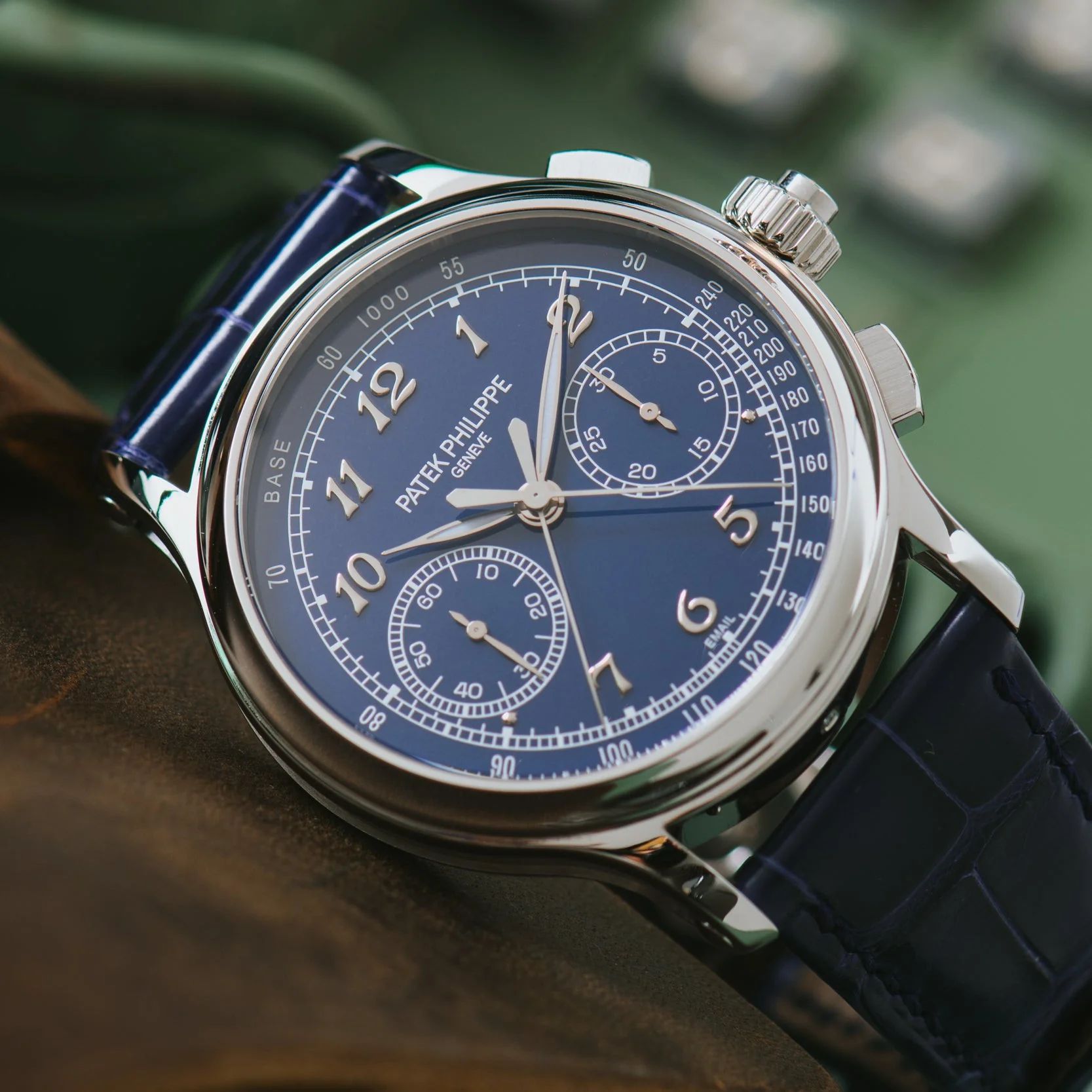 What we have here is one of Patek's most beautiful split chronos, the mammoth Reference 5370P. With a stunning blue enamel dial, applied white gold Breguet numerals, a gorgeous calibre CHR 29-535 PS manually wound chrono movement, and an integrated split mechanism in the crown, this piece is one of the most attractive modern Patek pieces in the lineup.