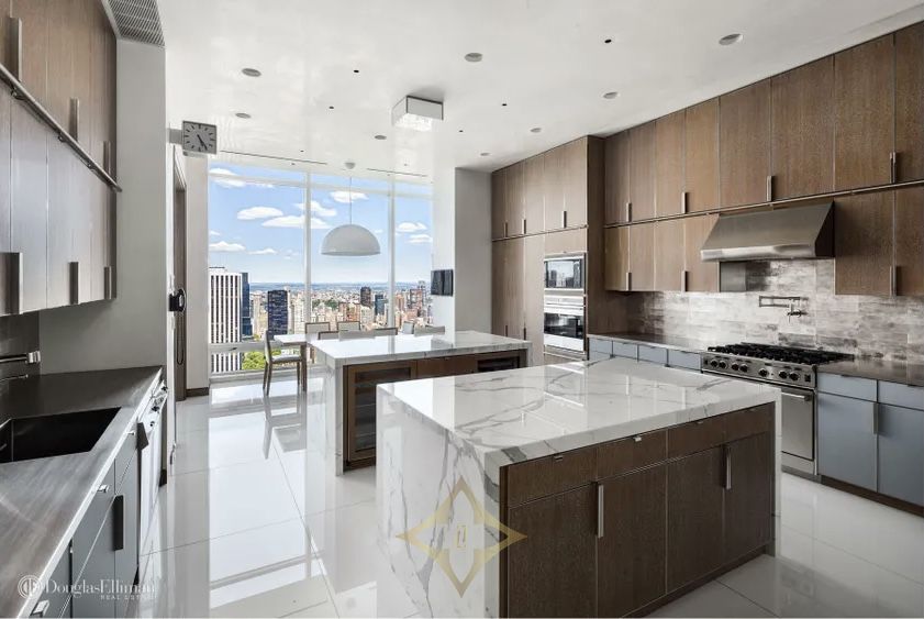 The grand corner living room has views west and north including a spectacular vista of Central Park, and access to the north terrace. The adjacent bar area is perfectly suited for great entertaining. The onyx powder room is breathtaking. A wide hallway leads to the equally grand formal dining room with majestic views west and south including the iconic Empire State and the Chrysler Buildings. It is crowned with an incredible custom crystal chandelier and a glass temperature controlled and humidified wine display case spanning the entire length of the room. The true restaurant quality eat-in kitchen has 2 magnificent marble islands and a dining area overlooking the city. This wing of the apartment also has a beautifully appointed media room.