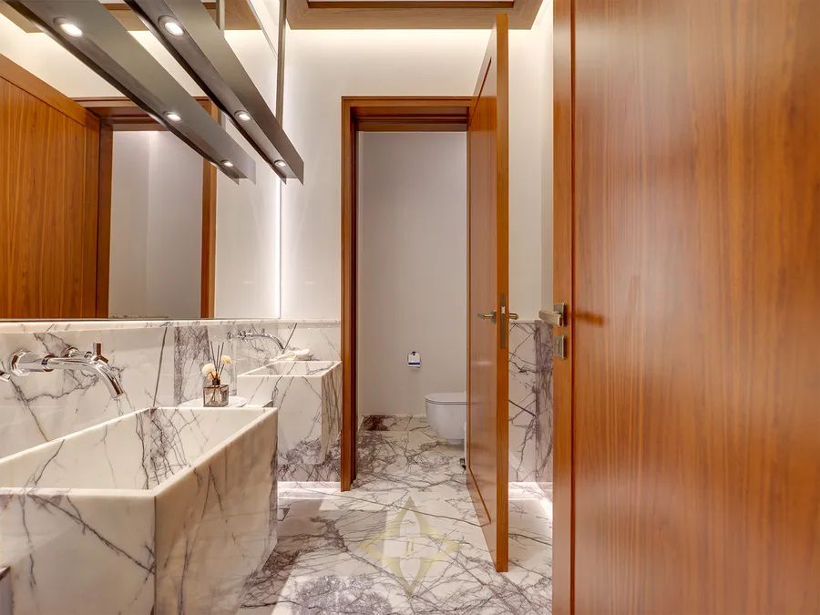 - Marble bathrooms with chevron stone flooring