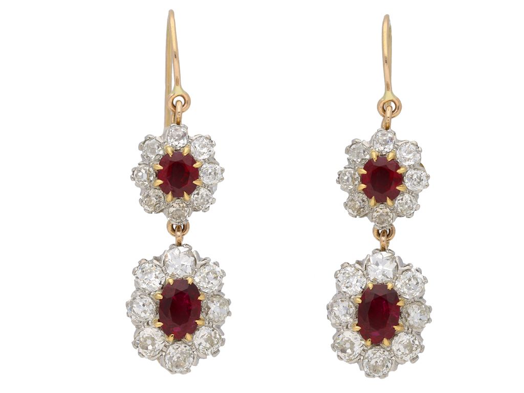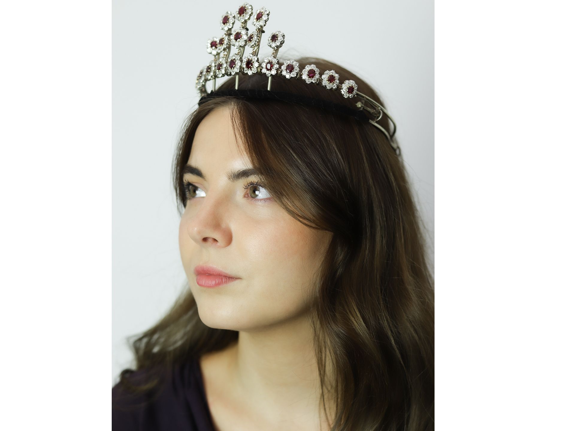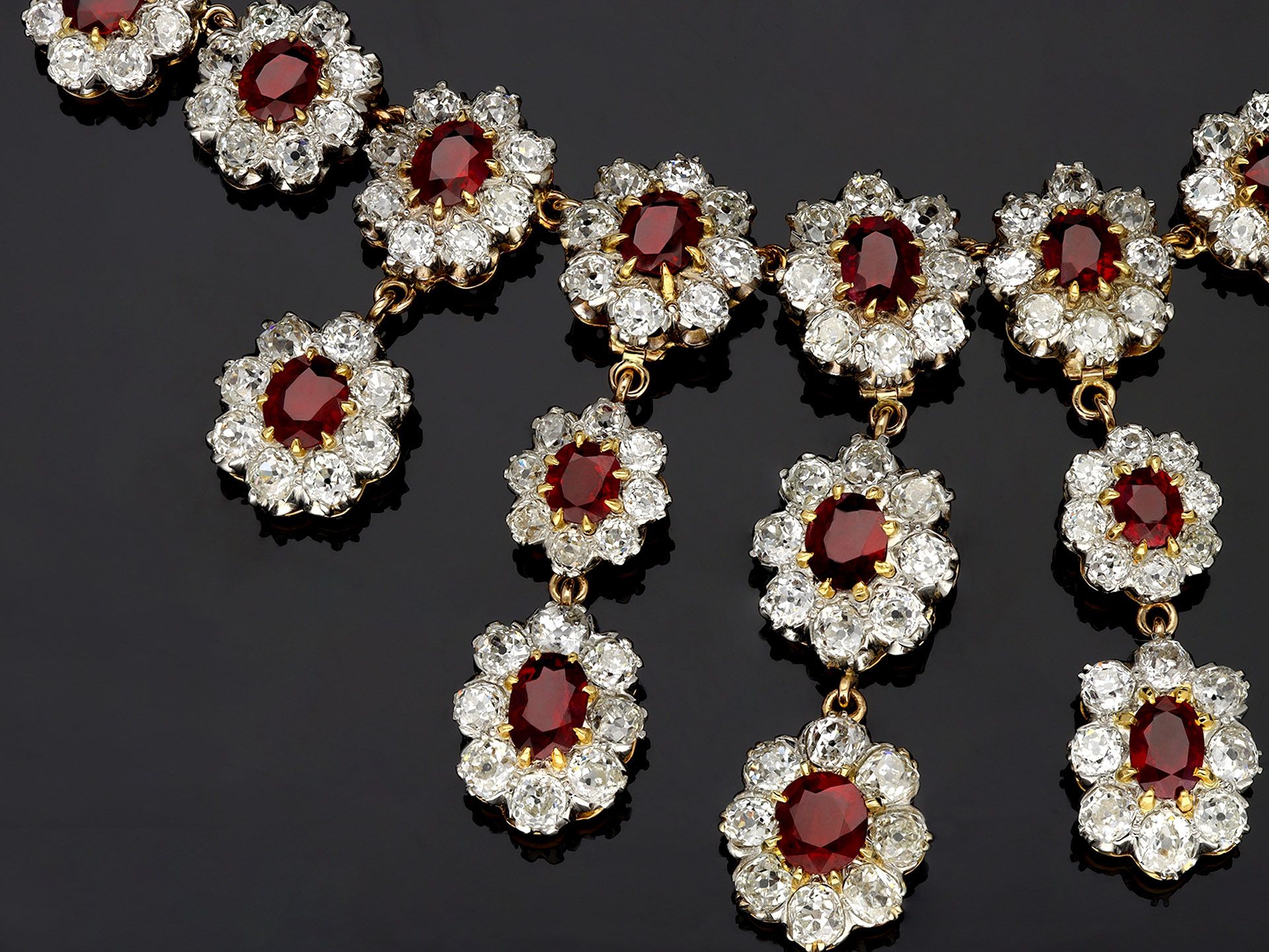 Pigeon's blood Burmese ruby and diamond necklace/tiara. Set to the centre with twenty six oval old cut natural no heat Pigeon's blood Burmese rubies in open back claw settings, ranging from largest with a weight of 1.70 carats to smallest with a weight of 1.02