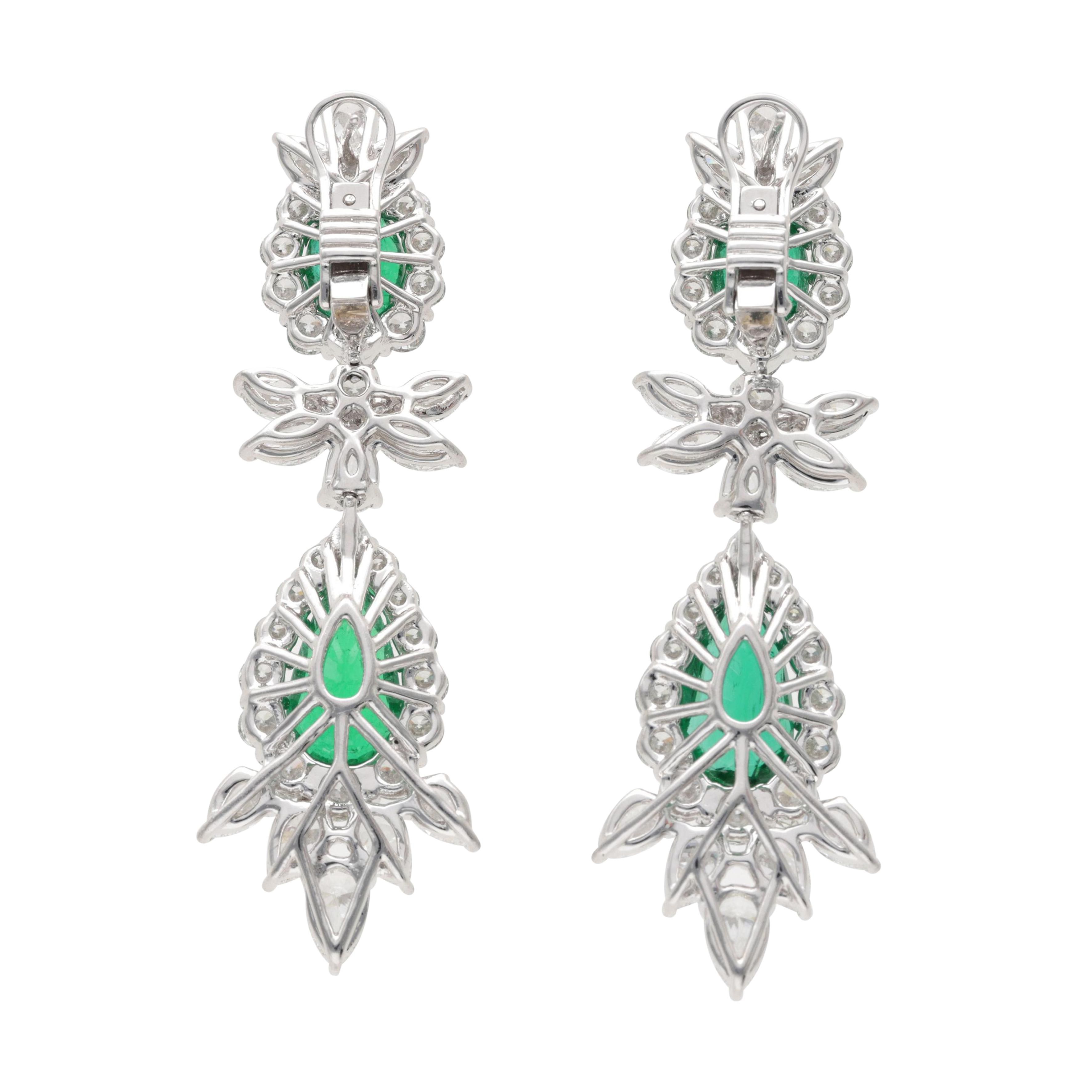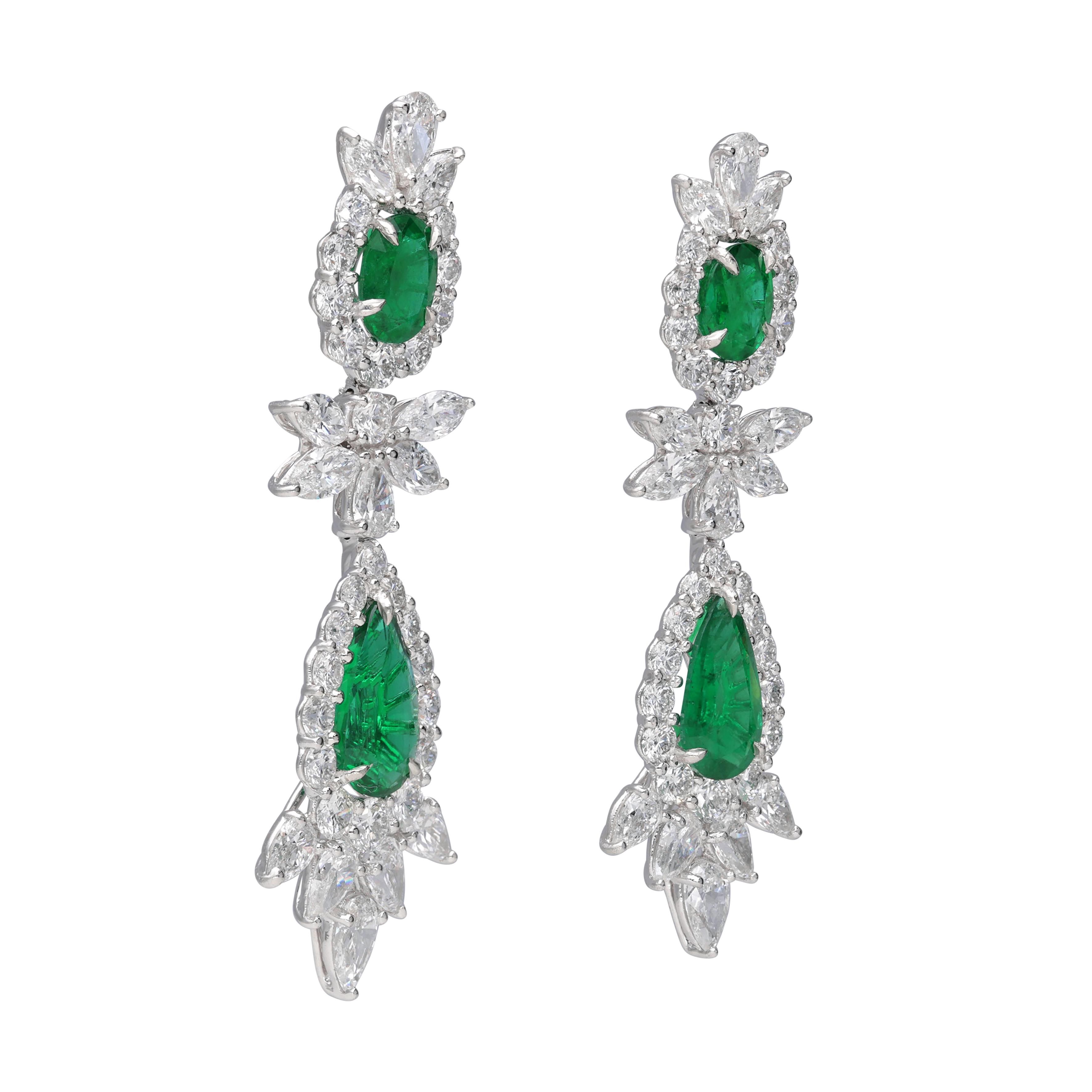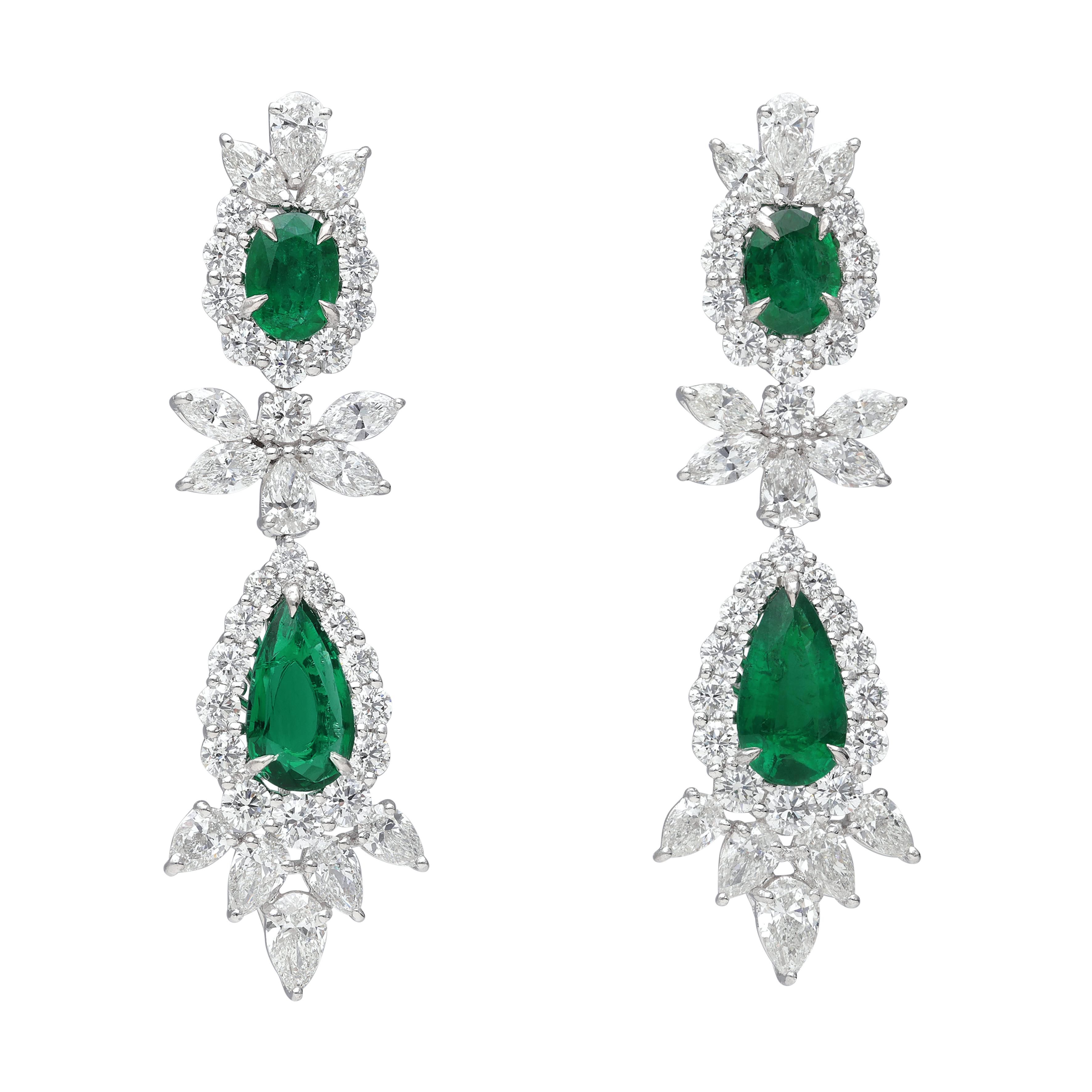 Composed of pear and oval Zambian emeralds, accented by round, pear and marquise-shaped diamonds.