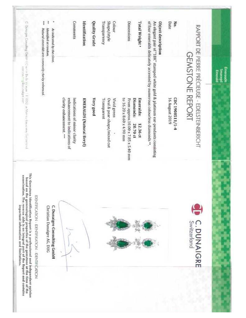 Accompanied by C. Dunaigre report no. CDC 1908511/1-4, dated 16 August 2019, stating that the 12.36 carats of emeralds are of Zambian origin and show indications of minor clarity enhancement to indications of clarity enhancement