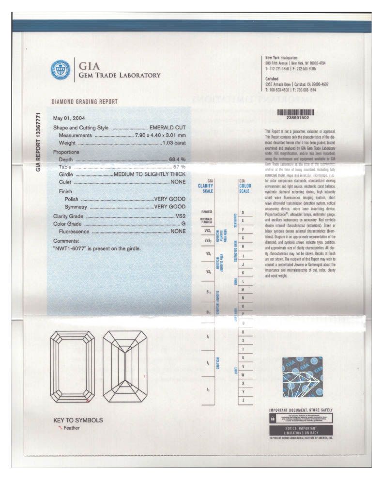 Accompanied by GIA report no. 13367771, dated 1 May 2004, stating that the 1.03 carat diamond is G color and VS2 clarity with No Fluorescence