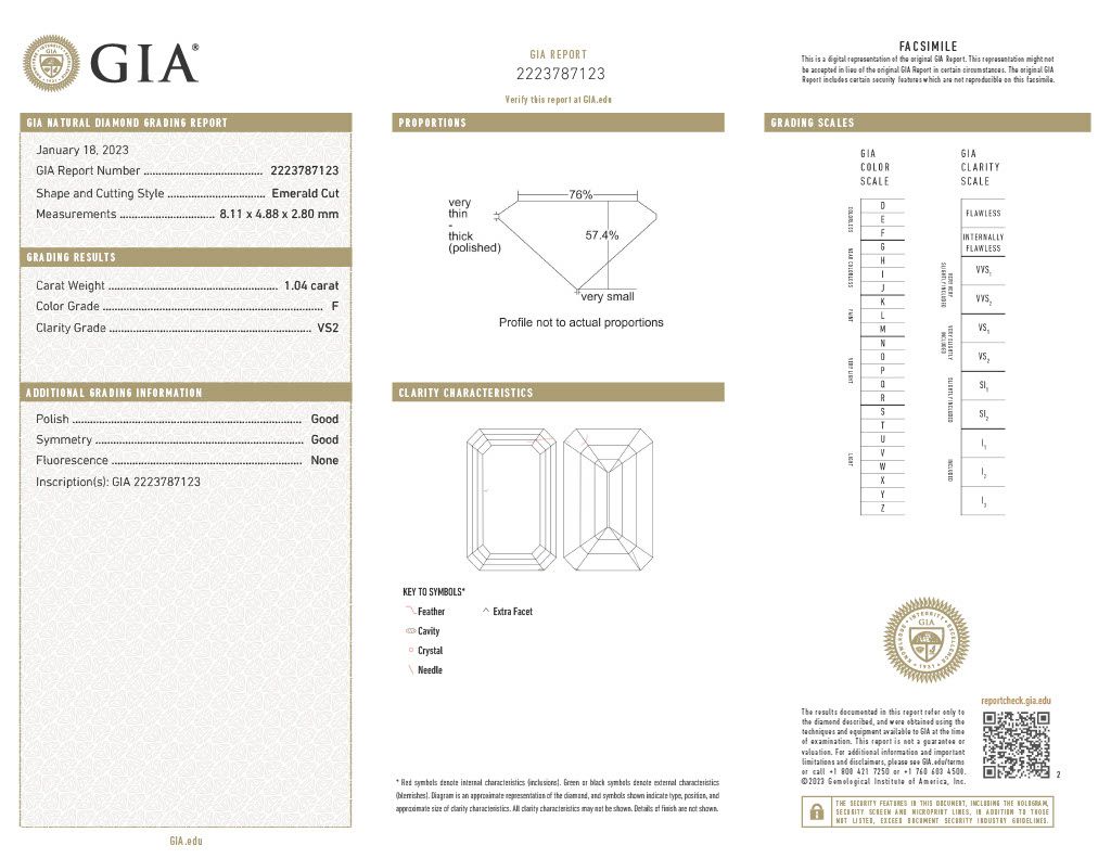 Accompanied by GIA report no. 2223787123, dated 18 January 2023, stating that the 1.04 carat diamond is F color and VS2 clarity with No Fluorescence