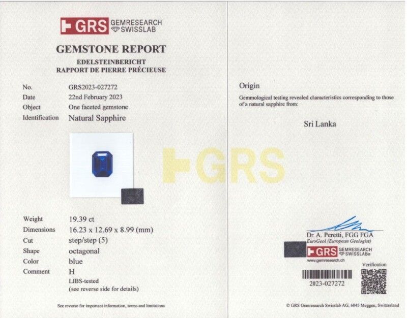 Accompanied by GRS report no. GRS2023-027272, dated 22 February 2023, stating that the 19.39 carat sapphire is Sri Lankan (Ceylon) origin and heated