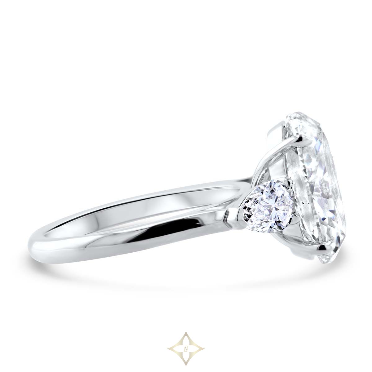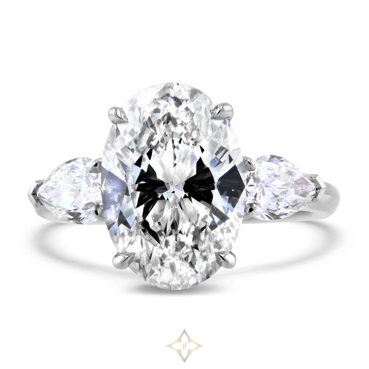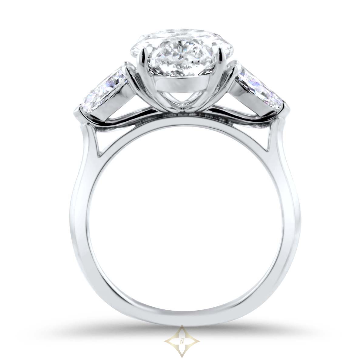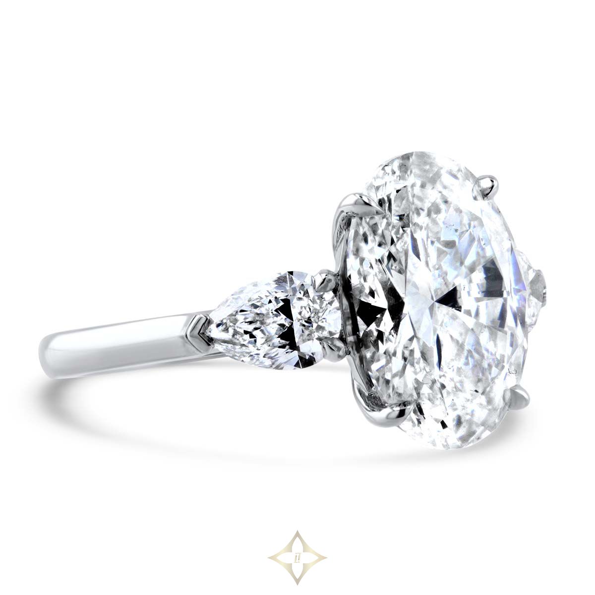 This show-stopping ring features a 4.00ct oval Diamond to the centre, in a modern four claw setting. Each side of the principal Diamond is a pear-shape Diamond weighing 0.40ct in a three claw setting, crafted in Platinum, bringing the total Diamond weight to 4.80ct.