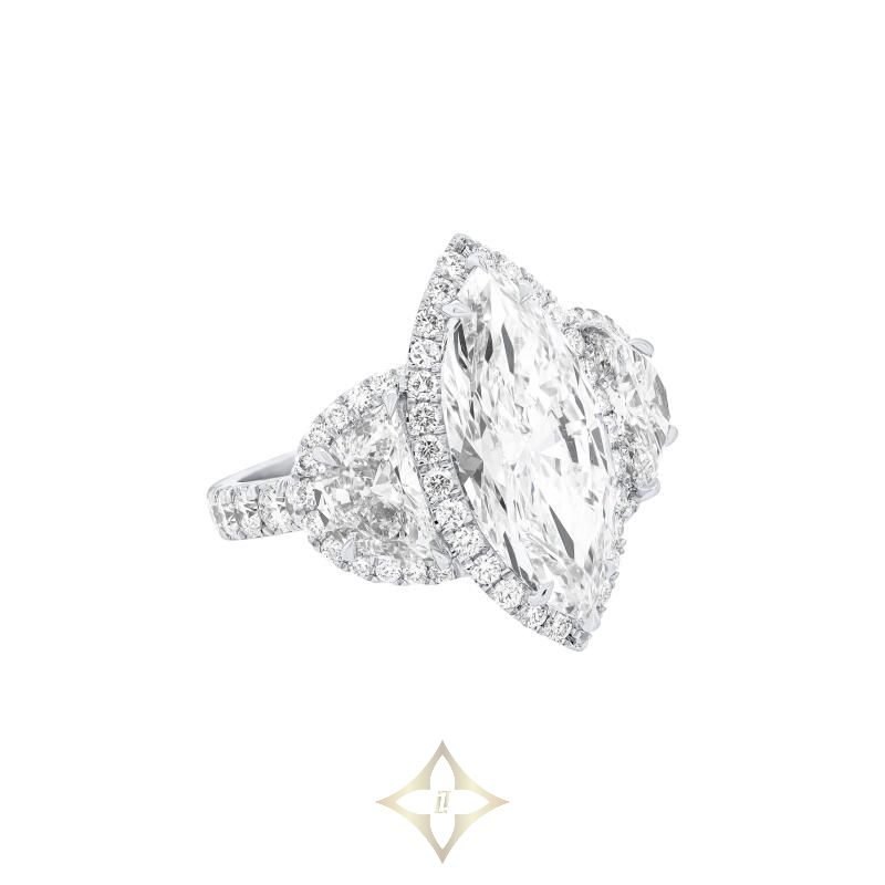 Centering a marquise cut diamond, accented by half moon cut diamonds and enhanced by round brilliant cut diamonds.