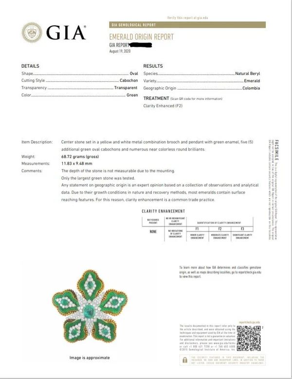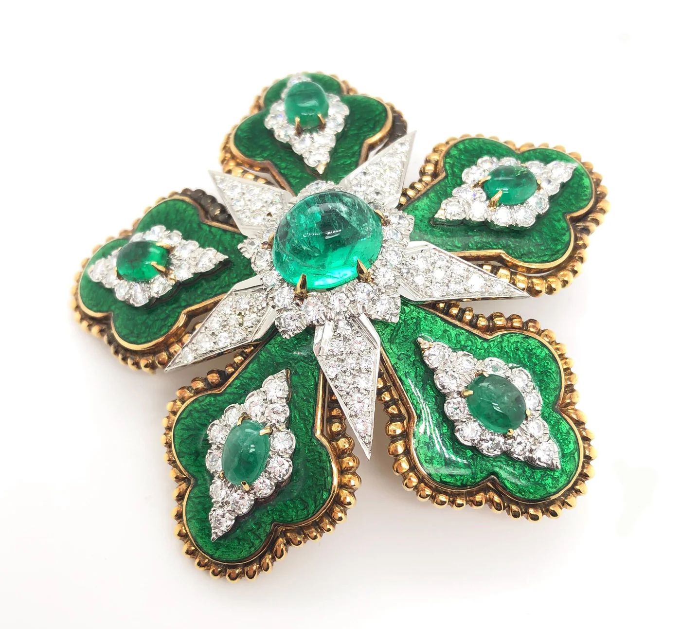 David Webb Emerald Floral Brooch, GIA Certified. Estate floral Brooch signed David Webb featuring a 5.85ct center emerald cabochon, approximately 3cts of emeralds, approximately 3cttw of pavé set diamonds and marbleized emerald green guilloché enamel set in platinum and 18k yellow gold.