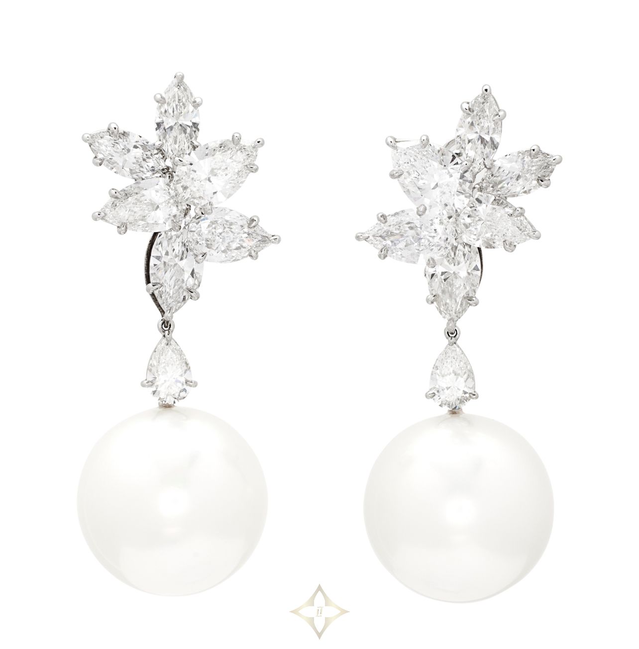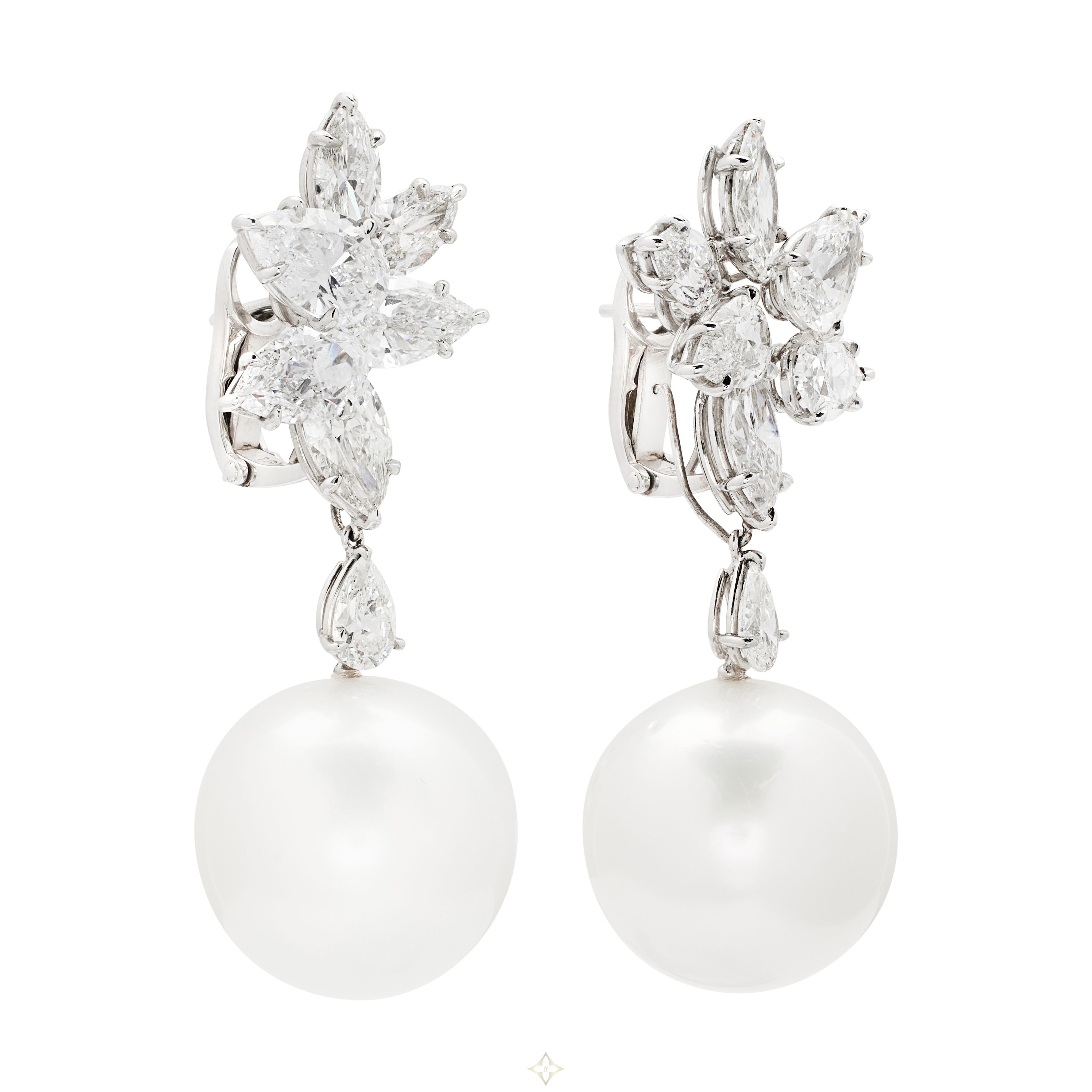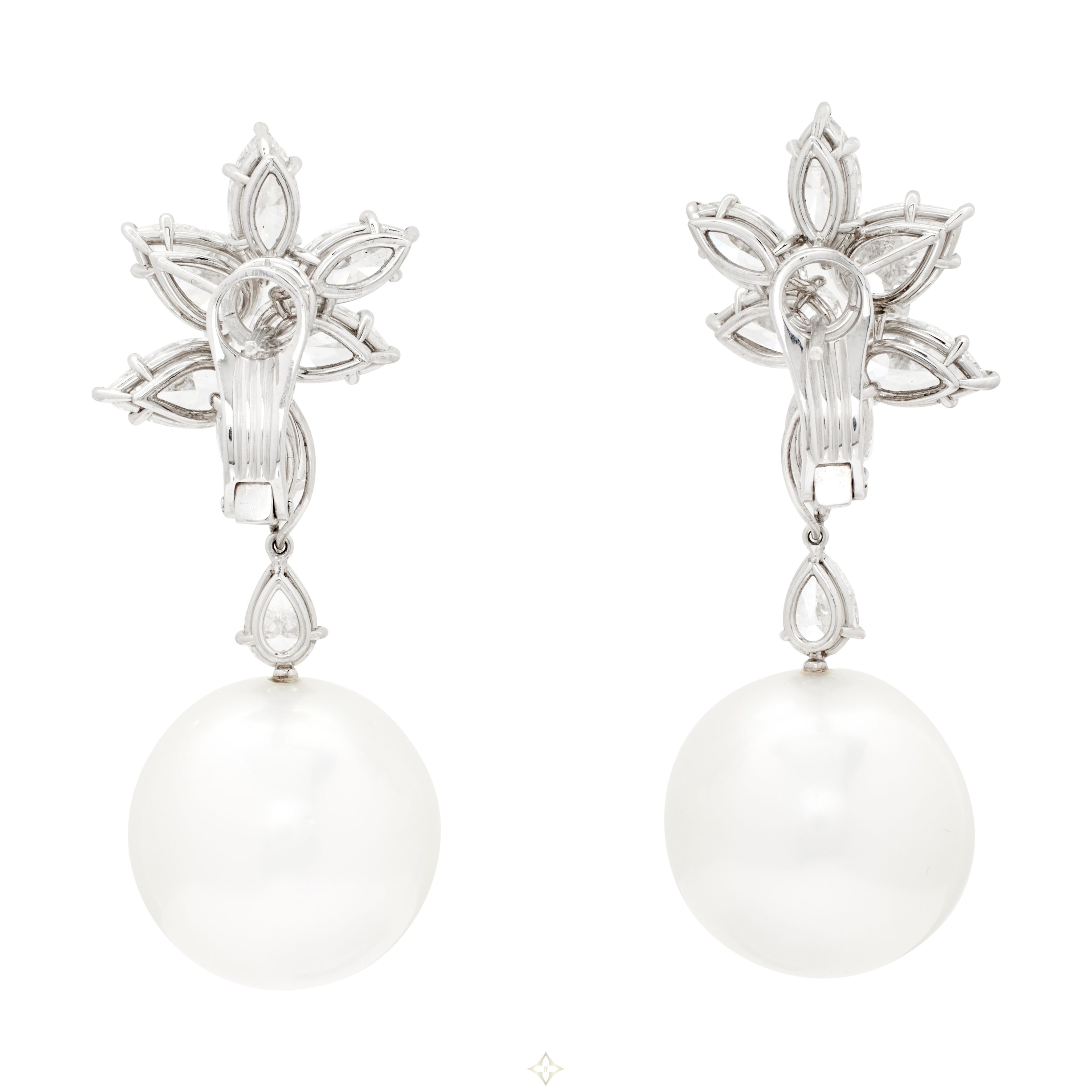 Each featuring a South Sea pearl, suspended by diamond cluster earclips, set with 6 marquise-cut diamonds and 8 pear-cut diamonds.