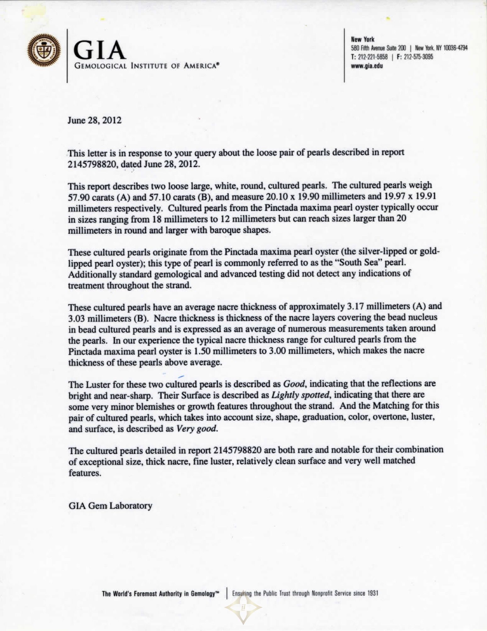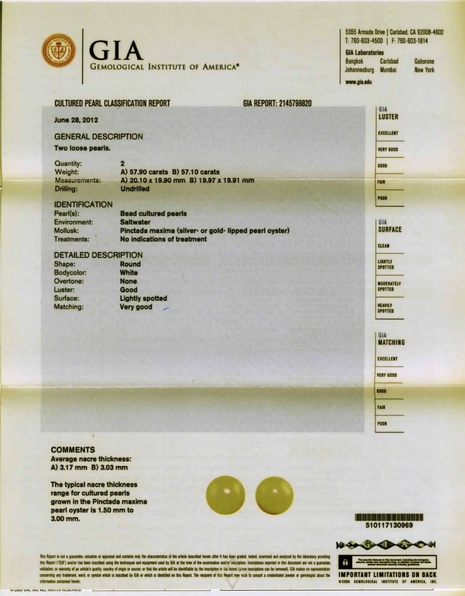 Accompany by GIA report no. 2145798820, dated 28 June 2012, stating that 57.90 carat and 57.10 carat pearls are saltwater pearl with no indications of treatment