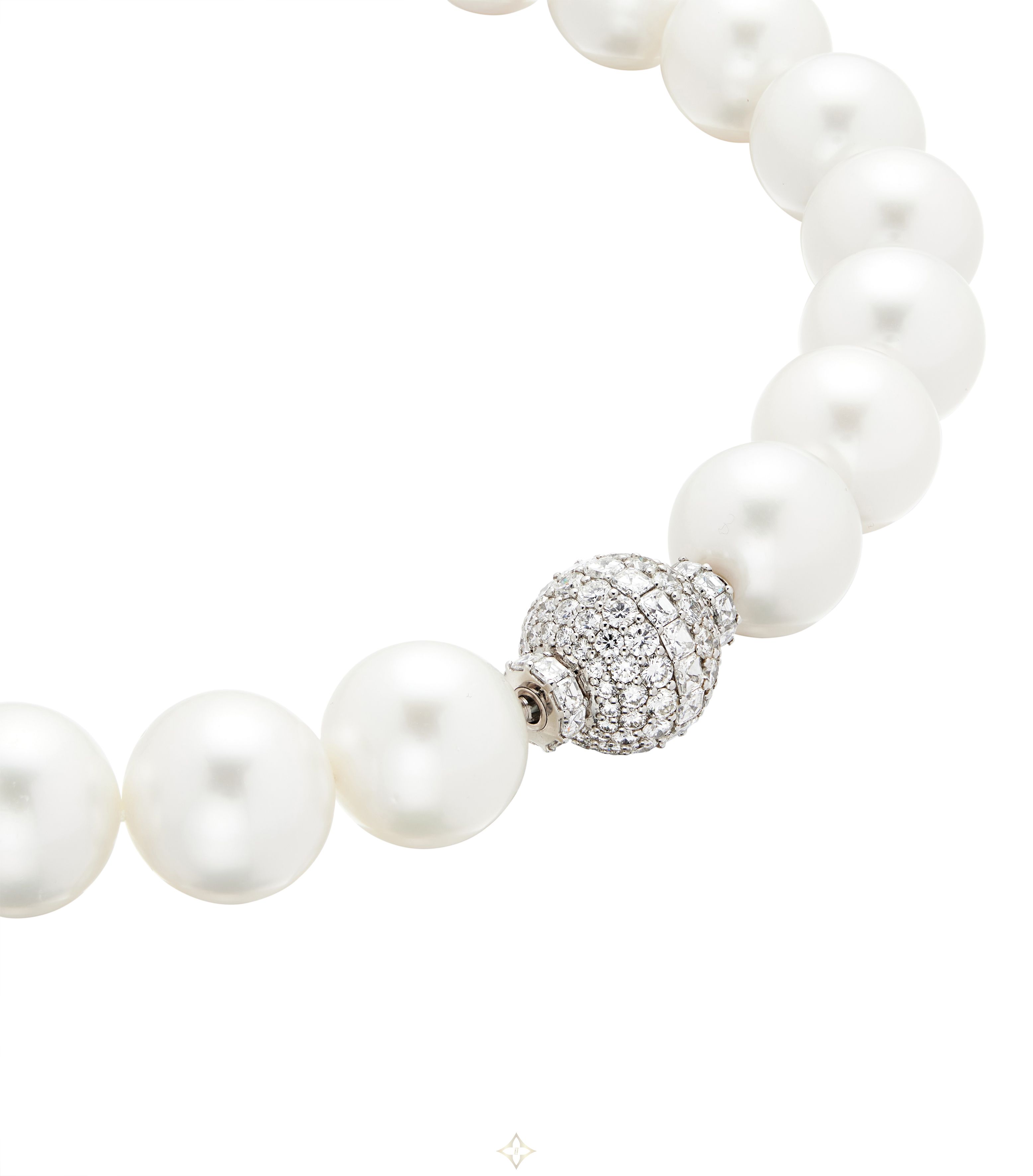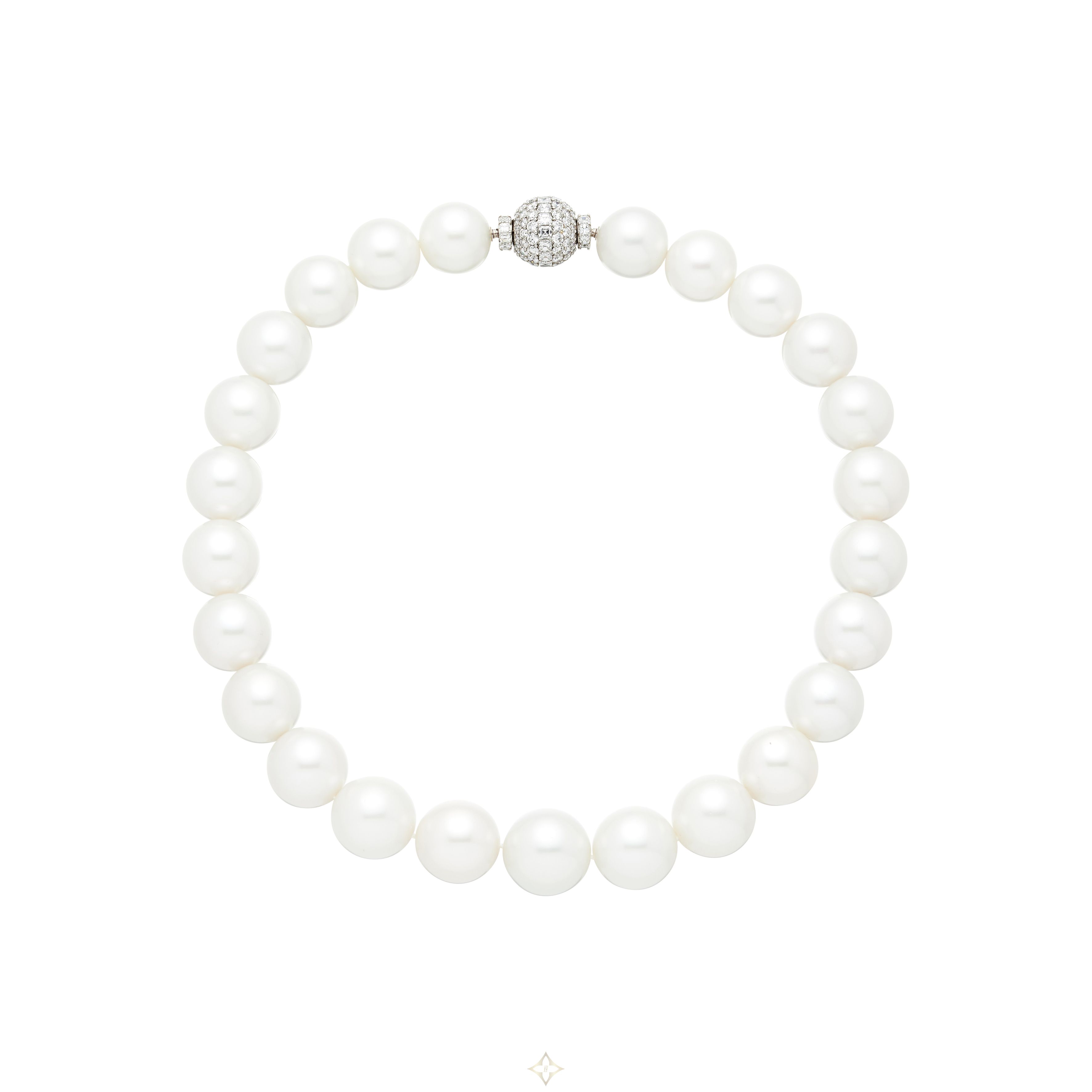 Composed of 25 round cultured pearls in slightly graduated sizes, all strung knotted to a ball clasp pavé-set with round diamonds.