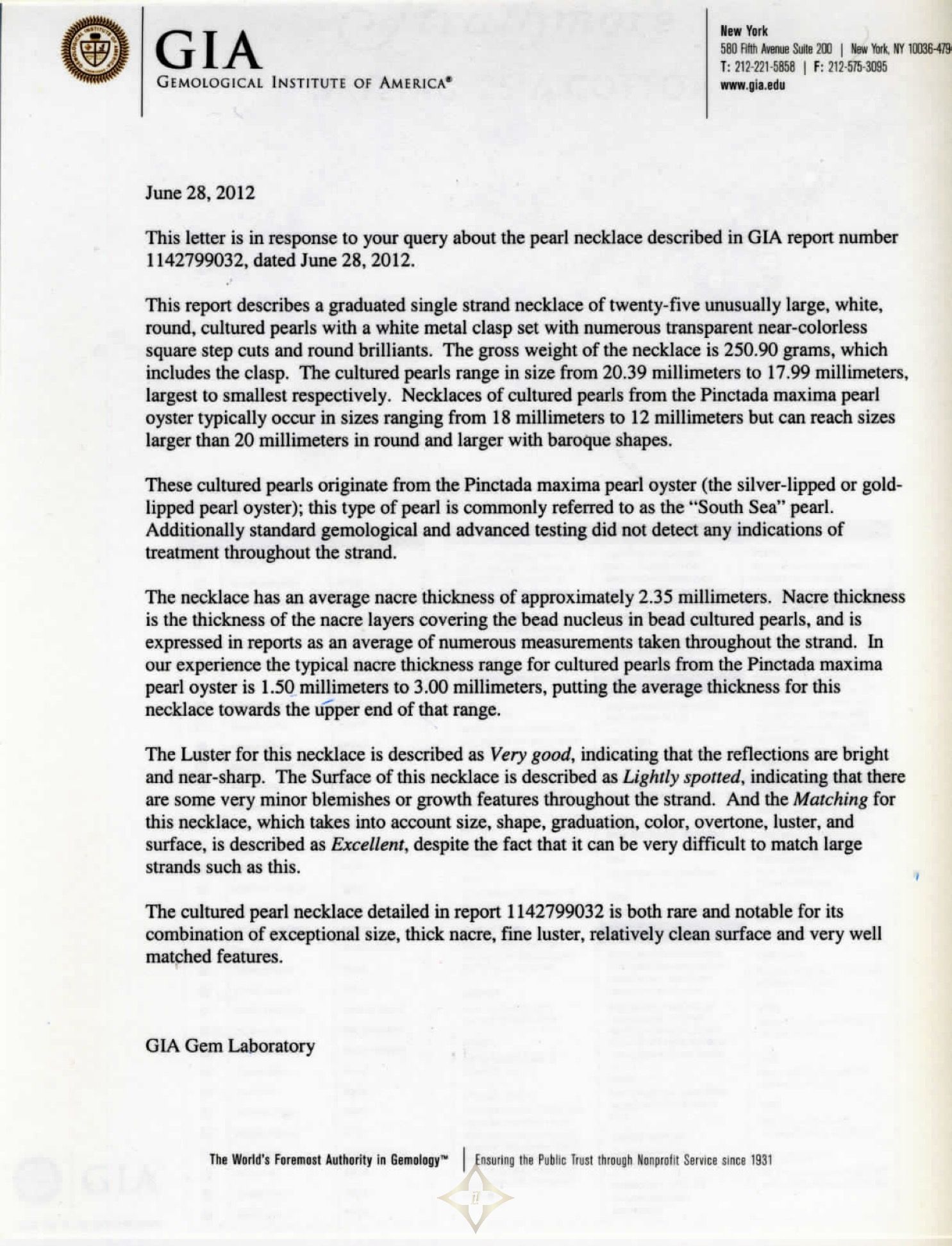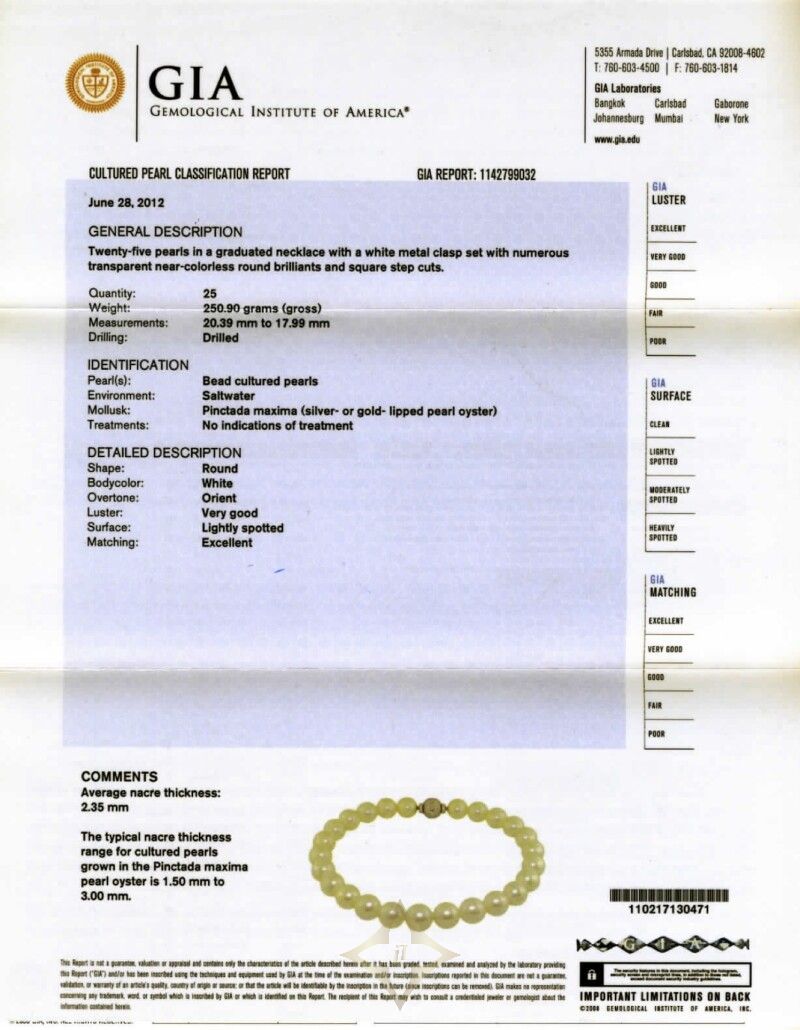 Accompanied by GIA report no. 1142799032, dated 28 June 2012, stating that the 25 round saltwater pearls have no indications of treatment