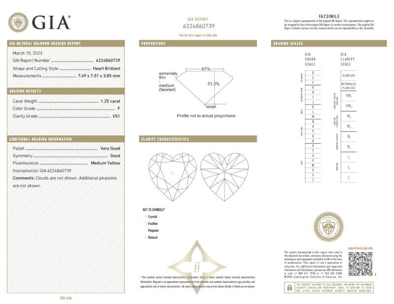Accompanied by GIA report no. 6224860739, dated 15 March 2023, stating that the 1.25 carat heart-shaped diamond is F color and VS1 clarity