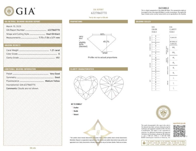Accompanied by GIA report no. 6227860770, dated 15 March 2023, stating that the 1.21 carat heart-shaped diamond is G color and VS1 clarity
