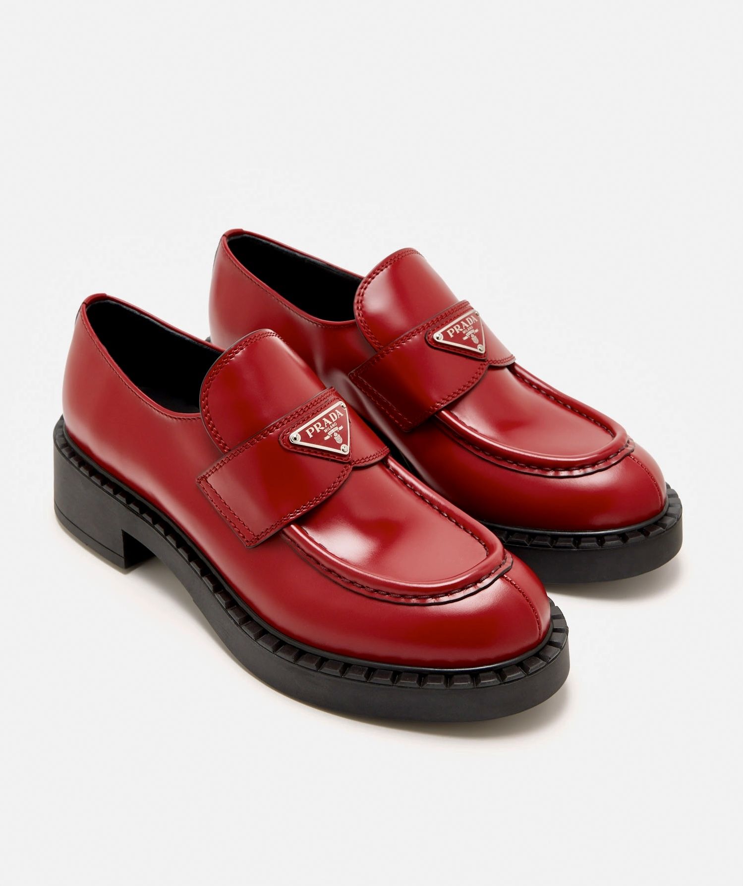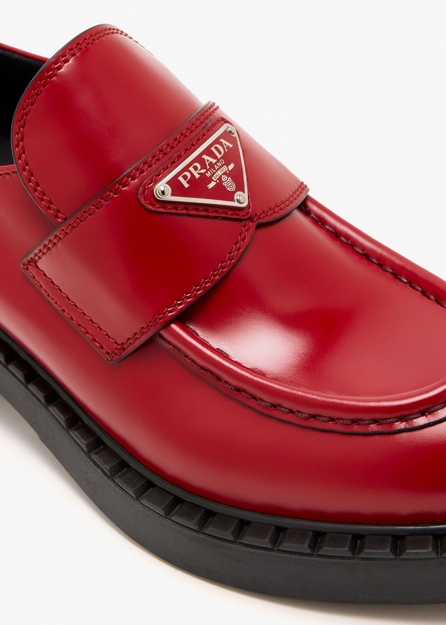 The classic penny loafer is reinterpreted by Prada with a pronounced rounded toe and a brushed leather upper. The retro-inspired pair boasts a blend of contemporary design and traditional elements. They feature a thick rubber sole, an apron with stitched raised edges, a leather band, and an enameled metal triangle logo.