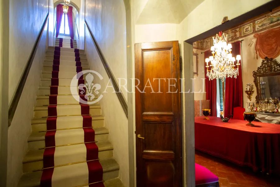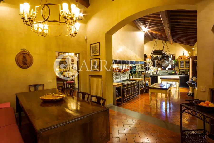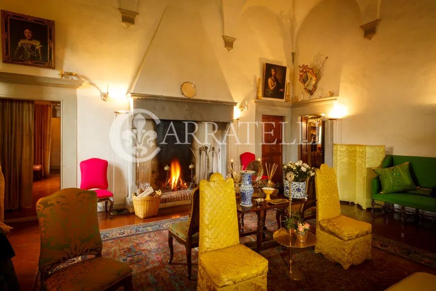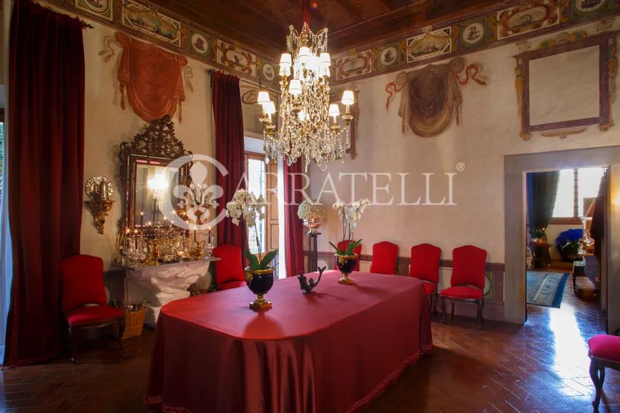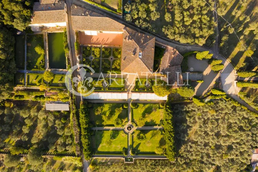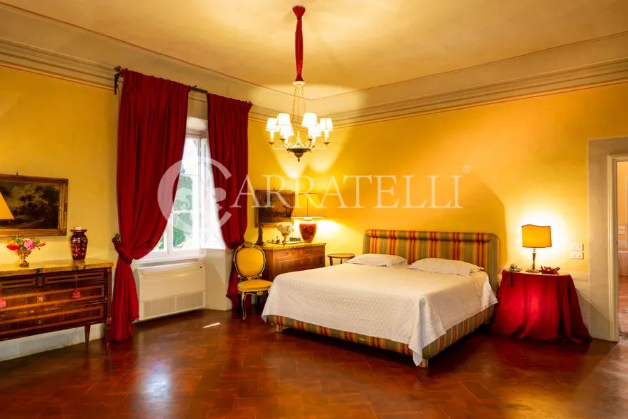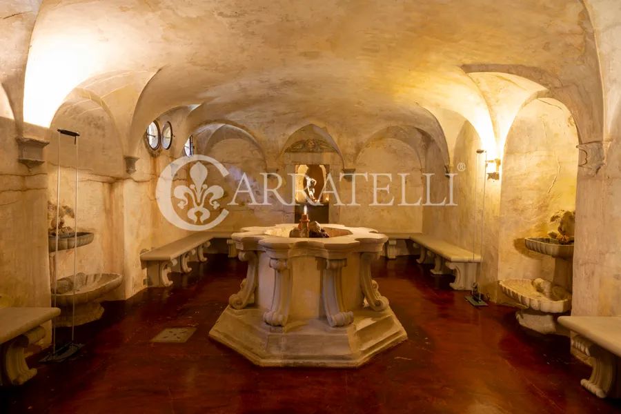 A cypress-lined avenue leads to the majestic l 14th-century villa, of extraordinary historical, architectural and artistic interest, totaling 1300 square meters. It has 9 rooms and 11 bathrooms in total, is spread over 3 levels, and a convenient elevator connects each floor. From the Renaissance to contemporary times, the mansion was lived in by historical and illustrious figures and celebrities. Making the biggest impact were the Medici, adorning the garden with statues and complex water features, commissioning the best painters and craftsmen of the time. Of the renowned Florentine family we still find the original coats of arms and names in various forms and in multiple places on the property. The large frescoed entrance hall leads to the annexe on the left, while on the right is the large kitchen with access to the garden and rooms. Continuing along the corridor one reaches the incredible main hall with very high vaulted ceiling and large fireplace, majestic reception rooms with coffered ceilings, refined dining room and cozy kitchen as well as laundry and service bathrooms. There is also a study and other enchanting rooms thanks to their timeless beauty. The finest jewel set in the villa is the family chapel with vaulted ceiling and frescoed sacristy. Also, a winter garden and a large independent studio with bathroom, kitchenette and open view of the garden. The upper floor houses the sleeping area with five decorated bedrooms with en suite bathrooms, including a master in addition to the large loggia and an independent guest apartment. The basement floor houses the ancient underground baths with their nymphaeum decorated with precious statues and fountains in addition to the wellness area with sauna, Turkish bath, tub and jacuzzi.
