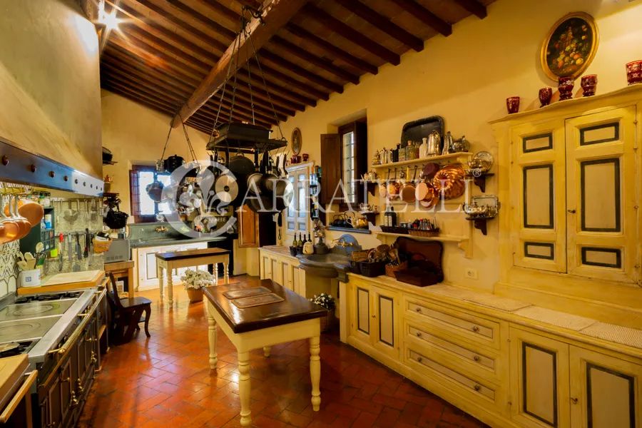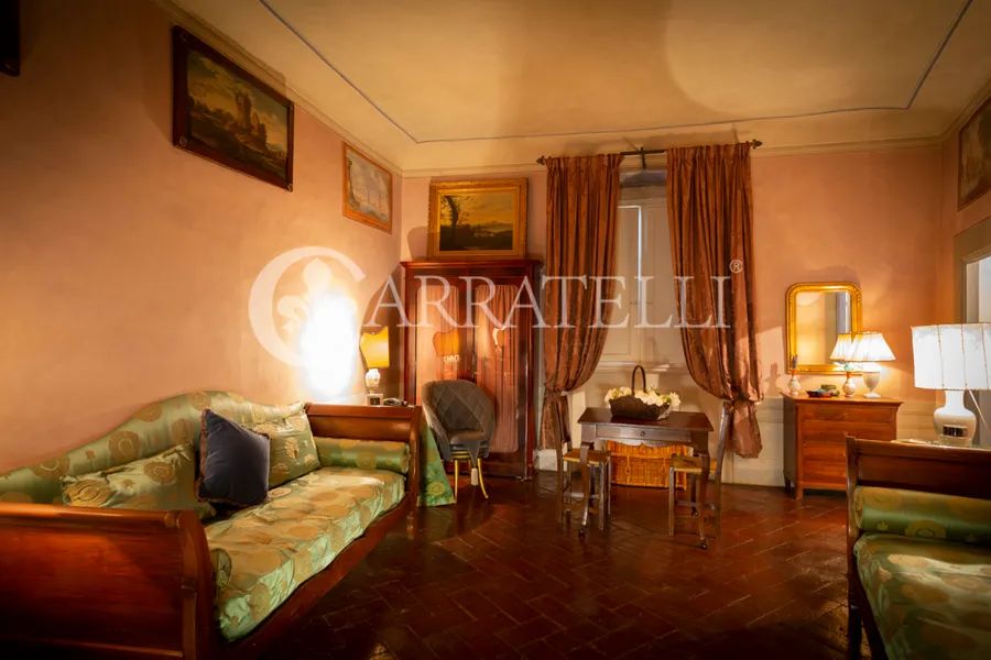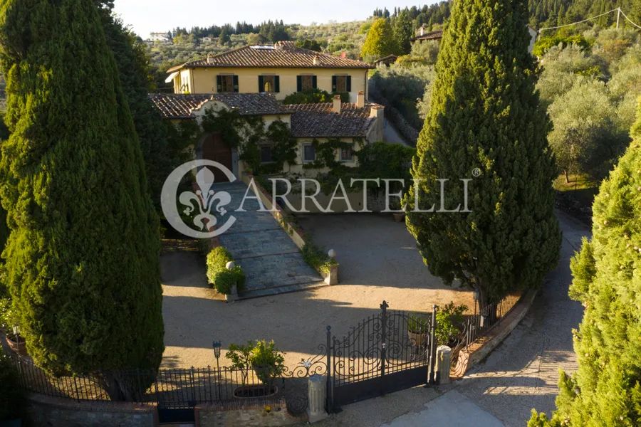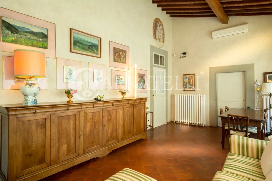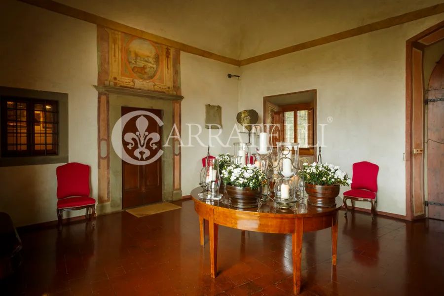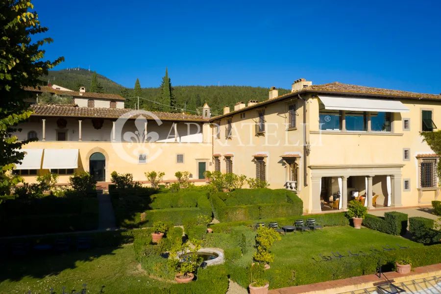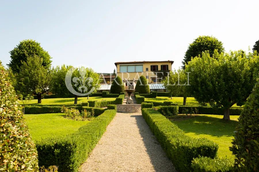 A cypress-lined avenue leads to the majestic l 14th-century villa, of extraordinary historical, architectural and artistic interest, totaling 1300 square meters. It has 9 rooms and 11 bathrooms in total, is spread over 3 levels, and a convenient elevator connects each floor. From the Renaissance to contemporary times, the mansion was lived in by historical and illustrious figures and celebrities. Making the biggest impact were the Medici, adorning the garden with statues and complex water features, commissioning the best painters and craftsmen of the time. Of the renowned Florentine family we still find the original coats of arms and names in various forms and in multiple places on the property. The large frescoed entrance hall leads to the annexe on the left, while on the right is the large kitchen with access to the garden and rooms. Continuing along the corridor one reaches the incredible main hall with very high vaulted ceiling and large fireplace, majestic reception rooms with coffered ceilings, refined dining room and cozy kitchen as well as laundry and service bathrooms. There is also a study and other enchanting rooms thanks to their timeless beauty. The finest jewel set in the villa is the family chapel with vaulted ceiling and frescoed sacristy. Also, a winter garden and a large independent studio with bathroom, kitchenette and open view of the garden. The upper floor houses the sleeping area with five decorated bedrooms with en suite bathrooms, including a master in addition to the large loggia and an independent guest apartment. The basement floor houses the ancient underground baths with their nymphaeum decorated with precious statues and fountains in addition to the wellness area with sauna, Turkish bath, tub and jacuzzi.