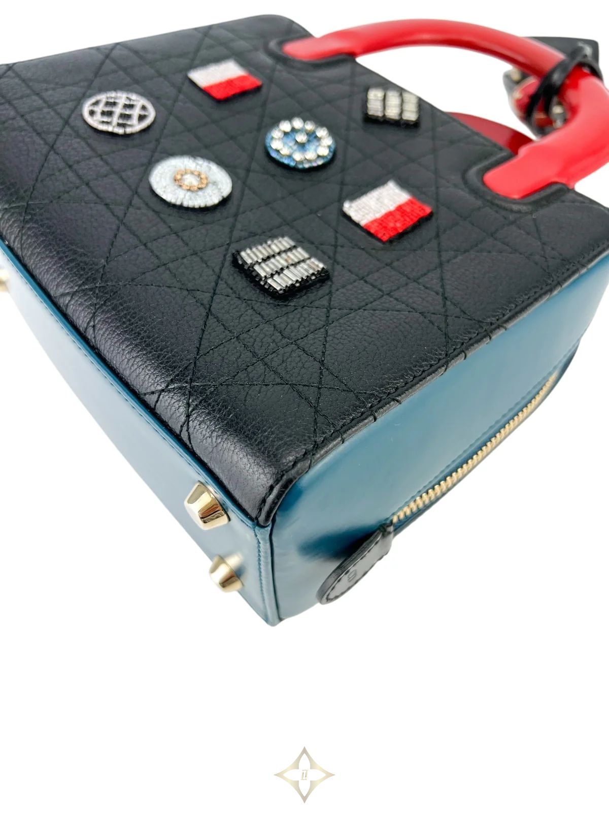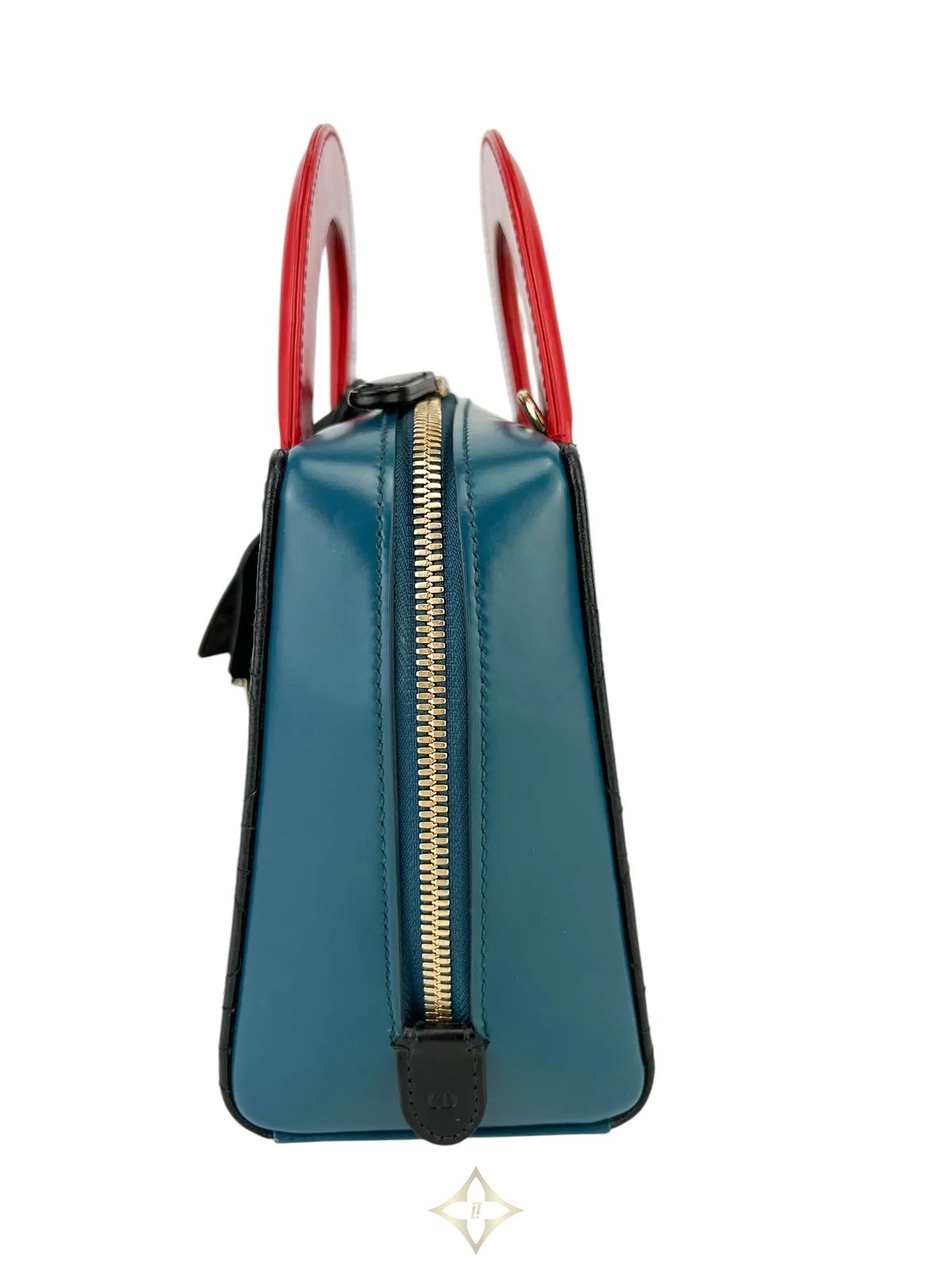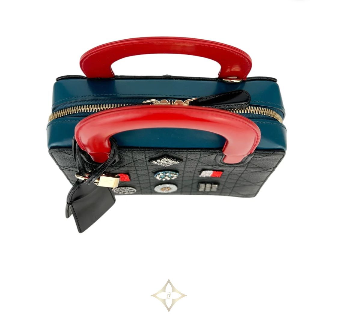 Details: Black, blue and red leather. Embellishment details on front and back. Double zip closure. Clochette, padlock and key. Feet on the bottom. D-rings built into design - no strap included.
