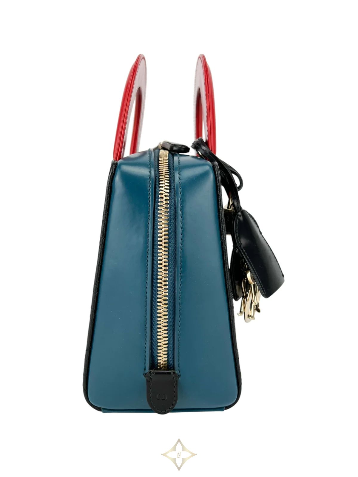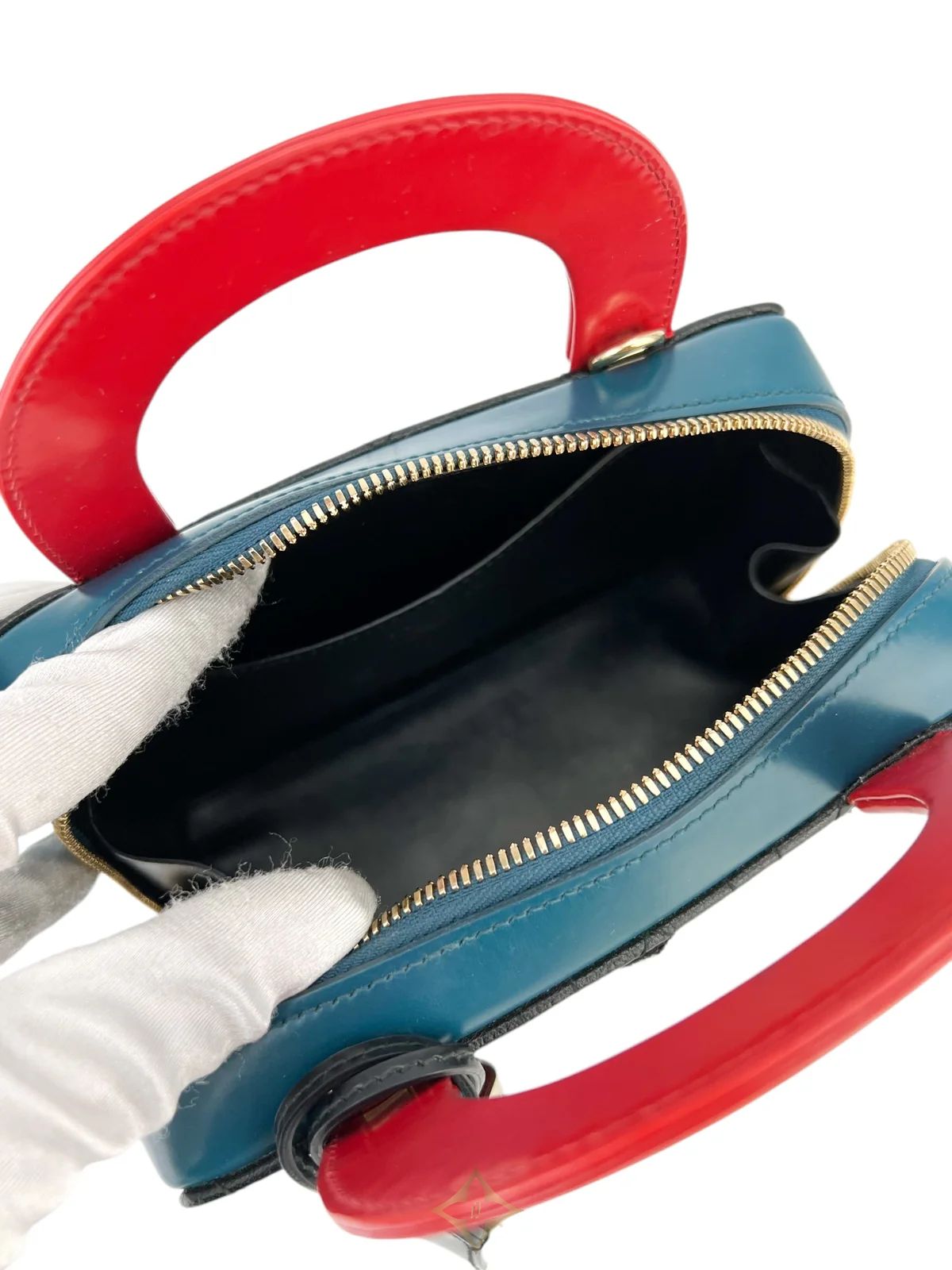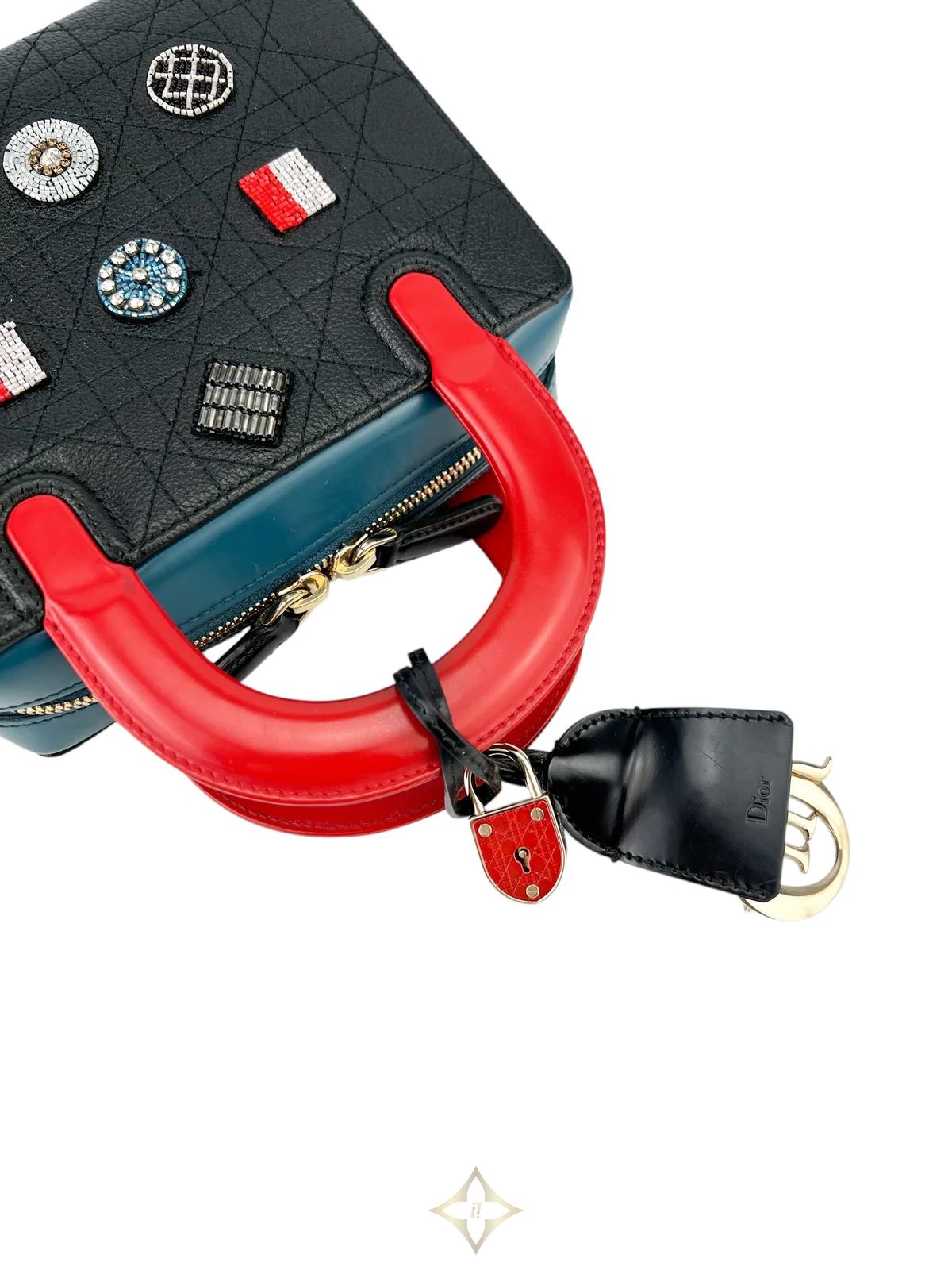 Details: Black, blue and red leather. Embellishment details on front and back. Double zip closure. Clochette, padlock and key. Feet on the bottom. D-rings built into design - no strap included.