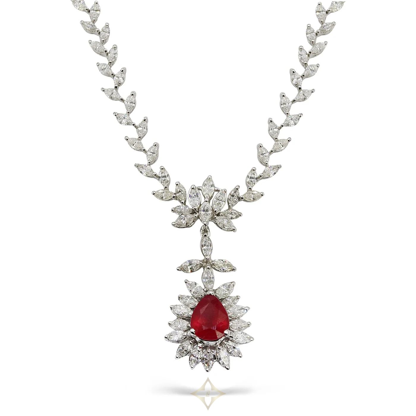 Diamond and Ruby Necklace styled with marquise Diamonds all over the necklace, made in white gold, Center pear shape Ruby. A crown has made from Diamonds holding both the sides of necklace and ruby.