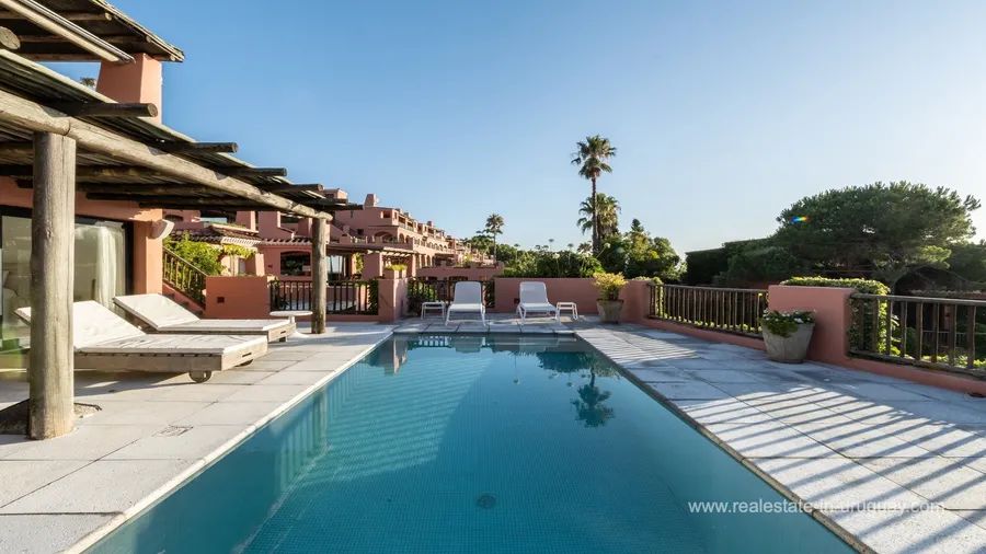 Located in the prestigious Marina del Este complex, this property is one of the few units featuring a private pool. It offers increased space, large terraces on every level, and open sea views, along with some of the area’s best sunsets. The unit spans two floors, each with a generous terrace, plus a basement with ample storage, ensuring functionality and comfort. The upper floor includes a spacious living room, bar, and dining area with direct access to a large sea-facing terrace, perfect for enjoying sunsets. This outdoor space includes a covered barbecue area and dining space. This level also has a guest bathroom, a well-defined kitchen, a guest bedroom with an en-suite bath, and a service area accessible via an independent patio from the kitchen. The lower floor features three en-suite bedrooms, each with direct access to their large terrace, deck, and pool, offering a private, relaxing environment with stunning views. Additional features include ample storage closets in hallways, an extra room in the basement, five closed parking spaces with a storage room, and two covered outdoor parking spaces. Marina del Este provides premium amenities such as two community pools, a fully equipped gym, spa, tennis court, children’s play area, security, and cleaning services.