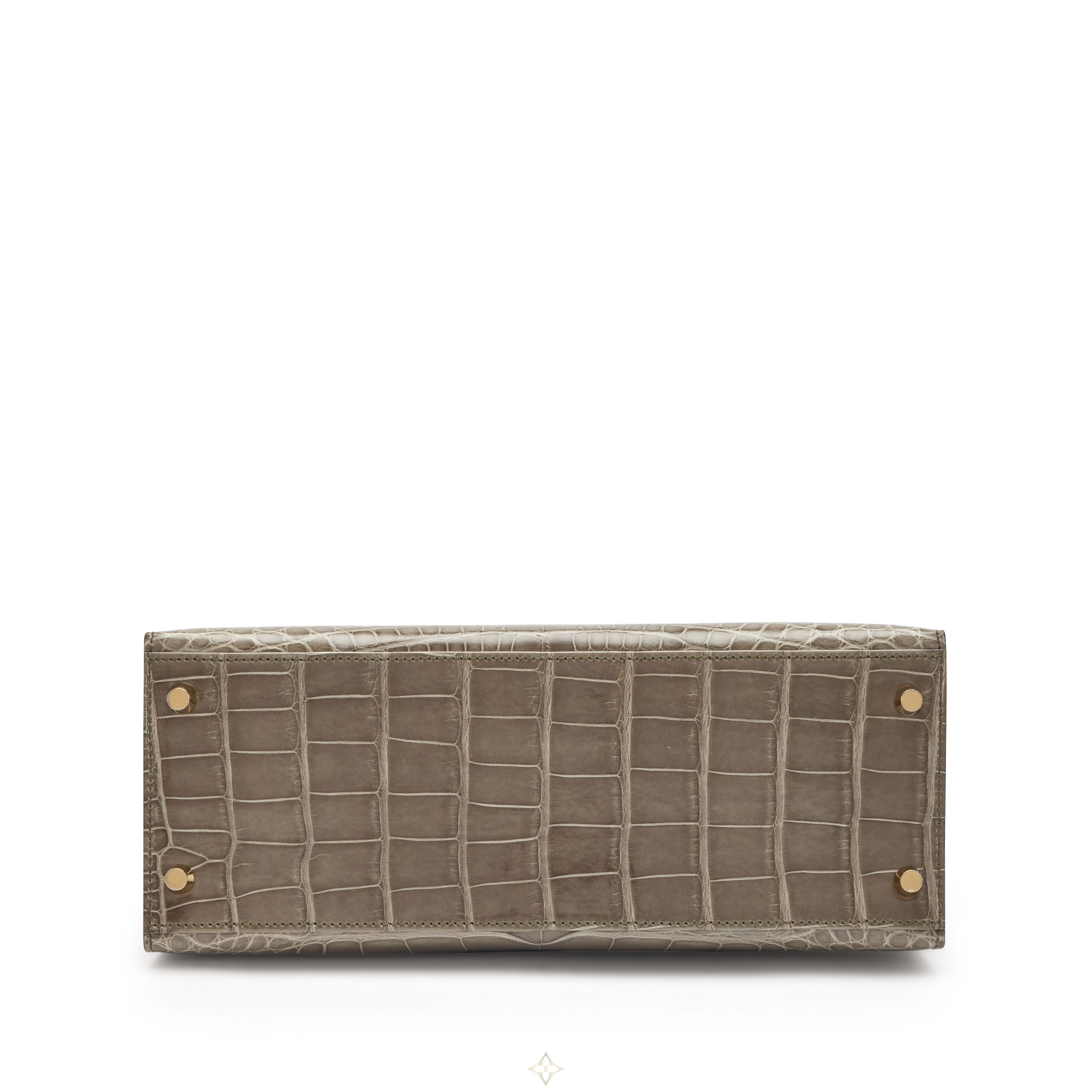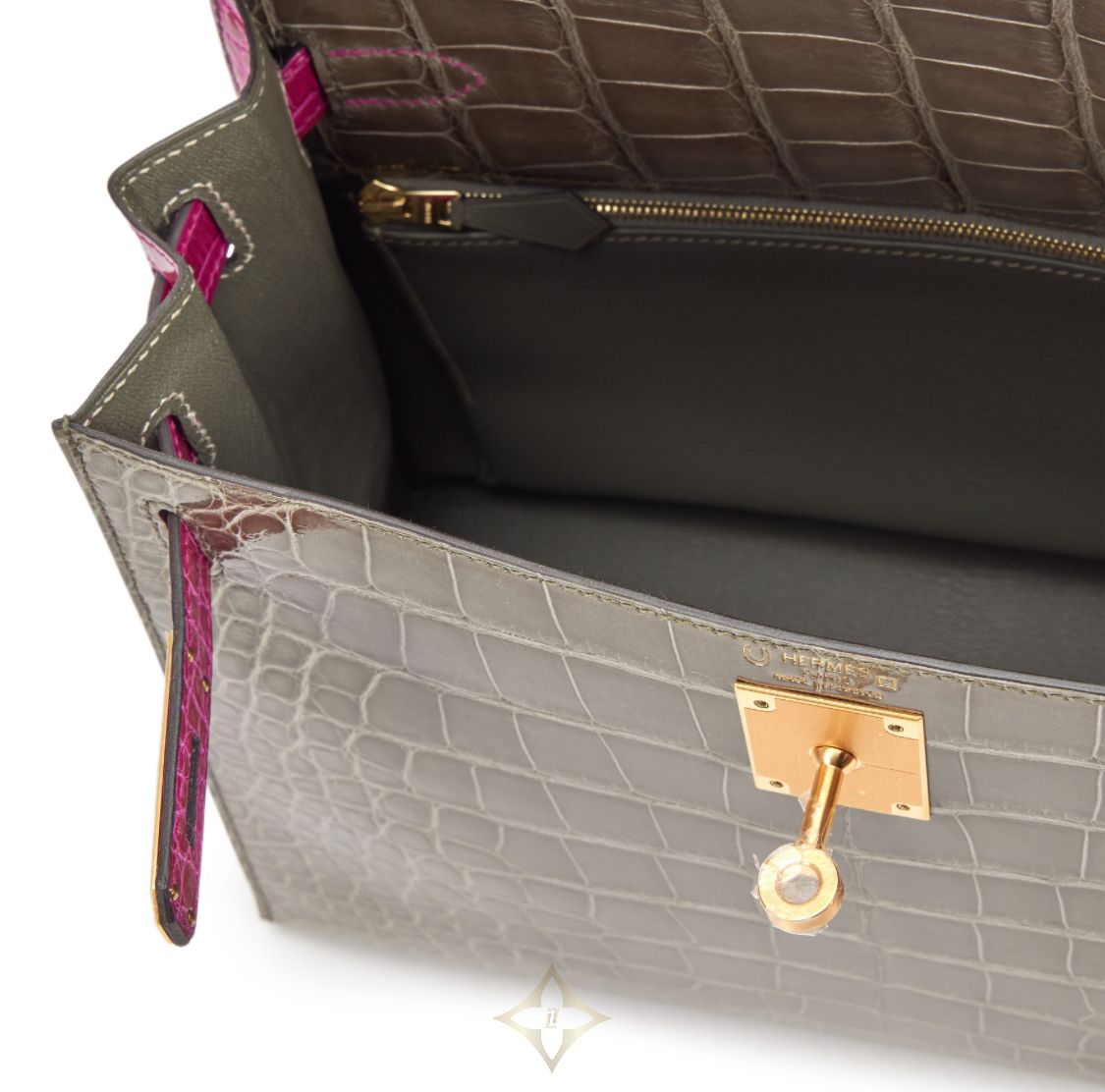 Hermès Gris Tourterelle and Rose Mexico Shiny Alligator HSS Sellier Kelly 28 Brushed Gold Hardware, 2020