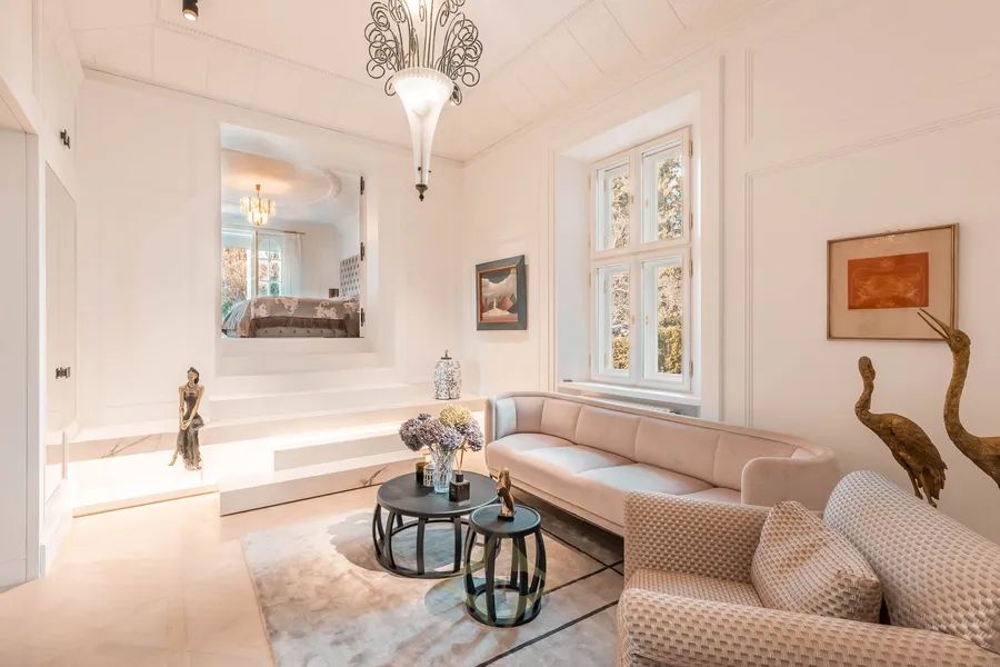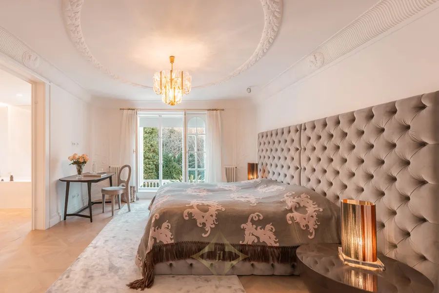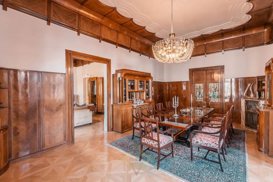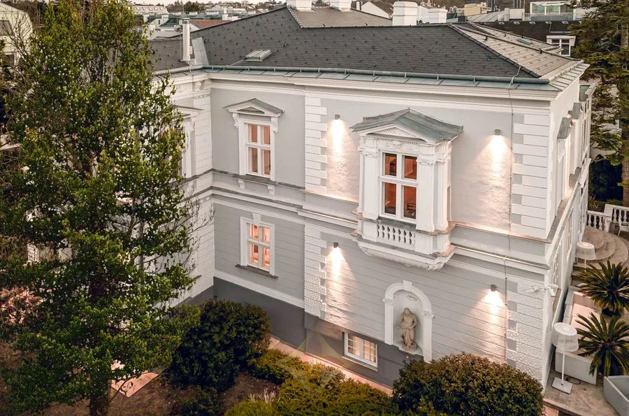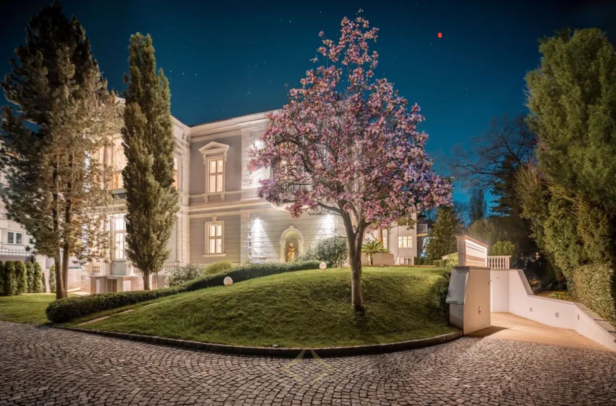 In 1875, on the site of the former „Neue Welt“ (popular amusement park) in a prime location in Althietzing, master builder Josef Wenz erected a magnificent two-story villa with a veranda and bay window, which exudes the sophisticated and elegant flair of the late 19th century. Via the entrance, staircase and mezzanine located on the west side of the villa, one reaches the upper floor - the Bel Étage - where one embarks on a beautiful journey back in time to the early 20th century. During the extension works carried out in 1902, an interior of outstanding quality and beauty was built on this floor, both in the salon, dining room and ladies‘ room as well as on the veranda, representing the superlative of irretrievable craftsmanship and sophistication. This magnificent building is complemented by a spa area with sauna, steam bath and infrared cabin, a spacious wine cellar, and a garage with 5 car parking spaces on the lower floor. What a magnificent, unique jewel in the finest Althietzing location, meeting only the very highest standards! This stately villa is unique in its ambience and offers pure luxury and highest quality of life in one of the most beautiful districts of Vienna.