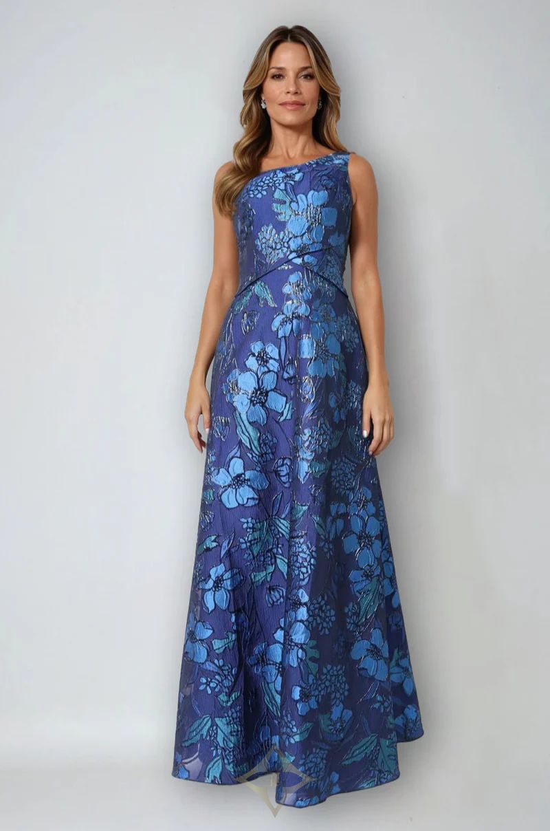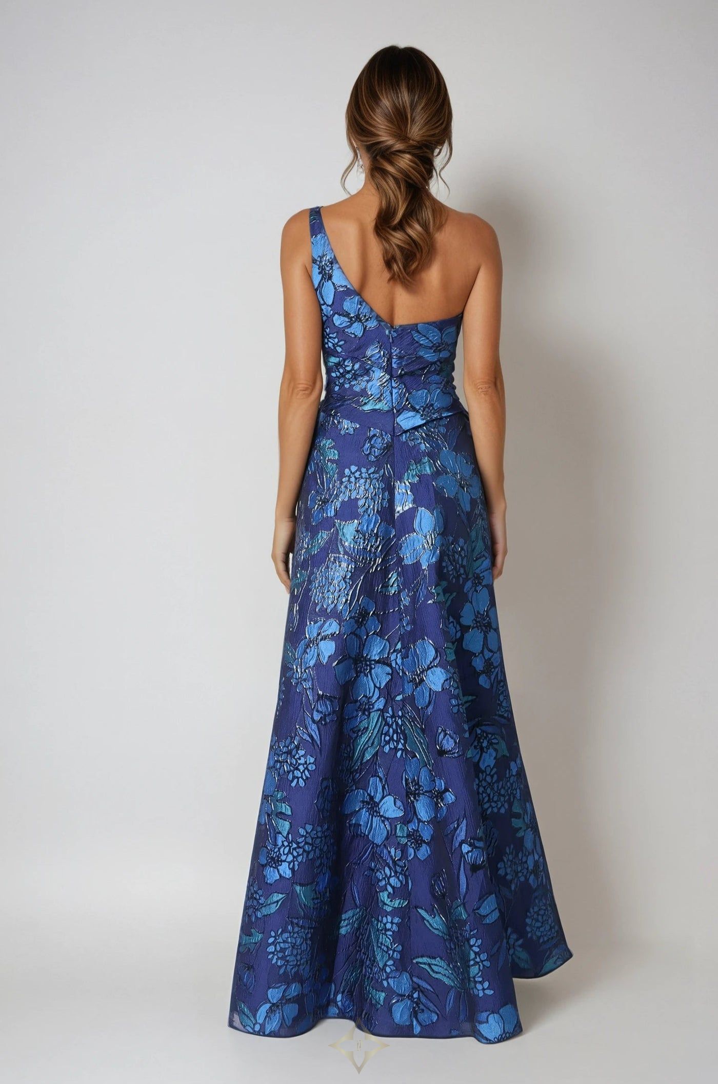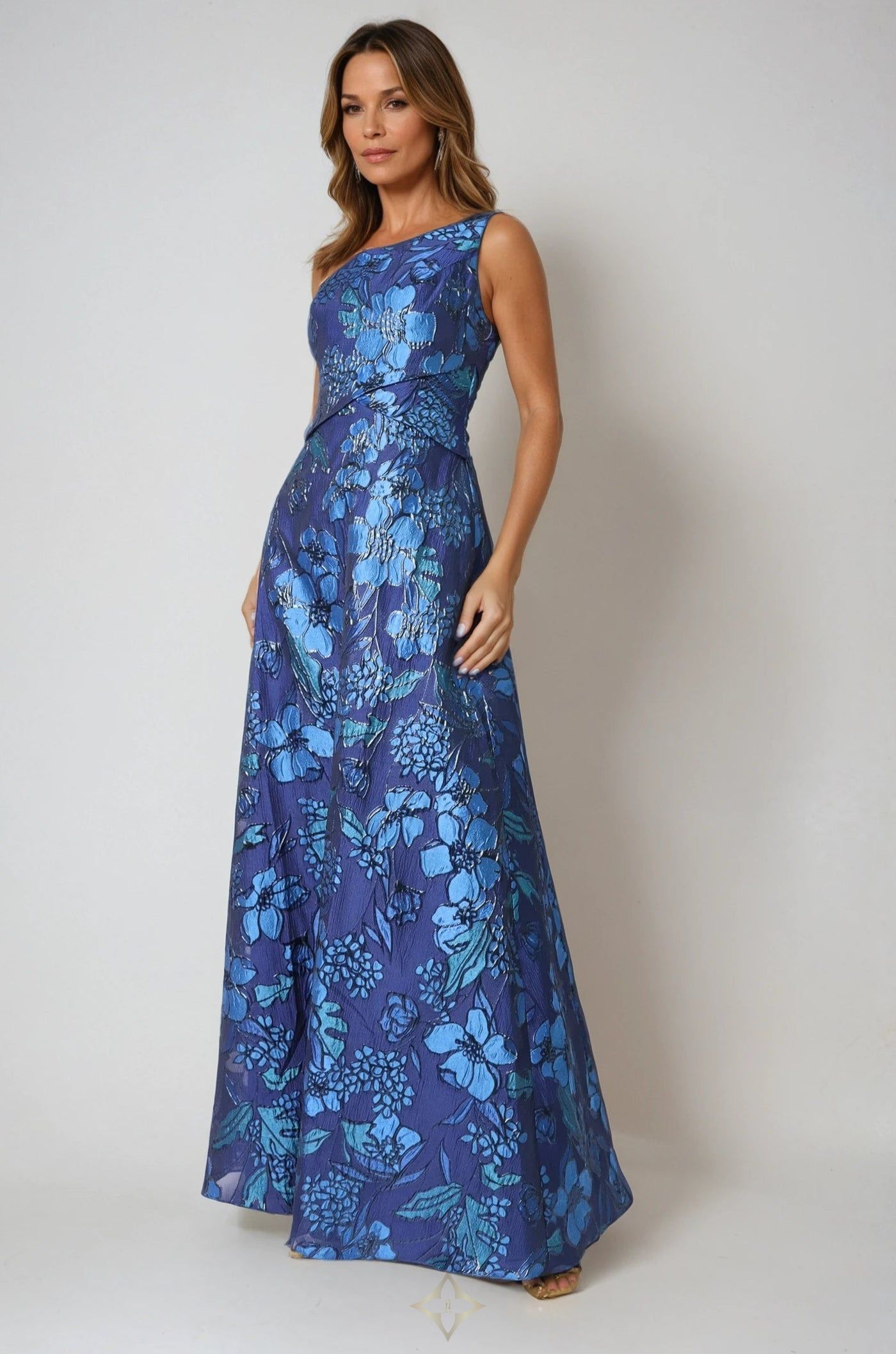 ONE SHOULDER BROCADE METALLIC FLORAL A-LINE GOWN
