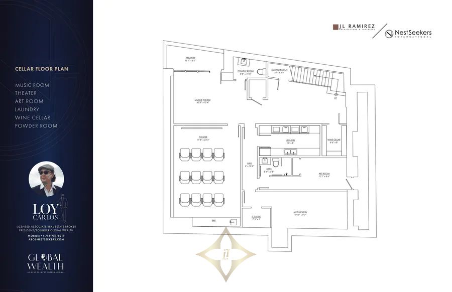 The cellar is planned to hold an extended amenity floor with a movie theater, art room/studio/workshop, music room, wine cellar and laundry room. Proposed elevator placement is also included in the plans.