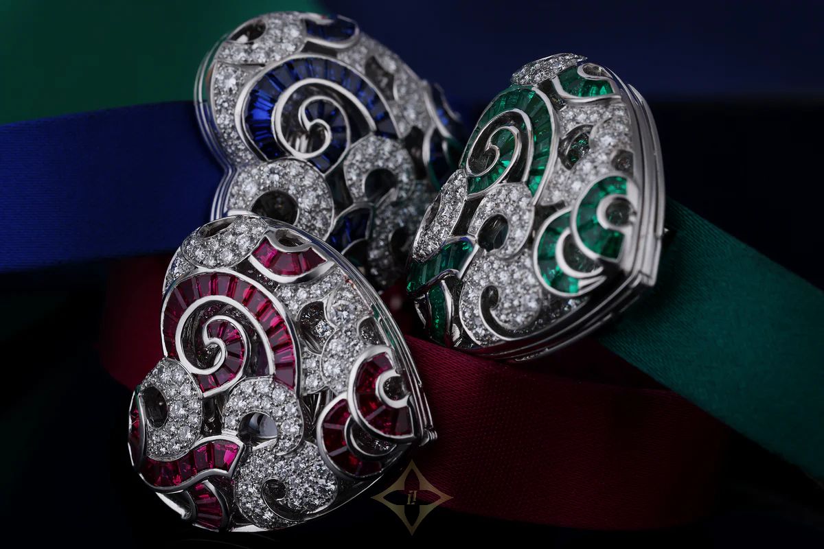 The beautiful dials beneath are in corresponding Pink, Blue and Green shades of Mother of Pearl, respectively, along with 4 Emerald, Ruby or Sapphire hour markers to match. The dial is further surrounded by a triple-row round diamond setting on the bezel and inner case.