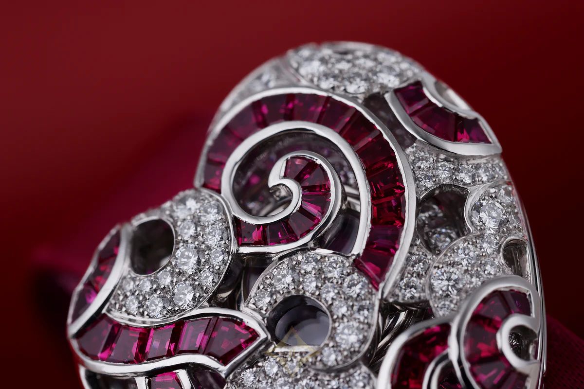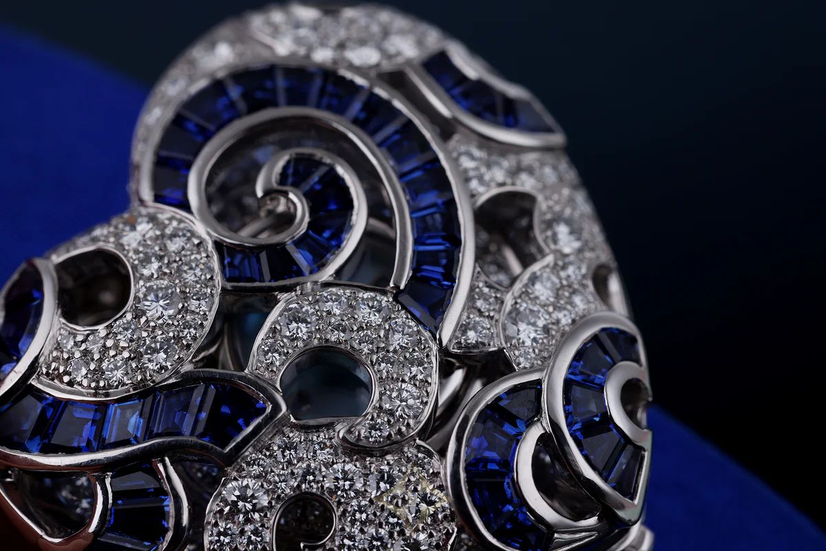 Under the hood of the case the craftsmanship and setting of the stones can be beautifully admired like a stained-glass window.