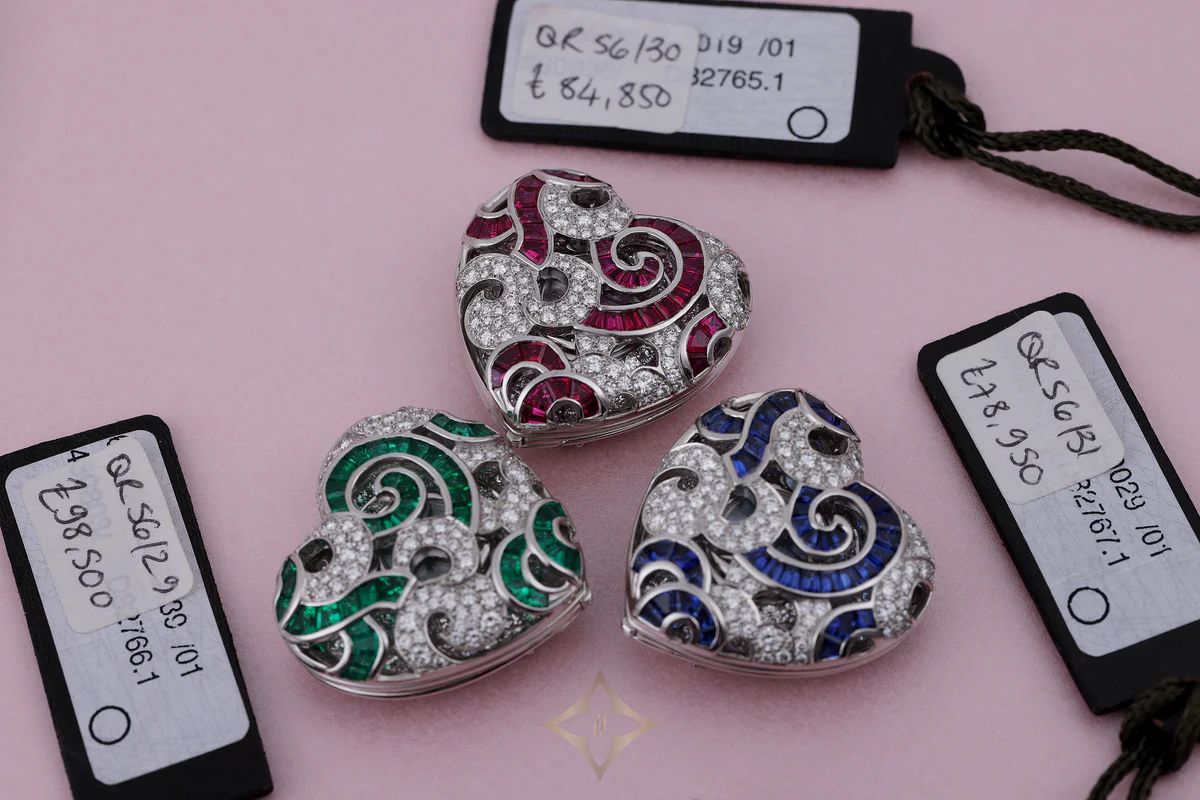 RARE AUDEMARS PIGUET VINTAGE HEART-SHAPED LADIES WRISTWATCHES | SET OF 3 | REF. 67039BC | EMERALD, RUBY & SAPPHIRE VARIETY | MOTHER OF PEARL DIAL | 18K WHITE GOLD | CIRCA 1990'S