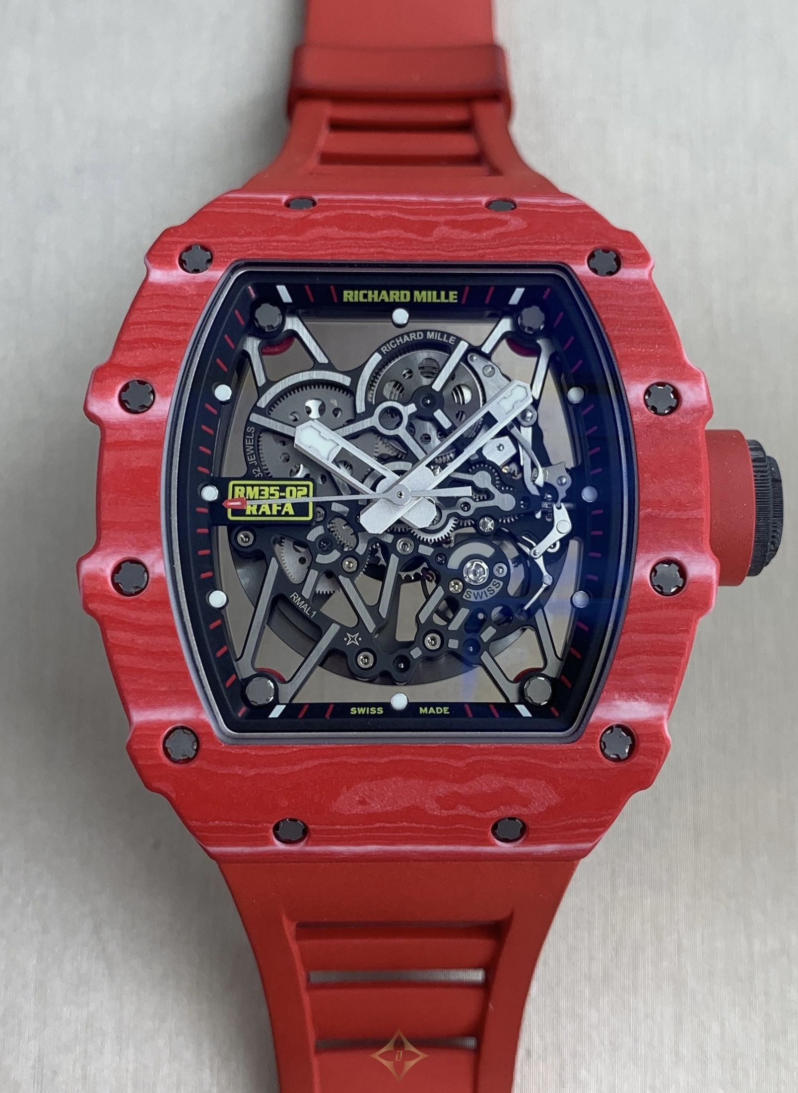 Richard Mille Automatic Rafael Nadal RM35-02 Used Men's PRICE: ¥42,500,000 (tax included) TAX FREE ¥38,636,300 (excluding tax) Product specifications and condition Inquiry code: U-RM3502 Available at:: Shinjuku store Brand: RICHARD MILLE Model: Richard MilleOther Model Product name: Automatic Rafael Nadal Model number: RM35-02 Dial color: Skeleton Movement: Self-winding Case Material: Carbon Case Size Case: 50mm length x 44mm width Belt Type: strap Belt Material: rubber - Total Weight: 72g Instruction manual / Warranty card (issued March 2017) / Service case Maintenance Information Condition Exterior finishing/machine inspection (At our store in October 2024) case: It is in good condition with no noticeable scratches or damage. Bezel: It is in good condition with no noticeable scratches or damage. Glass: There are some minor scratches remaining, but they are not noticeable when wearing the item. Hands and dial: It is in good condition with no noticeable scratches or damage. belt: This is a genuine product with little signs of use. Model information This is a basic automatic model with a skeletonized case and dial that characterize Richard Mille. The distinctive case is made of a new material, TPT quartz. Hundreds of quartz fiber layers are stacked together, creating a beautiful contrast between bright red and white, and it is heat-resistant, strong, and biocompatible. Although it has simple functions, it is equipped with a "variable moment of inertia rotor" that can increase or decrease the winding efficiency of the mainspring after checking the owner's usage. Store pickup: Yes Returns: Yes Our Guarantee Natural failure of internal machinery 1 year from date of purchase ——— GINZA RASIN (RASIN Co., Ltd.) Phone: +813-6252-1515 WhatsApp: ‪+81 70‑4450‑7458‬ Email: info@rasin.co.jp OFFICE 〒104-0061