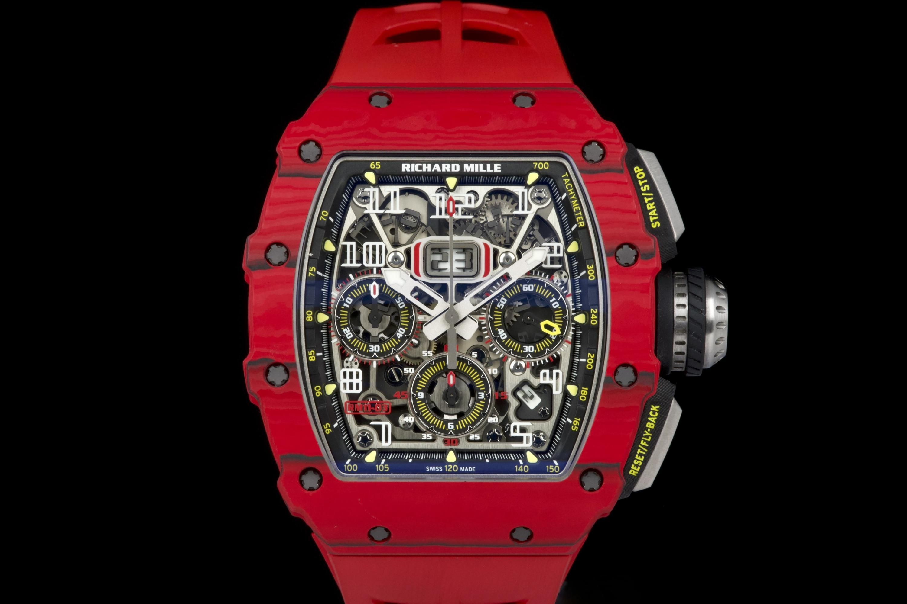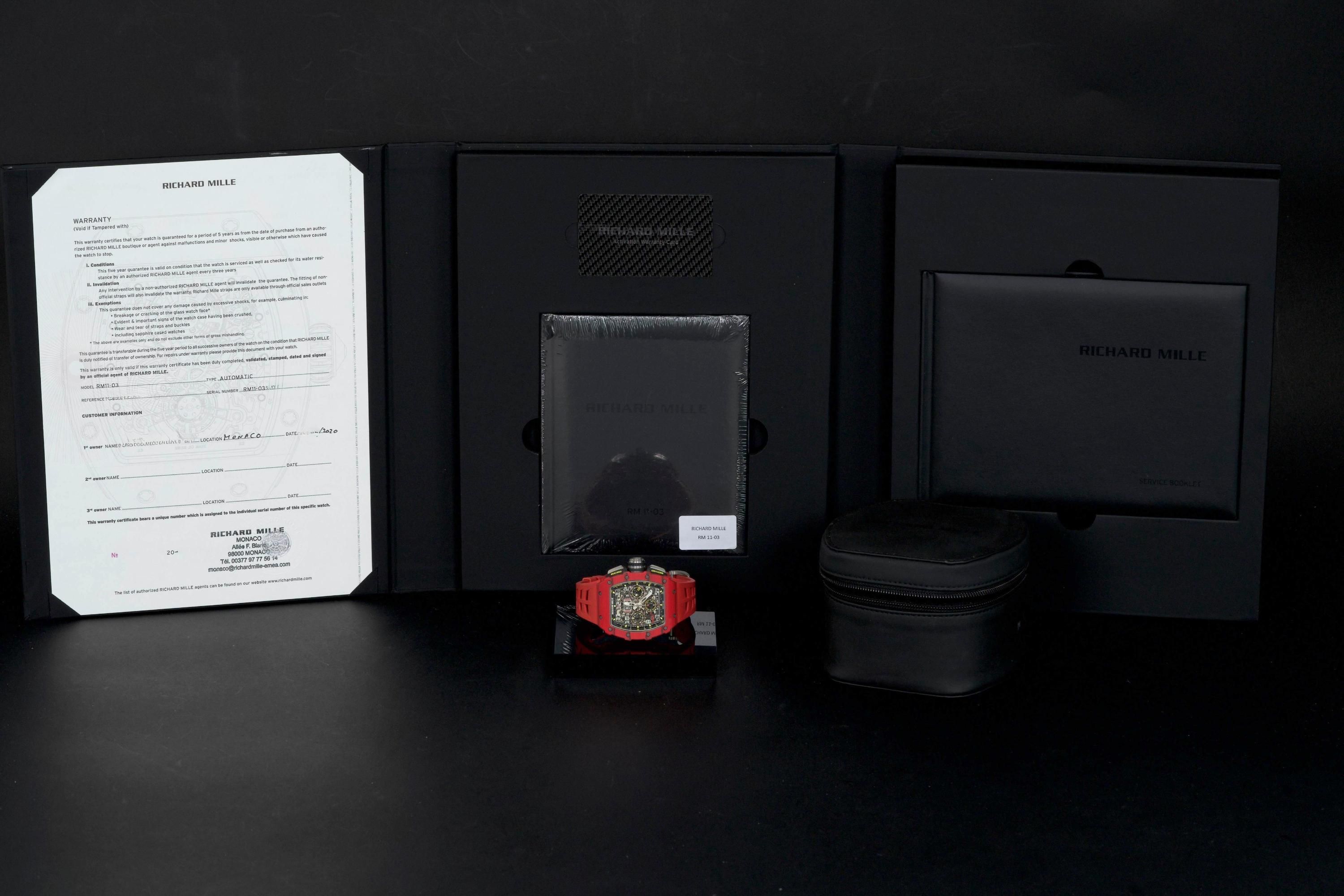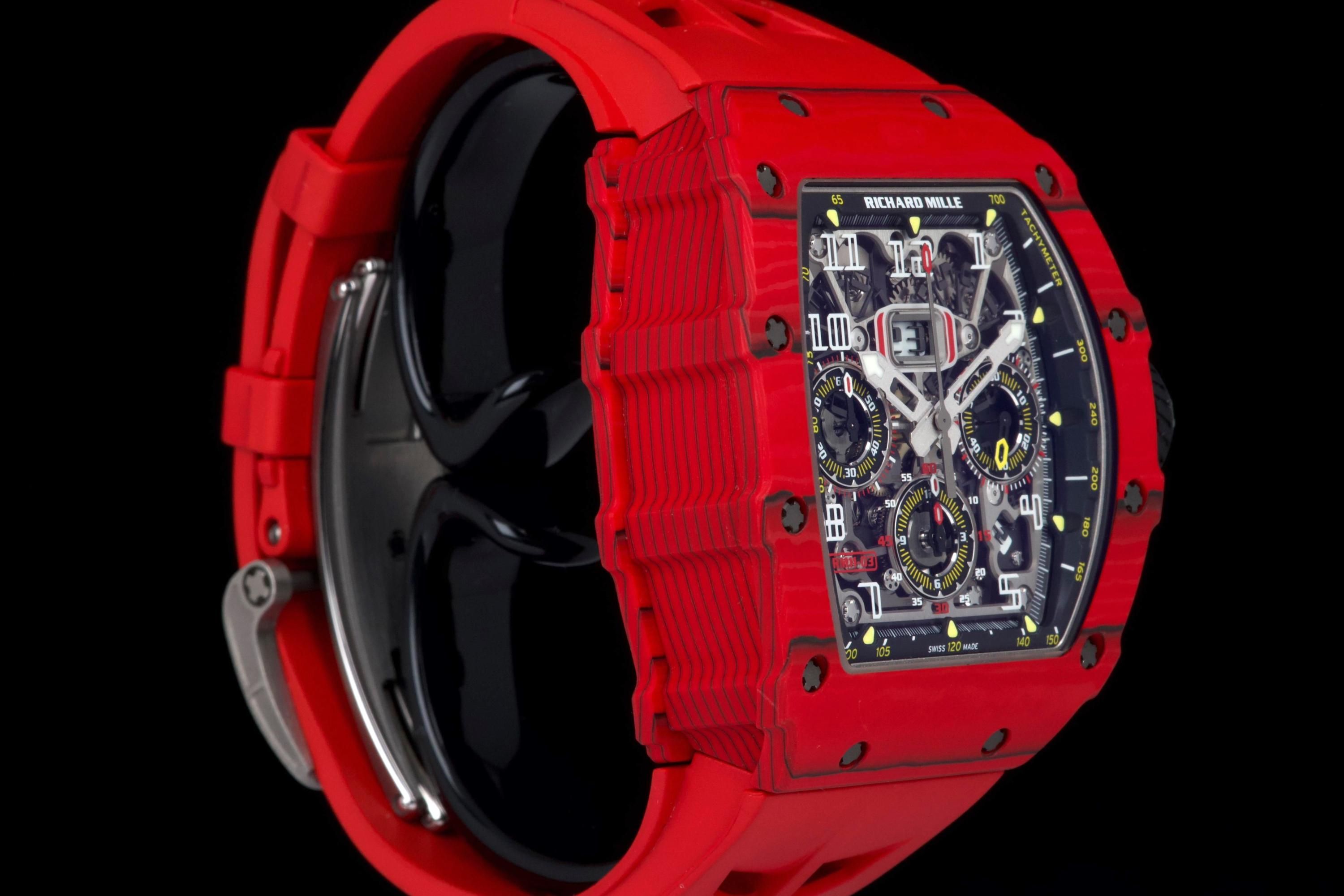 Presented here is a striking and highly technical example of the Richard Mille RM 11-03 Flyback Chronograph, crafted in red and black NTPT (North Thin Ply Technology). This advanced composite material, developed for extreme performance applications, offers exceptional strength, lightness, and a uniquely layered aesthetic, making each case visually distinctive. This example dates to 2020 and is offered as a full set with its original box, papers, and accessories. Presented in like-new condition, the watch shows virtually no signs of wear. The RM 11-03 features a highly skeletonized dial showcasing its complex flyback chronograph movement, combining cutting-edge engineering with unmistakable Richard Mille design language. A bold and highly contemporary timepiece, this RM 11-03 represents an excellent opportunity to acquire a technically advanced and visually striking Richard Mille in outstanding condition, appealing to collectors of modern high-performance horology.