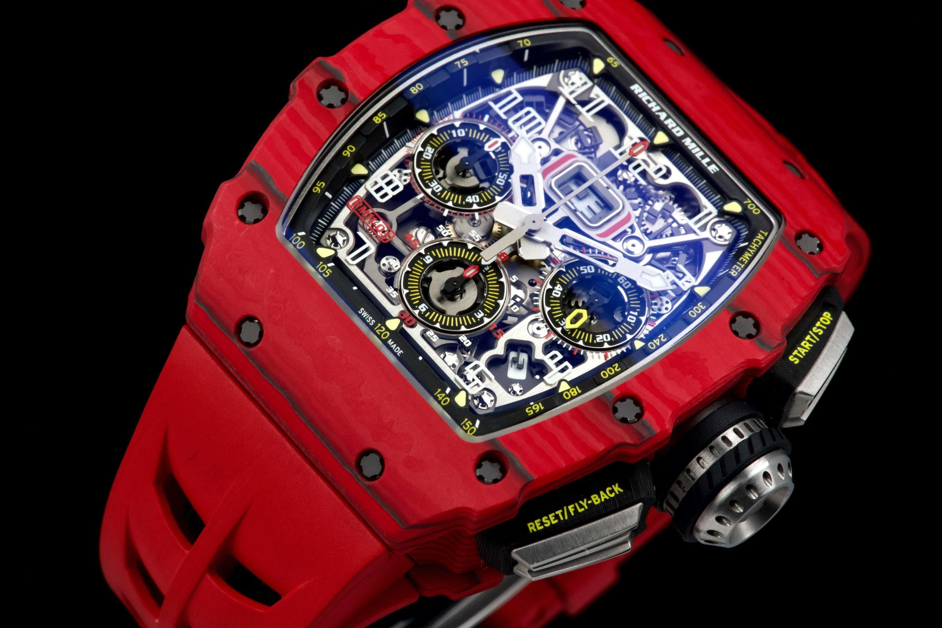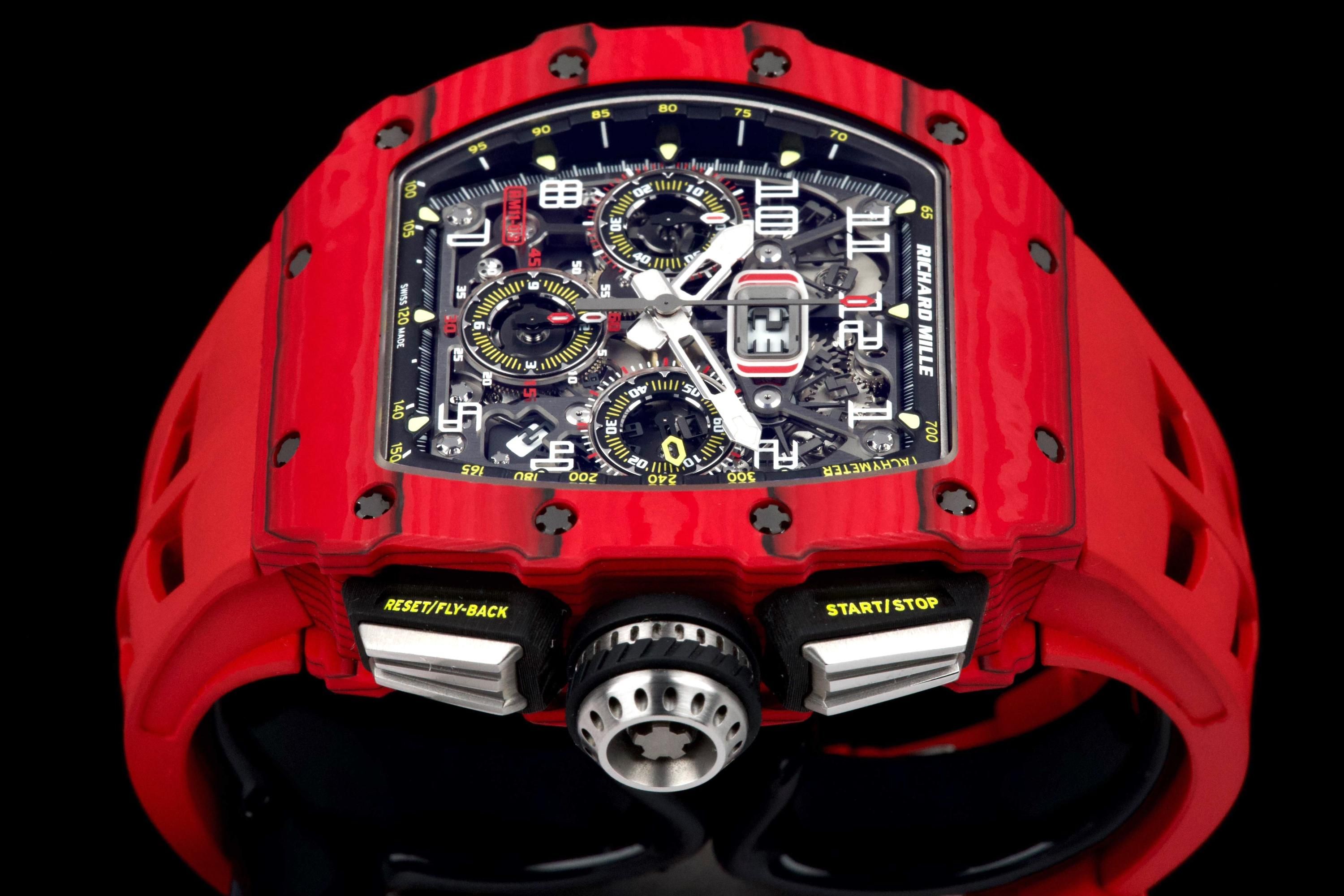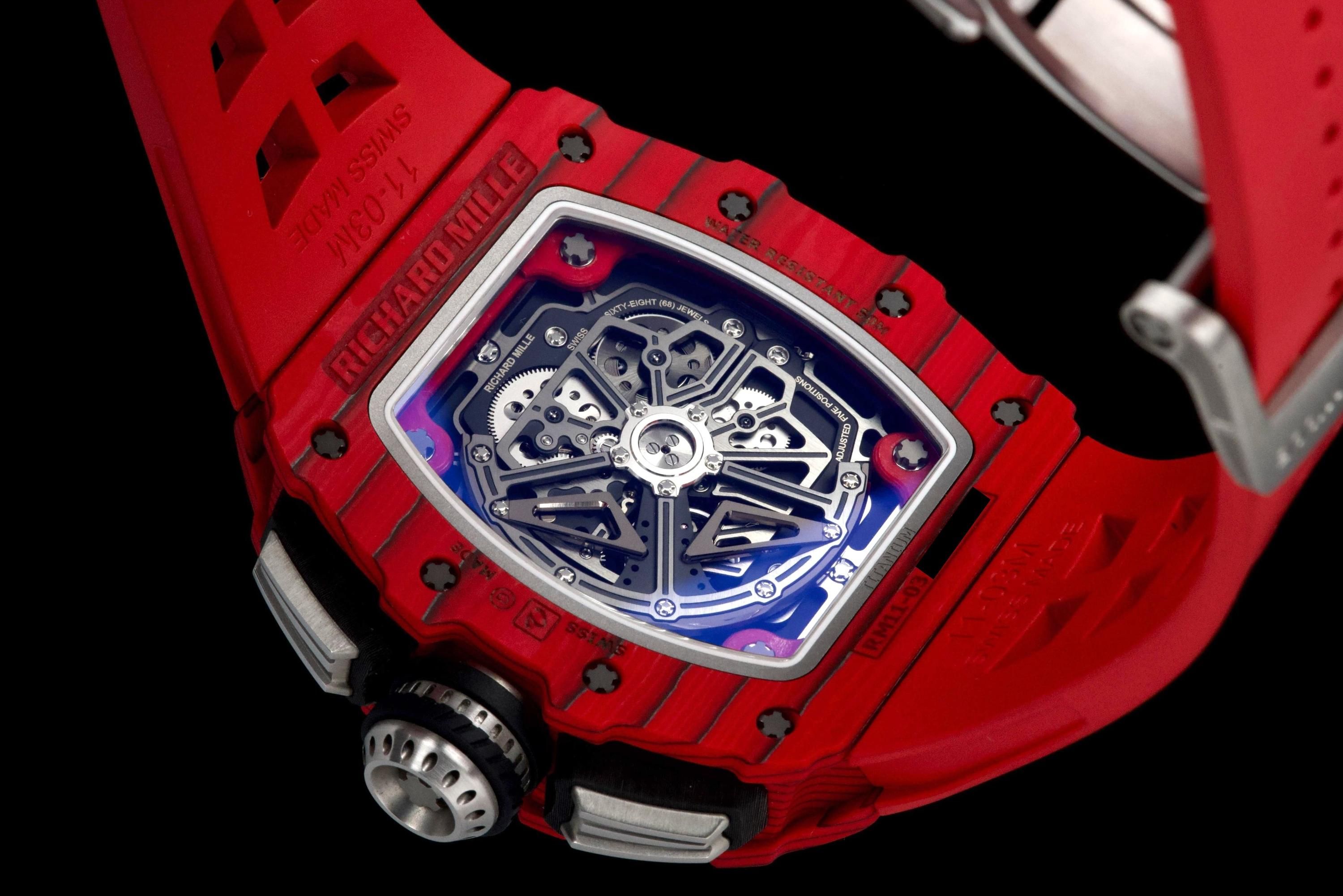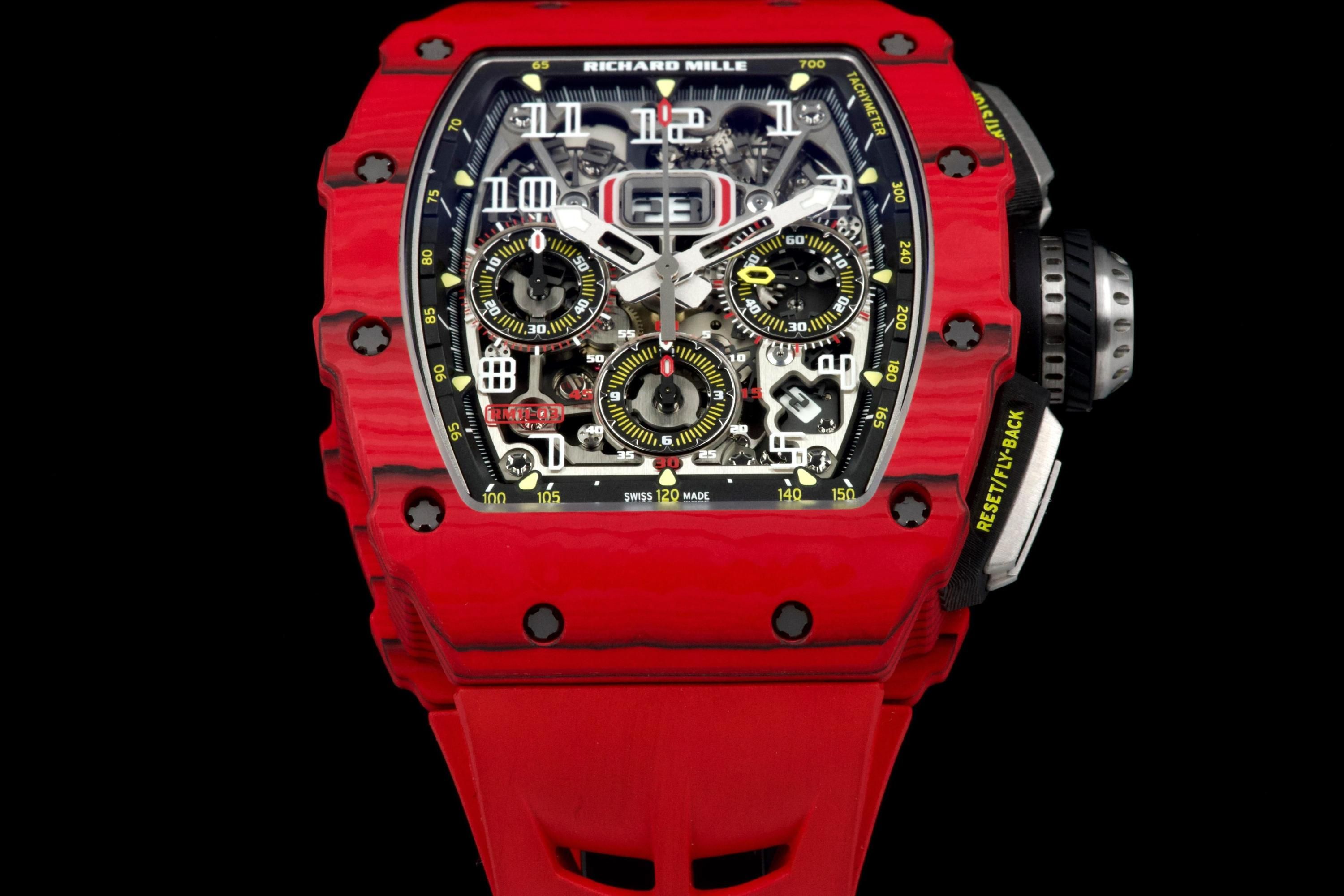 Presented here is a striking and highly technical example of the Richard Mille RM 11-03 Flyback Chronograph, crafted in red and black NTPT (North Thin Ply Technology). This advanced composite material, developed for extreme performance applications, offers exceptional strength, lightness, and a uniquely layered aesthetic, making each case visually distinctive. This example dates to 2020 and is offered as a full set with its original box, papers, and accessories. Presented in like-new condition, the watch shows virtually no signs of wear. The RM 11-03 features a highly skeletonized dial showcasing its complex flyback chronograph movement, combining cutting-edge engineering with unmistakable Richard Mille design language. A bold and highly contemporary timepiece, this RM 11-03 represents an excellent opportunity to acquire a technically advanced and visually striking Richard Mille in outstanding condition, appealing to collectors of modern high-performance horology.