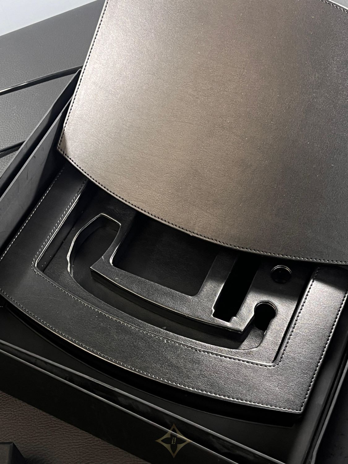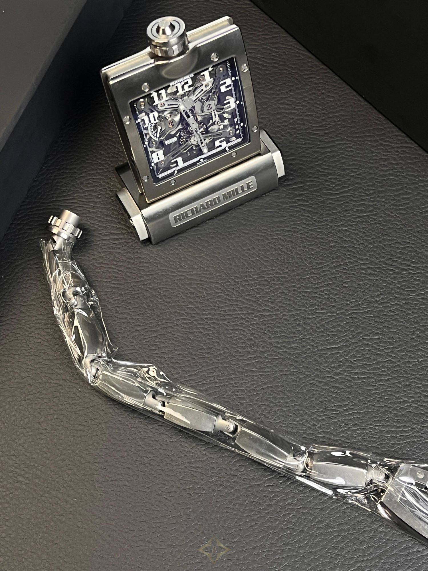 Rectangular case, bezel in 18k white gold, brushed, fixed on 8 screws, caseband in titanium, brushed, exhibition caseback in 18k white gold fixed on 8 screws with 'Richard Mille logo, ‘RM 020’ and case number engraved, dynamometric winding crown at 4 o’clock with the cap and chain attachment in titanium