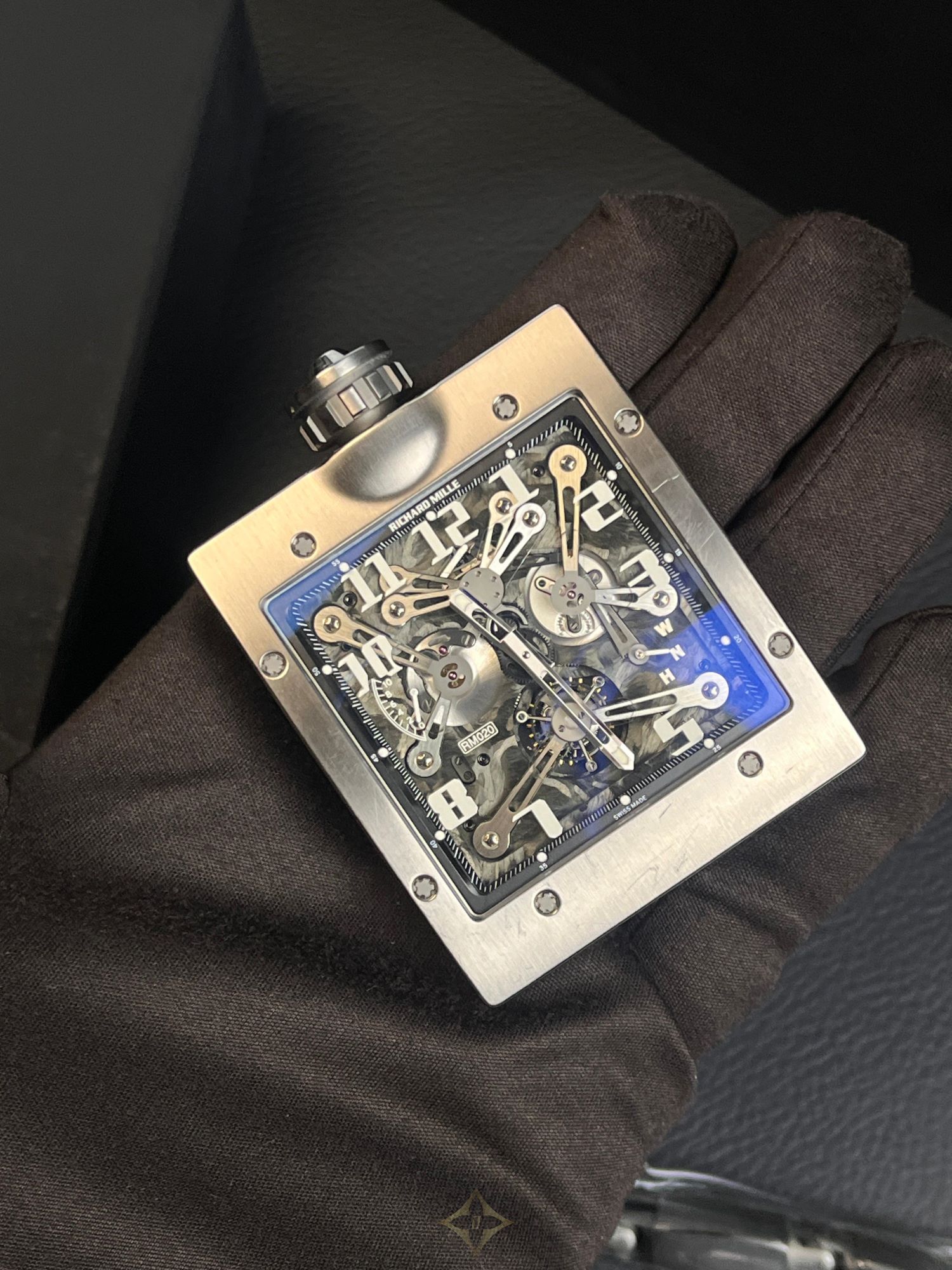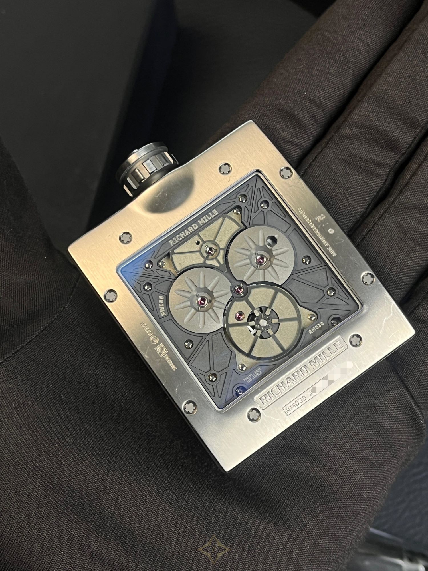 Dial Open-worked dial signed ‘Richard Mille’ and ‘RM020’, white Arabic numerals, open-worked and luminous ‘obelisk’ hour and minute hands, outer minute track with luminous dots in 5-minute positions, power reserve indicator at 9 o’clock, winding crown function indicator at 4 o’clock
