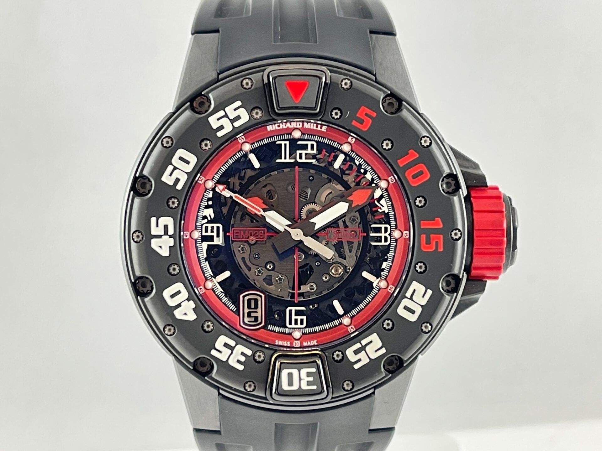 This watch is composed of a three-piece DLC titanium case, measuring 47 mm in width and 14.6 mm in thickness. The rotating bezel is formed by three layers that are connected with 22 eight-point-star-shaped screws which means that the bezel cannot be dislocated by impact. It is sturdy and very functional with white and red Arabic numerals that contrast very nicely with the dark finish of the case and the open-worked dial. One of the unique features of this bezel is its double-push button security mechanism that allows the user to rotate the bezel only if both the 30-minute and red arrow raised buttons are pressed simultaneously while rotating the bezel in a counterclockwise direction. The carbon fiber flange around the dial is red and the hands are in a combination of white and red creating the perfect balance.The RM028 is truly a diver’s watch as it complies with all the norms set by the ISO 6425 for diving watches. Waterproof to a depth rating of 300m/1000ft, this watch is the perfect companion for your next underwater adventure.