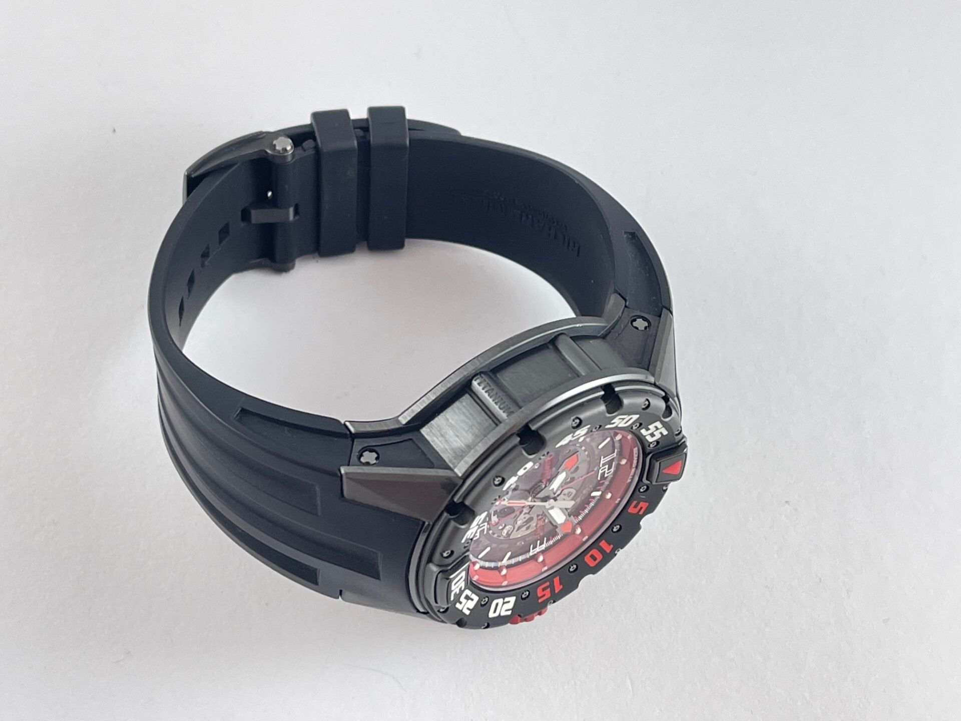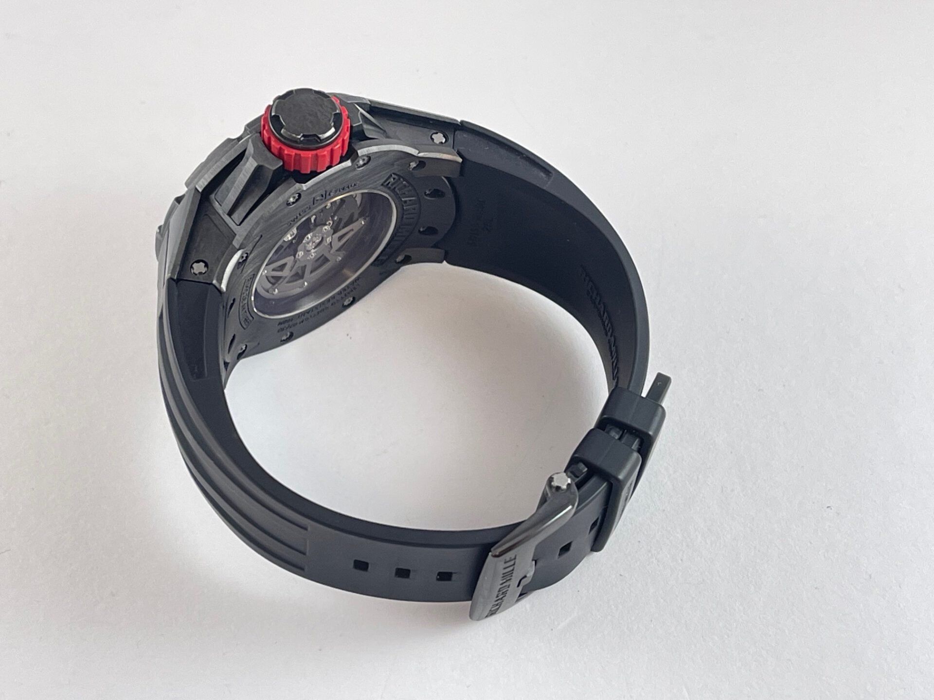 Just as required on any diver’s watch complying with ISO 6425 norms, the watch is fitted with a screw-down over-sized crown that is very easy to unscrew with or without gloves. The crown is made of titanium and comes with a red rubber middle ring for protection.The sapphire crystal on the watch has an anti-reflective coating on both sides that provides the perfect clarity for good readability inside and outside of the water. The rubber strap is soft and comfortable and it’s fitted with a titanium tang buckle with the Richard Mille name on it. The watch comes with a display case back allowing for a full view of the gorgeous skeletonized automatic calibre RMAS7 with adjustable rotor geometry. The calibre has a power-reserve of approximately 55 hours and according to Richard Mille, the exclusive design of the calibre allows the rewinding of the mainspring to adapt to the user’s activity level.