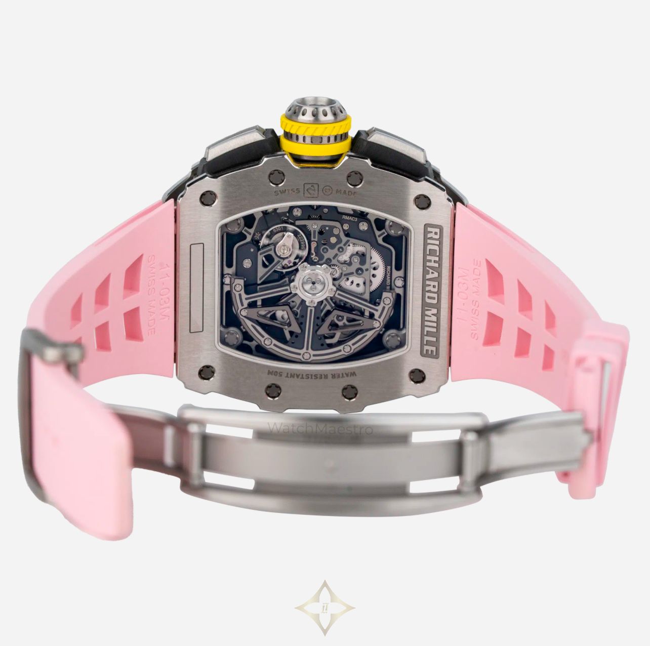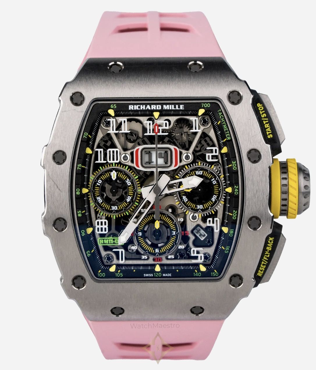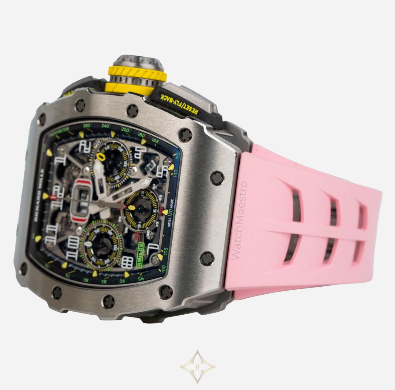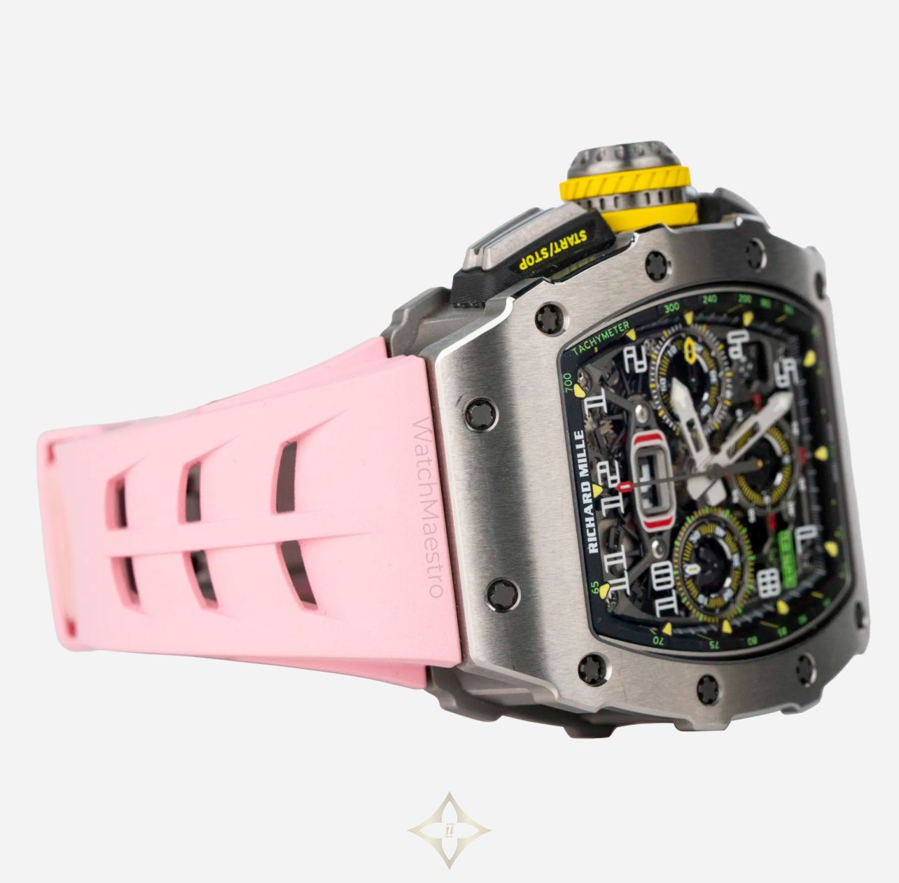 WatchMaestro presents you with the bold and stunning Richard Mille RM 11-03 in Titanium. This striking timepiece features a Skeleton Dial with Bold Numerals, providing a captivating view of its intricate mechanical movement. Crafted in Titanium, the RM 11-03 is paired with a vibrant Pink Rubber Strap, that will surely bring people’s attention towards your wrist. Its Automatic Flyback Chronograph function ensures precision and performance, making it a standout in both style and functionality. Originally purchased in 2020, the watch is presented in pre-owned, good condition. This exceptional watch comes complete with its original box and papers, ensuring its authenticity and provenance.