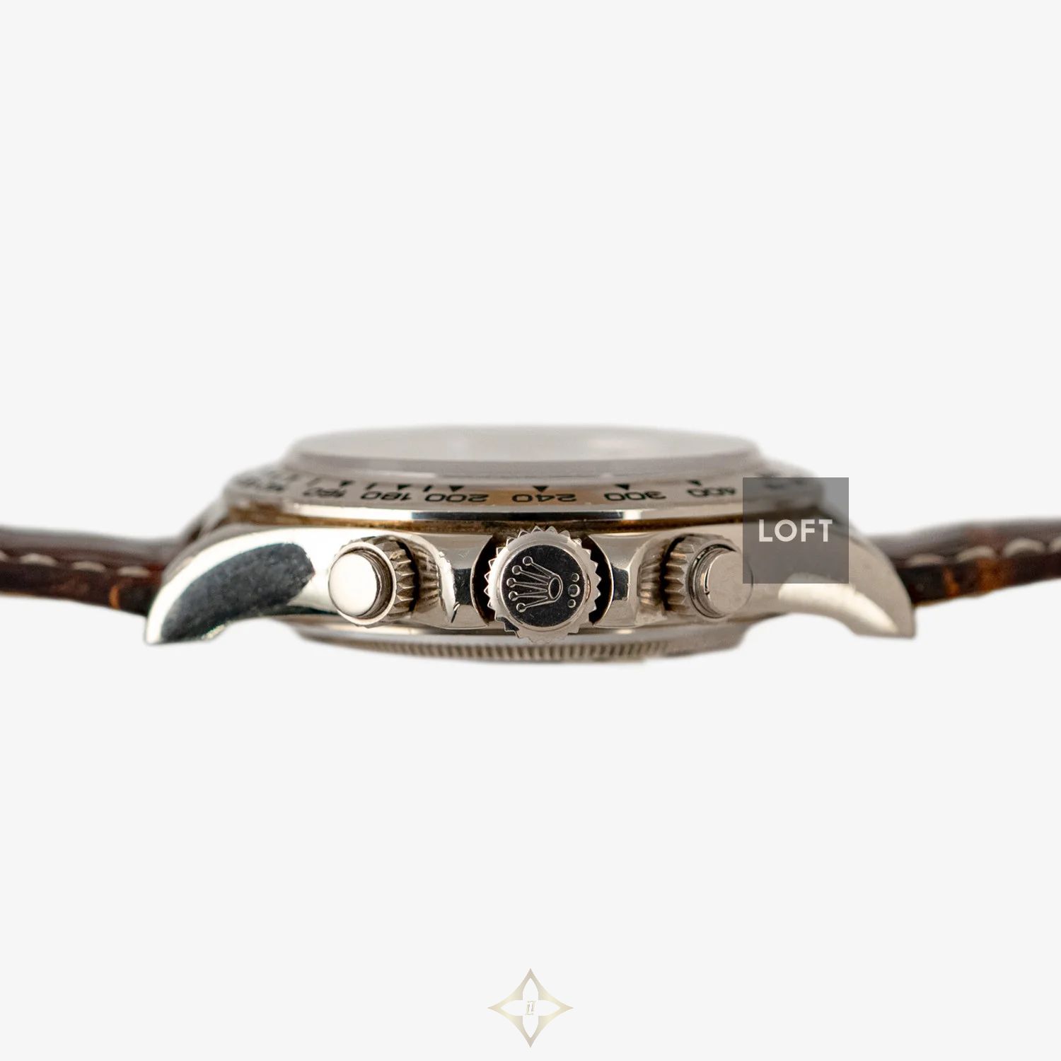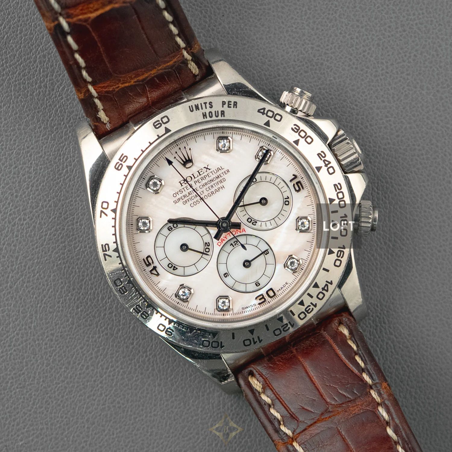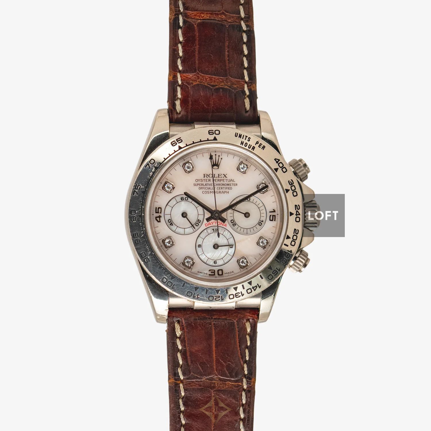 Welcome to absolute elegance and distinction with the Rolex Cosmograph Daytona Ref. 16159 in white gold and diamonds. This exceptional timepiece, launched in 1999, is a timeless jewel that perfectly combines Swiss craftsmanship with exquisite design and premium materials. With its 40 mm white gold case, this piece embodies unparalleled sophistication and luxury. Diamonds adorning the mother-of-pearl dial as hour markers add a touch of sparkle and opulence, drawing all eyes to its dazzling dial. Every detail of the watch has been carefully crafted to reflect watchmaking excellence. What makes this Rolex even more exceptional is its caliber 4030, a high-performance mechanical chronograph movement. The caliber 4030 is a variant of the famous Zenith El Primero caliber, which Rolex modified and improved to suit its high quality standards. This partnership between Rolex and Zenith resulted in an exceptionally precise and reliable movement that powers the Cosmograph Daytona's timekeeping functions. The chronograph function of the caliber 4030 allows for precise measurement of time intervals, making it an indispensable tool for those who value precision and accuracy in their daily activities or in sporting competitions. The soft, comfortable brown leather strap adds a touch of elegance and versatility to the watch. Whether formal or casual, the Daytona 16159 adapts easily to any style and occasion, becoming a natural extension of your personality. In addition to its stunning appearance and high-quality movement, this Rolex is an investment that will last a lifetime. The Rolex brand has been synonymous with prestige and quality for decades, and this particular model, with its unique combination of white gold, mother-of-pearl dial, and diamond indexes, is a coveted treasure for collectors and connoisseurs of high-end watches.