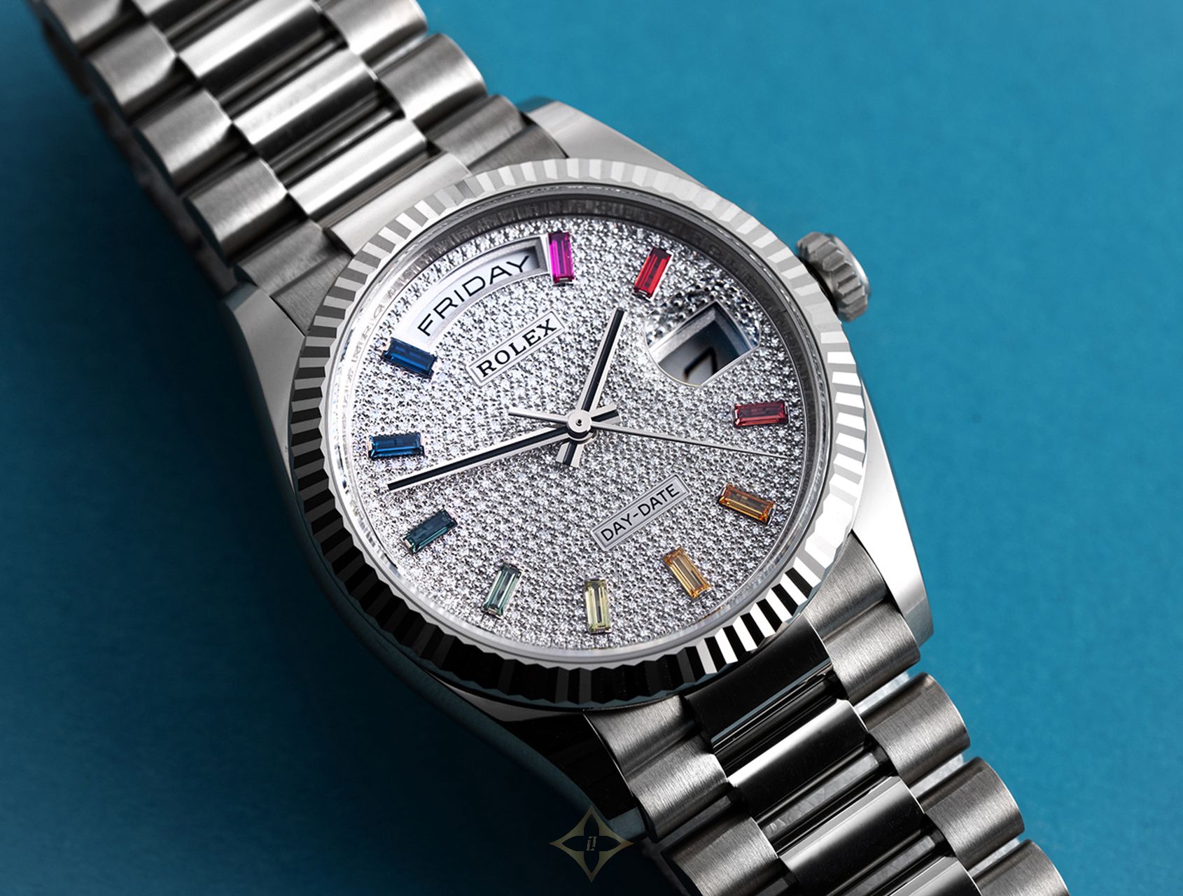 The brilliant diamond-encrusted dial features 10 baguette-cut, rainbow-coloured sapphires that were expertly set by Rolex's master gem setters, with sleek Onyx hour and minute hands to enhance legibility. The traditional Day & Date apertures are at 12 & 3.