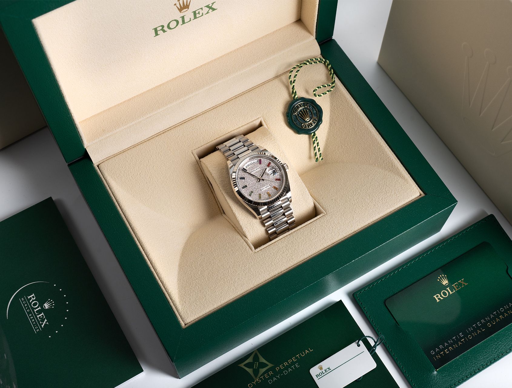 Introduced in 2019, this 18ct white gold Day-Date 36mm (ref. 128239) with hand-set rainbow pavé dial is widely considered a "unicorn" watch - offered only to Rolex’s most valued clients and produced in extremely limited quantities, making it ultra rare and highly coveted.