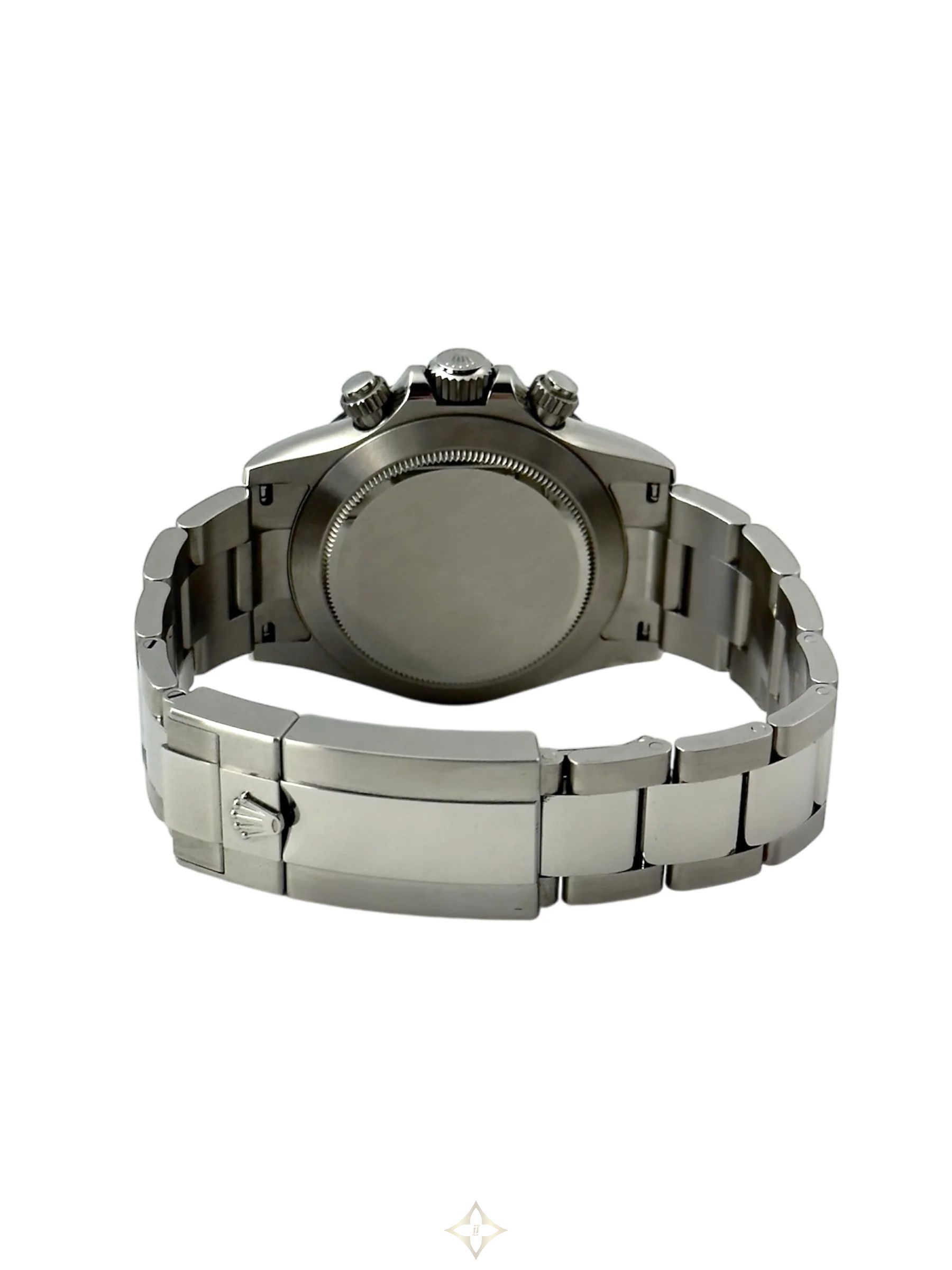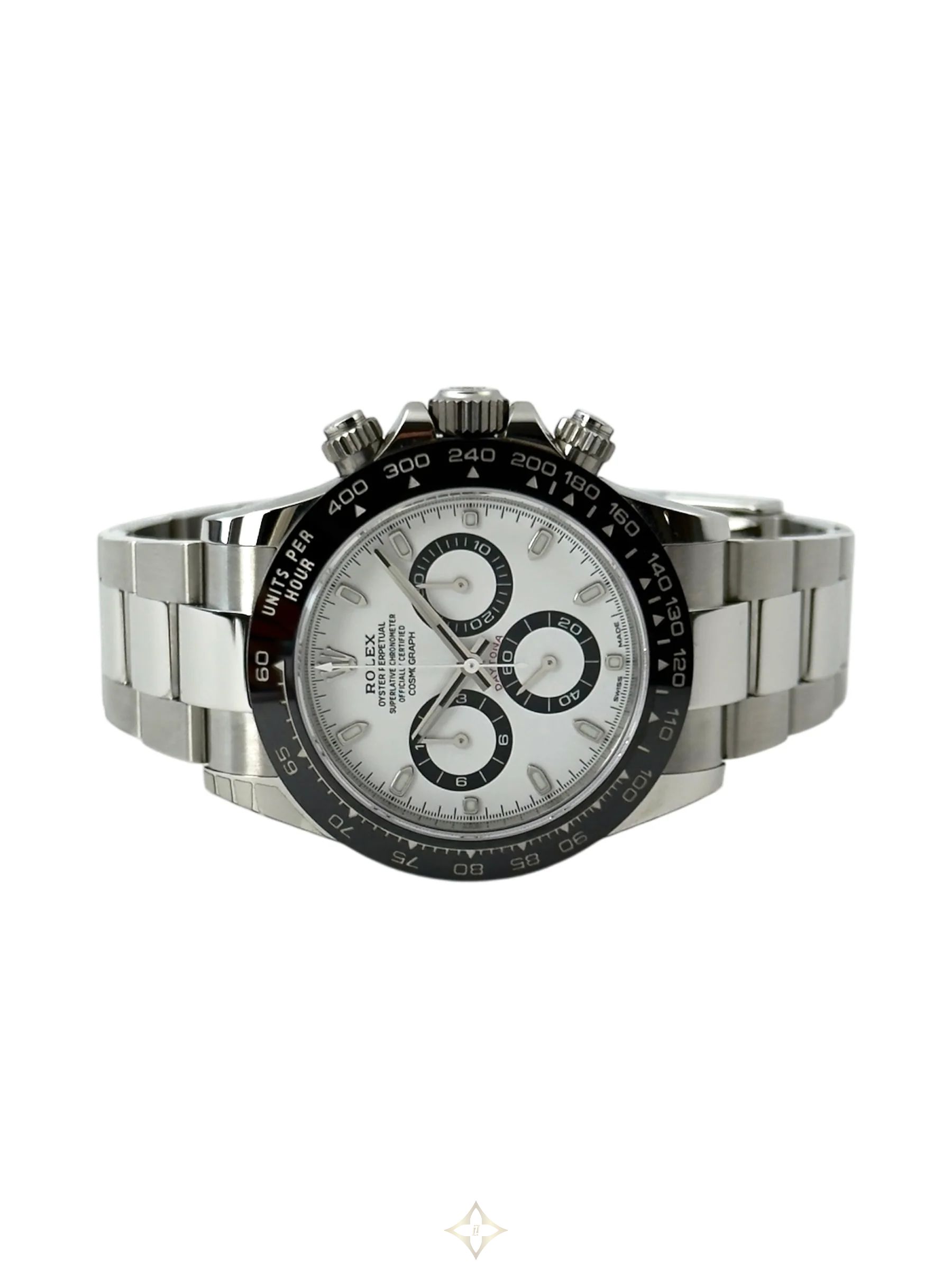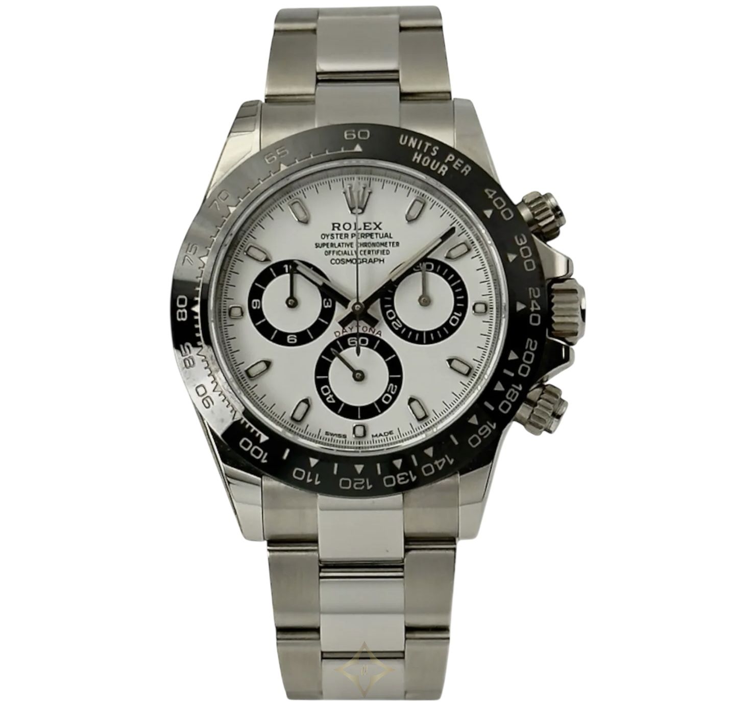 Rolex Daytona 116500LN Regular price: DKK 194.000 SKU: SPO6000445 Rolex Daytona 116500LN white dial (2019) in mint condition. The watch appears in perfect condition with no signs of wear. Comes as a full set: Boxes, certificate, manuals and whitetag. Description Rolex Daytona 116500LN with white dial – the ultimate chronograph in steel and ceramic The Rolex Cosmograph Daytona Ref. 116500LN with white dial is a modern classic that combines the legendary Daytona design with today's materials and innovations. Launched in 2016, it became an instant cult favorite - especially with its distinctive "Panda" configuration, where the black subdials create contrast on the white dial. This makes the model extra legible and adds a sporty yet elegant look that will appeal to collectors and first-time buyers alike. The 40mm Oystersteel case and black bezel give the watch a technical and timeless look. Inside, you'll find the reliable in-house caliber 4130, a self-winding chronograph movement with a 72-hour power reserve and COSC certification. A design icon with motorsport heritage With roots in 1960s racing and motorsports sponsorships, the Rolex Daytona has long been a favorite among speed enthusiasts. The white dial Ref. 116500LN harks back to the clean lines of the vintage models worn by legends like Paul Newman, but in a contemporary design that matches modern demands for durability and comfort. Specifications Brand: Rolex Model: Daytona Reference number: 116500LN Size: 40.0 Year: 2019 Material: Steel Movement: 4130 Certificate: Yes Box: Yes Stand: 10/10 Warranty: 1 year warranty ——— Staehr Preowned Grusbakken 14-16, 2820 Gentofte, Denmark Phone: +45 45 26 91 00 WhatsApp: +45 45 26 91 40 Email: info@staehrpreowned.com