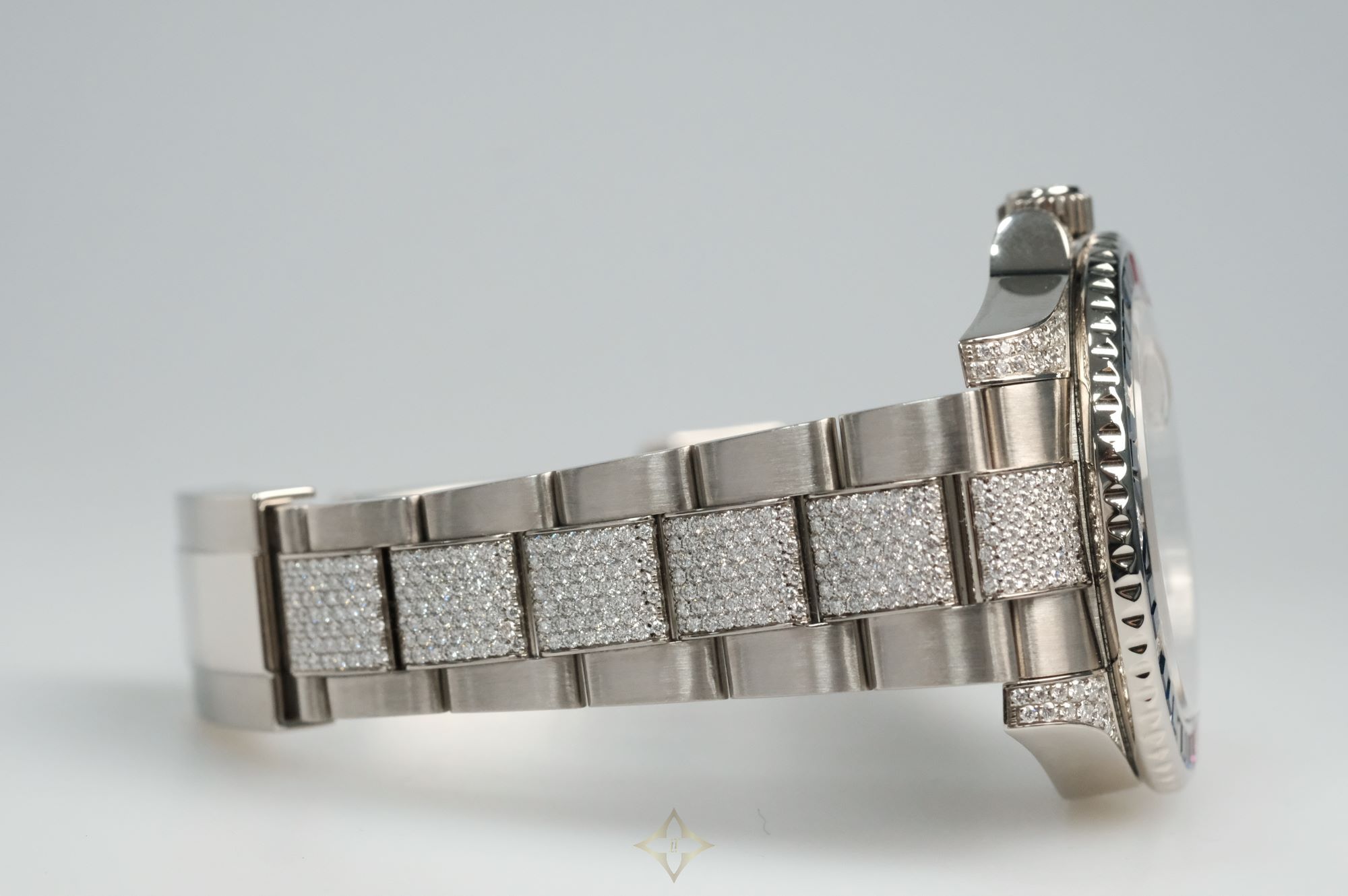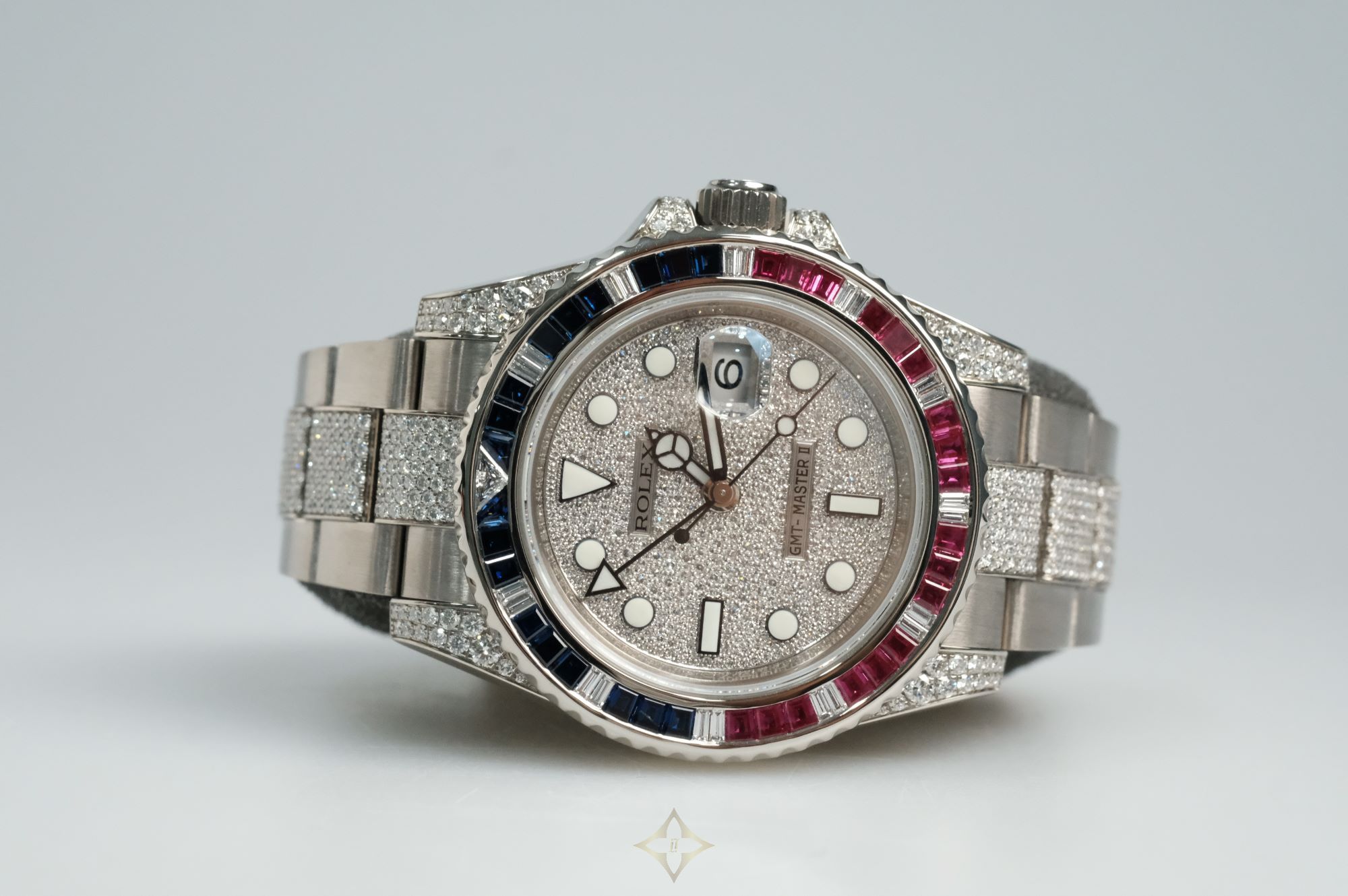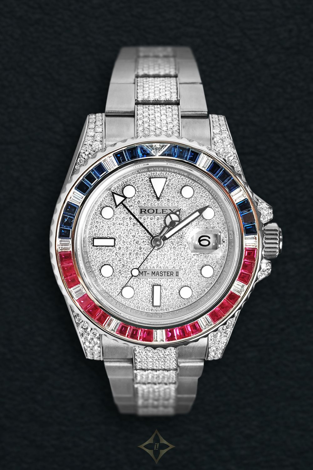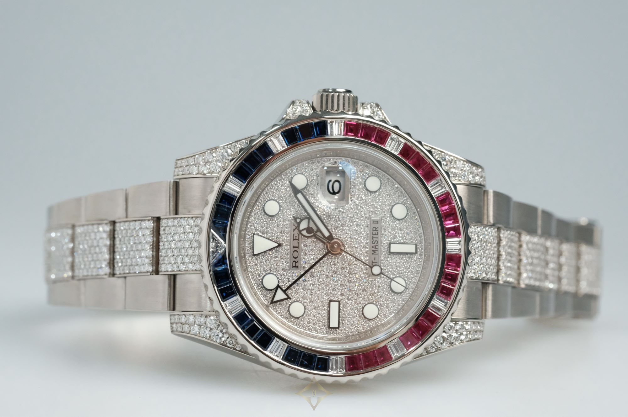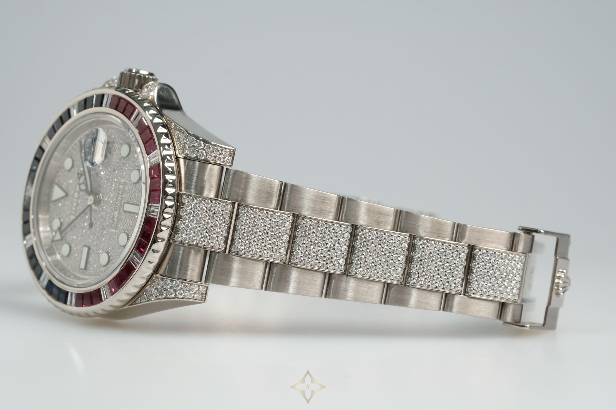 Case: White gold case with bi-directional rotatable black & red bezel with sapphire and ruby inserts, diamond lugs & screw-down crown at 3 o'clock