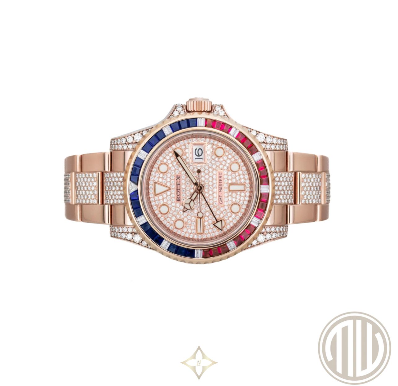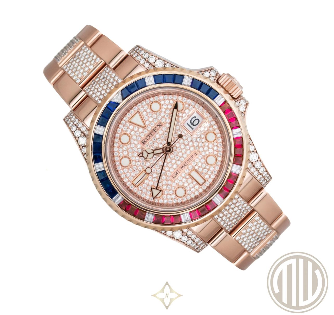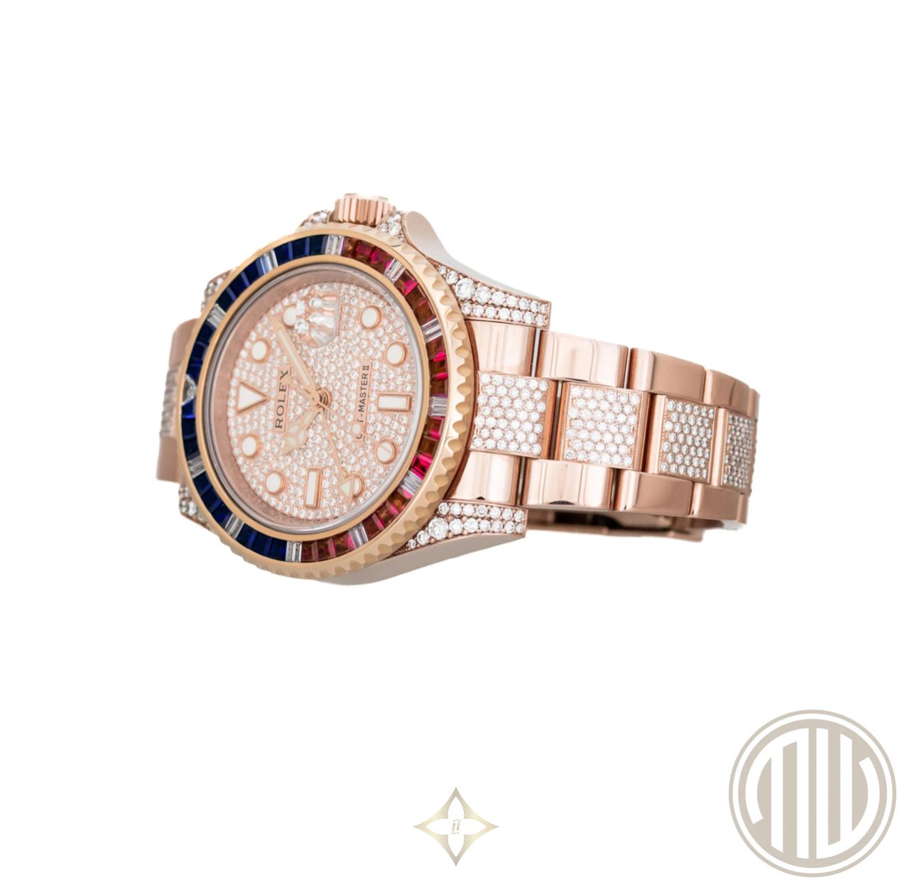 Rolex GMT-Master II / SARU BESATZ RIVER DE VVS | 126715CHNR PRICE; €79.500,00 Tax included Manufacturer: Rolex Model: GMT Master II Reference number: 126710CHNR Year: 2020 Material: 750 rose gold Box: Yes Papers: Yes Elevator: automatic Diameter: 40mm Rolex GMT Master 2 Ref: 126715CHNR 750 rose gold SARU trim Date of first purchase: 2020 Original case and strap and clasp were released in 2022 by a master jewel setter perceived to the highest perfection. Case: horns, crown guard Bezel: SARU OPTIK Band: central strip Closure: median strip Dial: Complete All of the finest brilliant cut diamonds were used processed in River D – E VVSI quality A total of 826 brilliant-cut diamonds totaling approx. 19.8 carats were processed. ——— Móric Watches Damenstiftstrasse 2 D-80331 Munich, Germany Tel: +49 89 260 11 640 Mobile / Whatsapp: +49 176 32 83 66 59 Email: info@mwatches.de